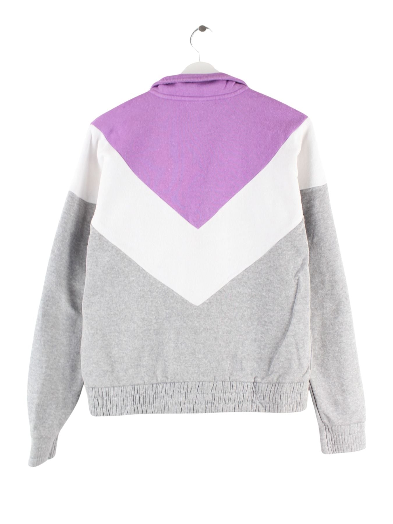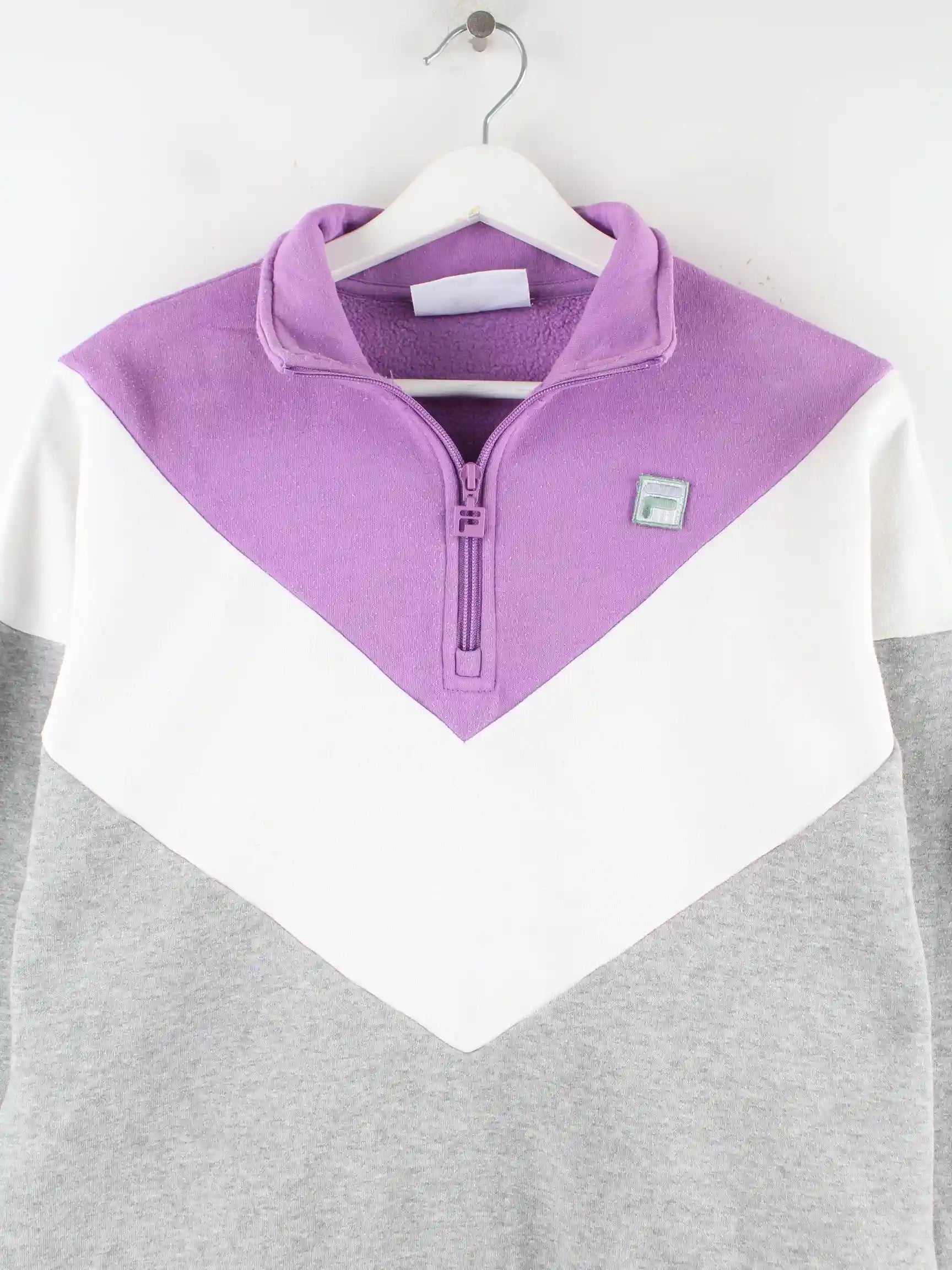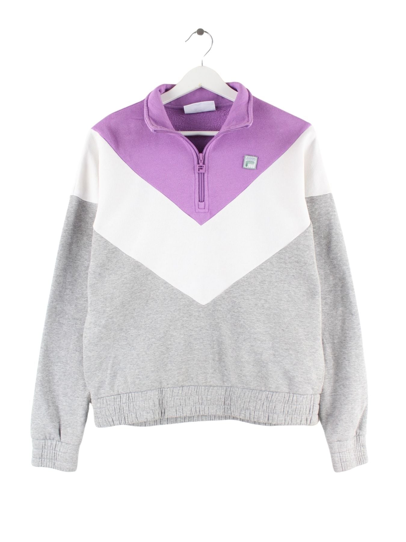 Mehrfarbiger Sweater mit kurzem Reißverschluß vom Label Fila in Größe S. Er ist aus einer Baumwollmischung gefertigt und in sehr gutem Zustand im Bestand.