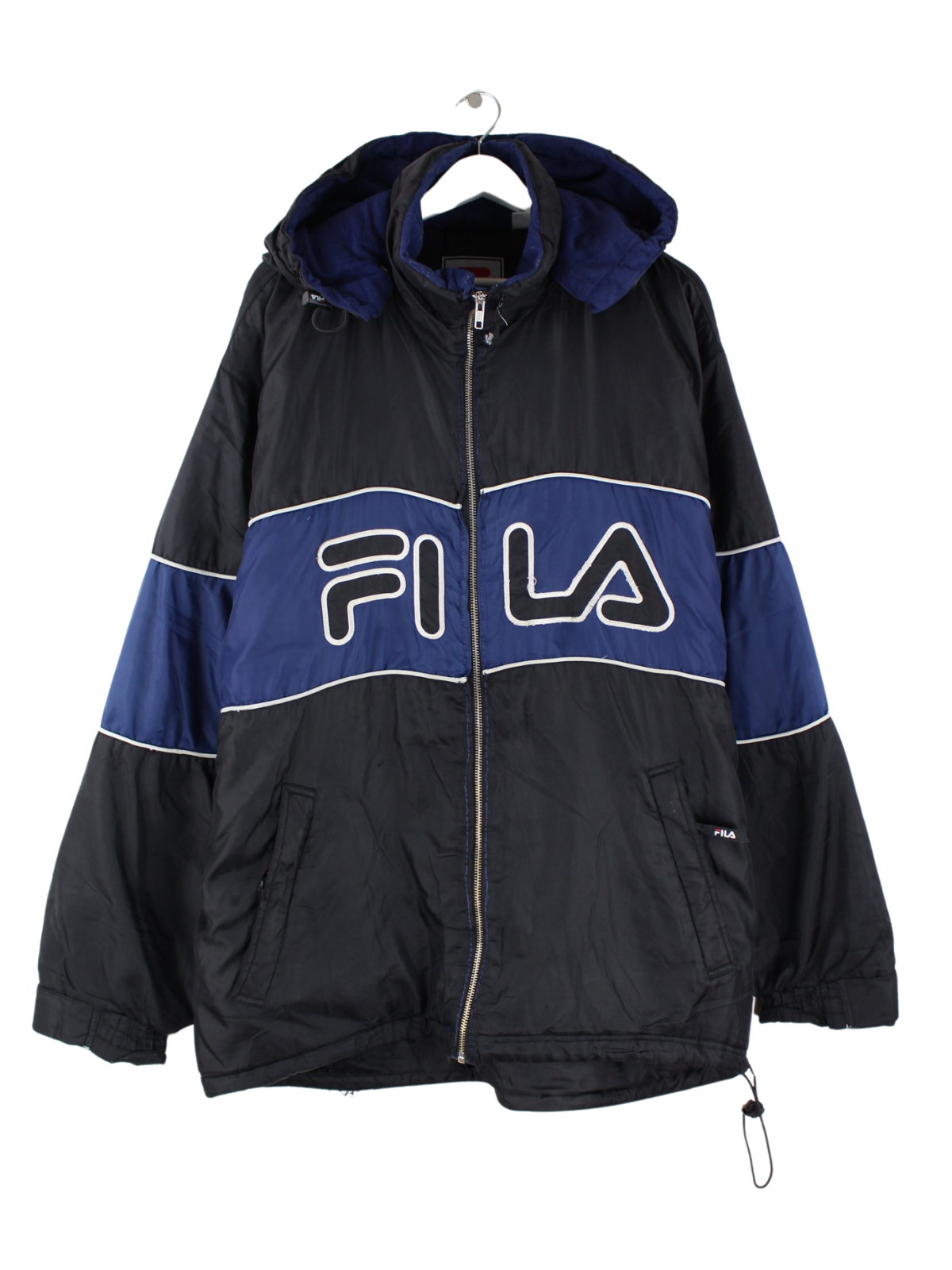 Schwarze Jacke mit gesticktem Logo der Brand Fila aus den 90'ern in Größe XL. Sie ist aus Synthetik hergestellt. Den Zustand würden wir als 'In Ordnung' bezeichnen (vergl. Bilder).