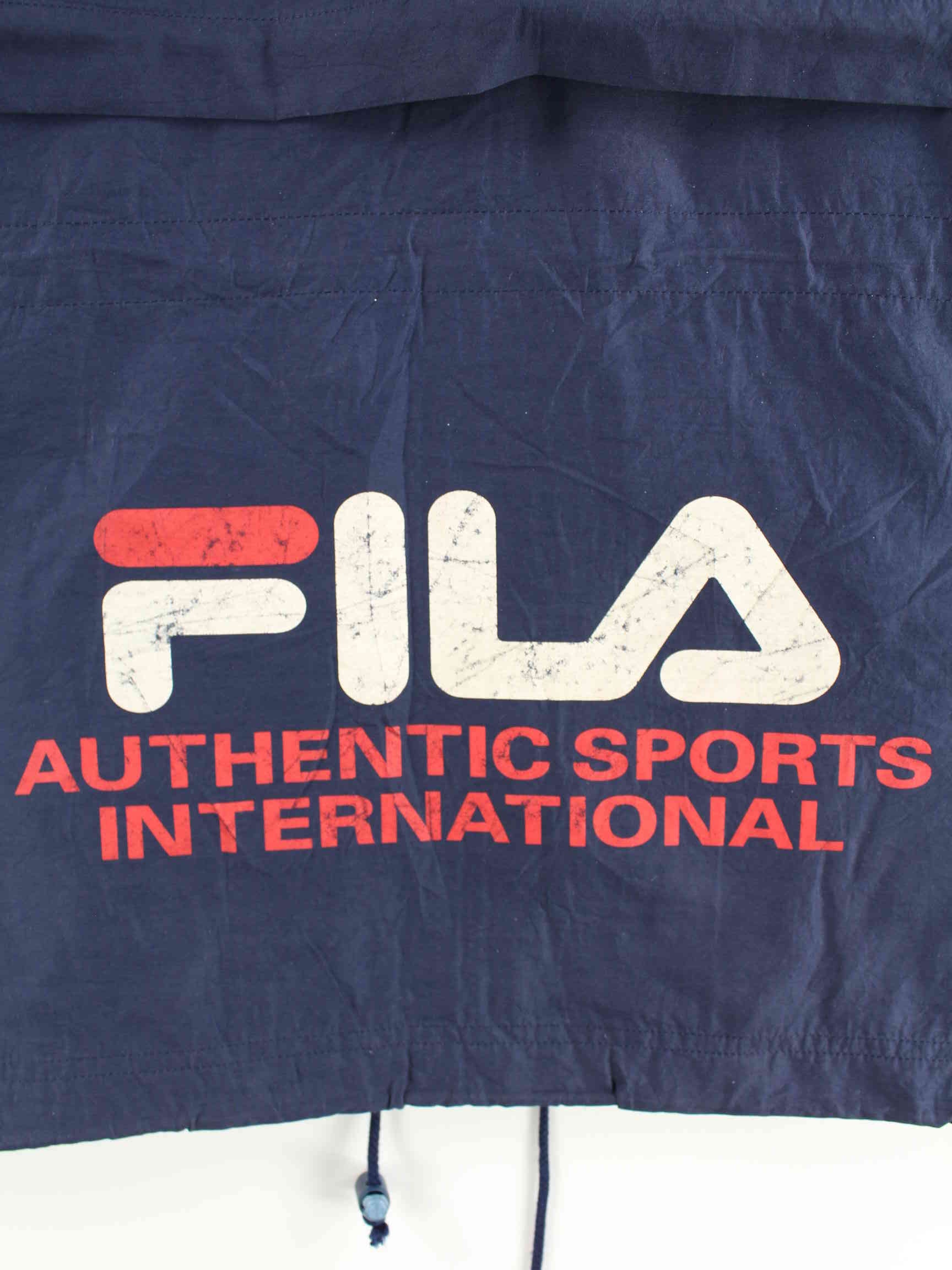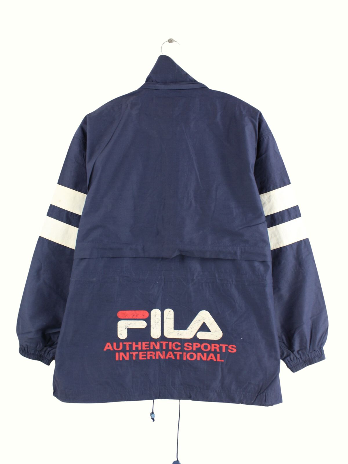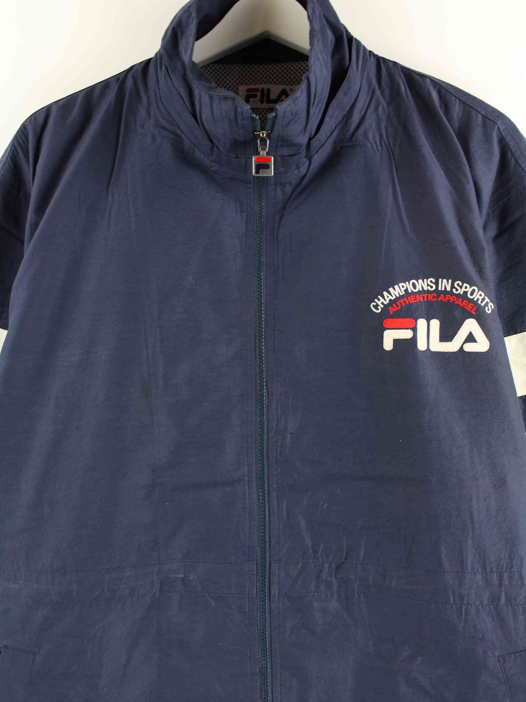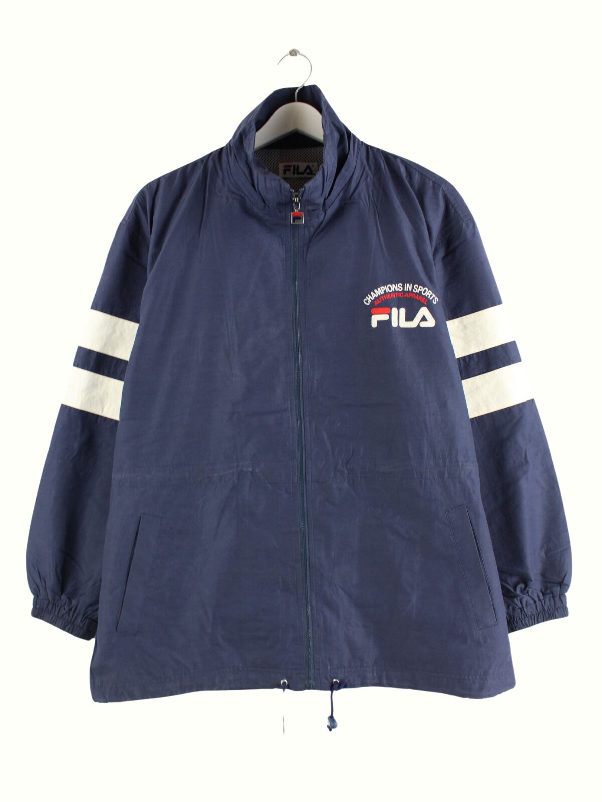 Training jacket from Fila with embroidered logo in size M from the 90s. It is made of synthetic and is available in blue.