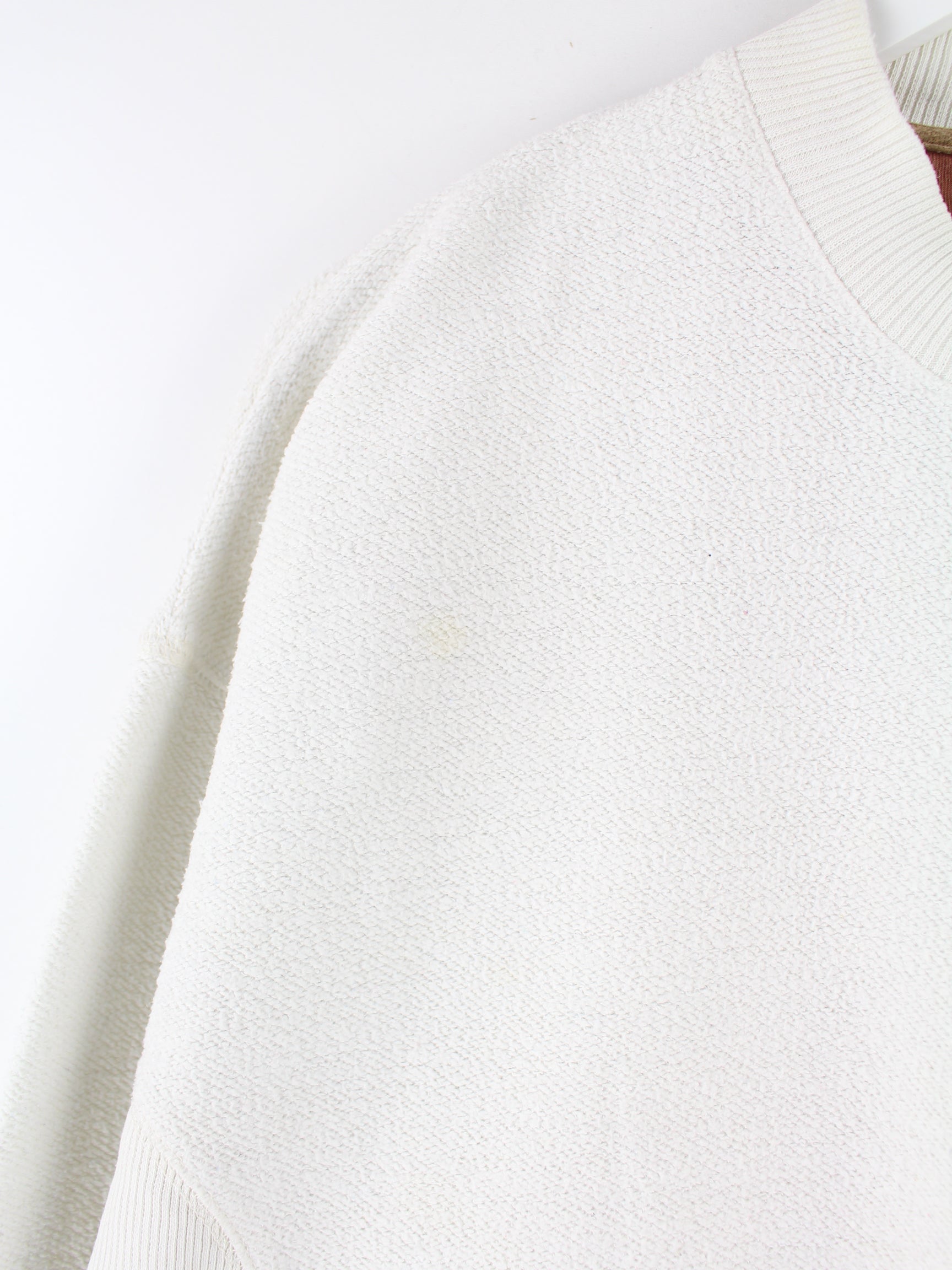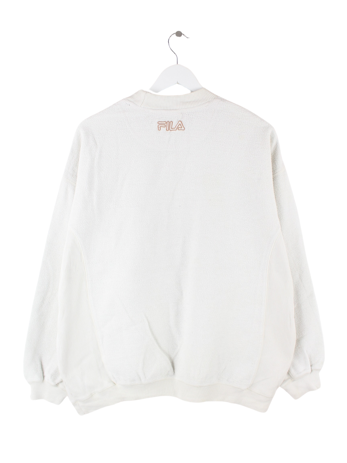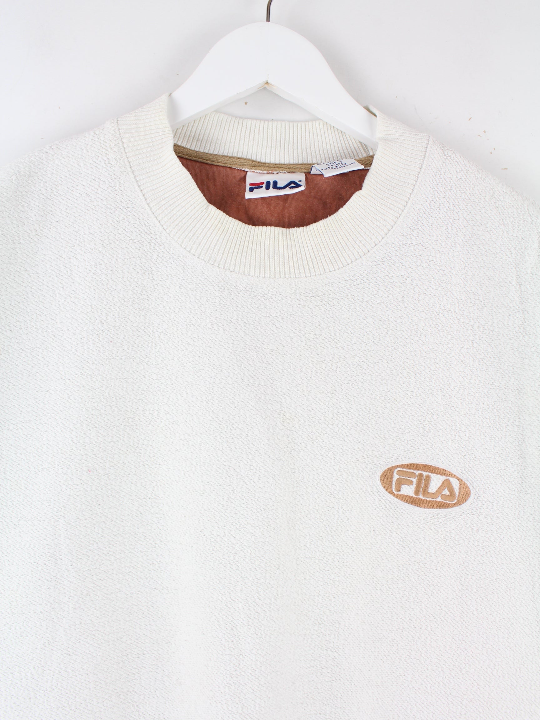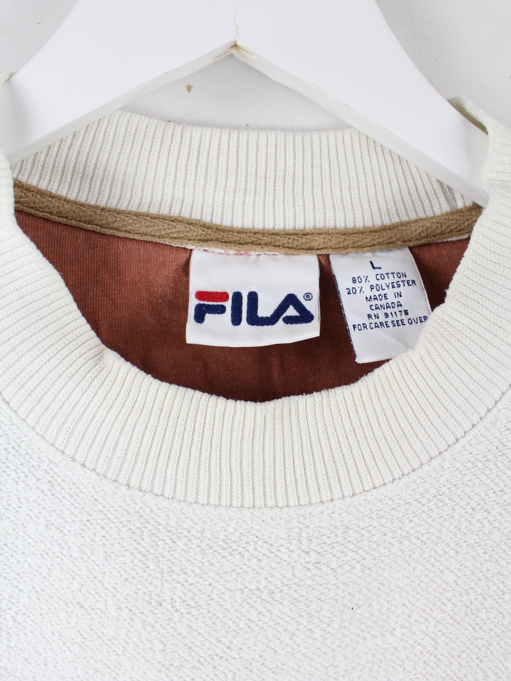 Beigefarbener Sweater der Marke Fila aus den 90'ern in Größe L. Er ist aus einer Baumwollmischung hergestellt. Den Zustand würden wir als 'In Ordnung' bezeichnen (vergl. Bilder).