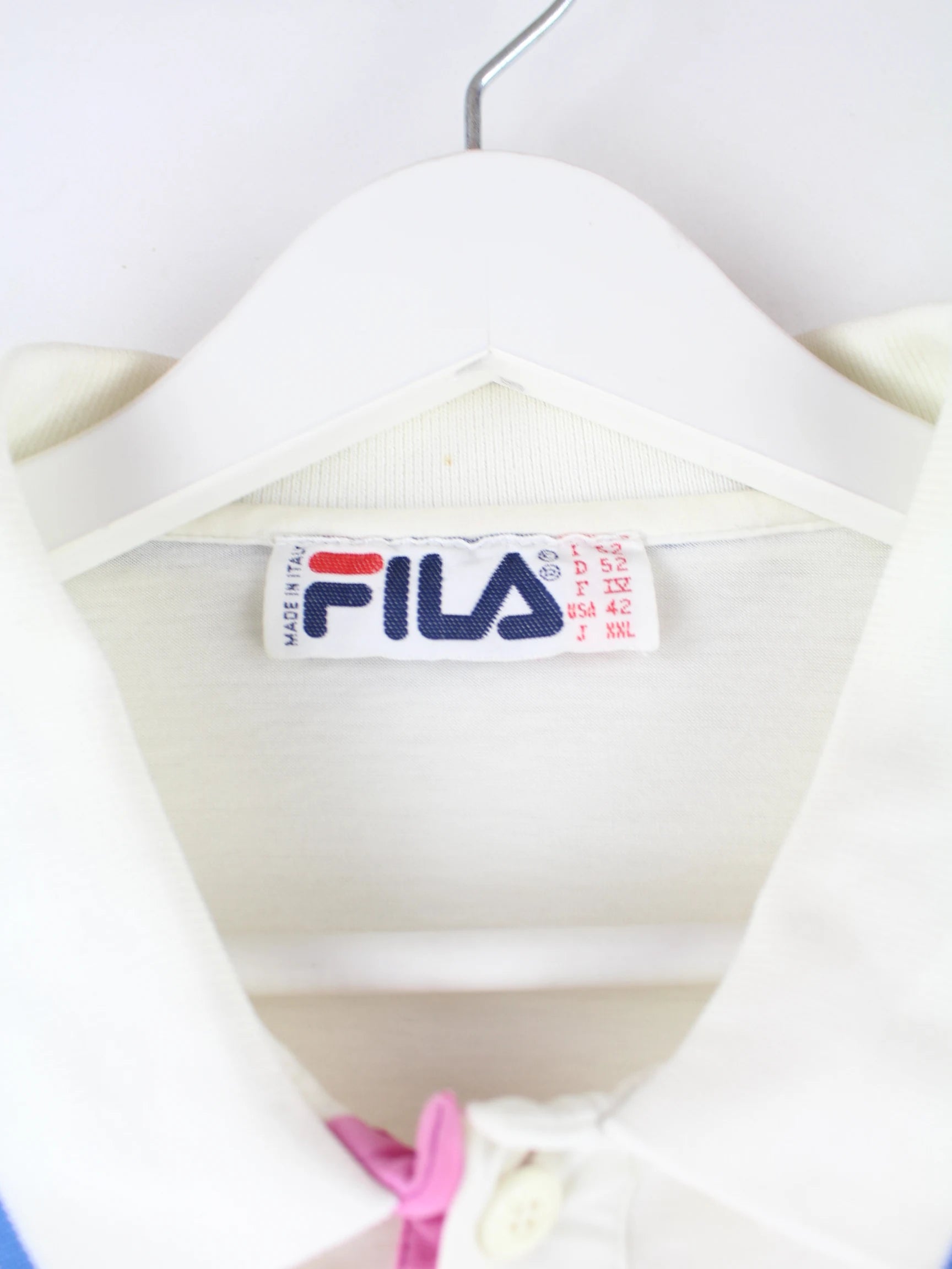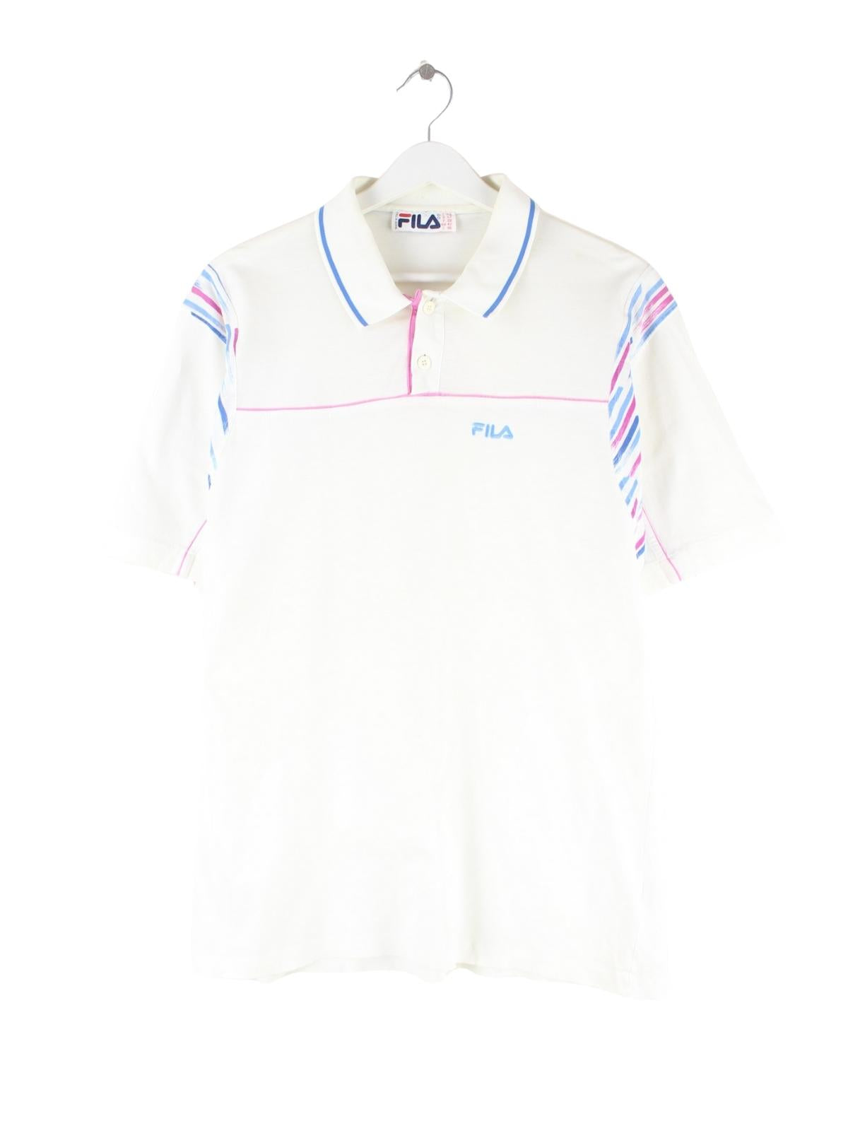 Poloshirt aus dem Hause Fila in Größe L aus den 90'ern. Es ist aus Baumwolle hergestellt und in Weiß bei uns zu bekommen.