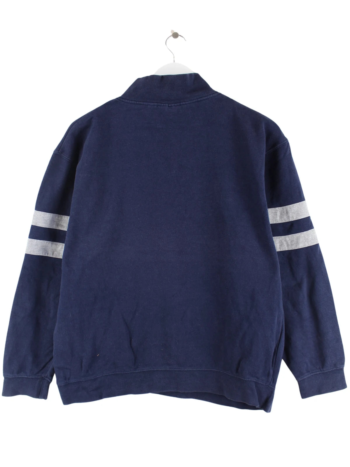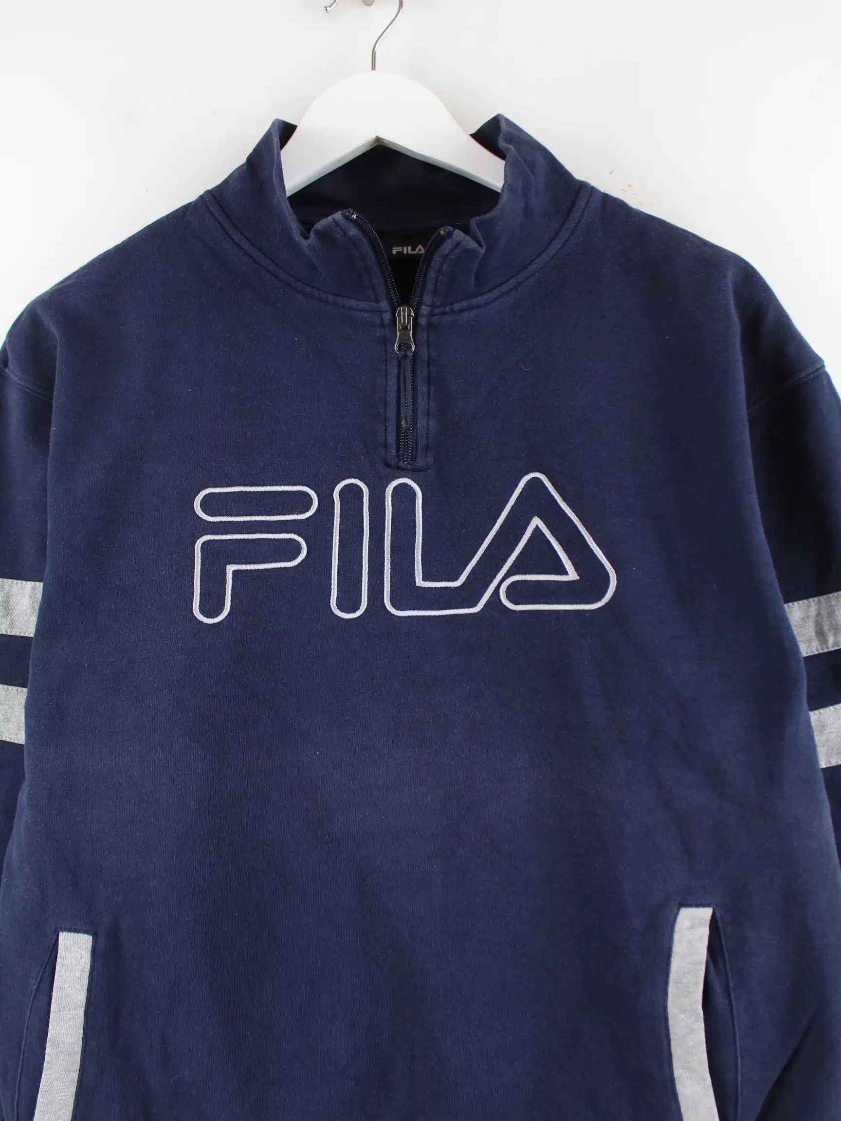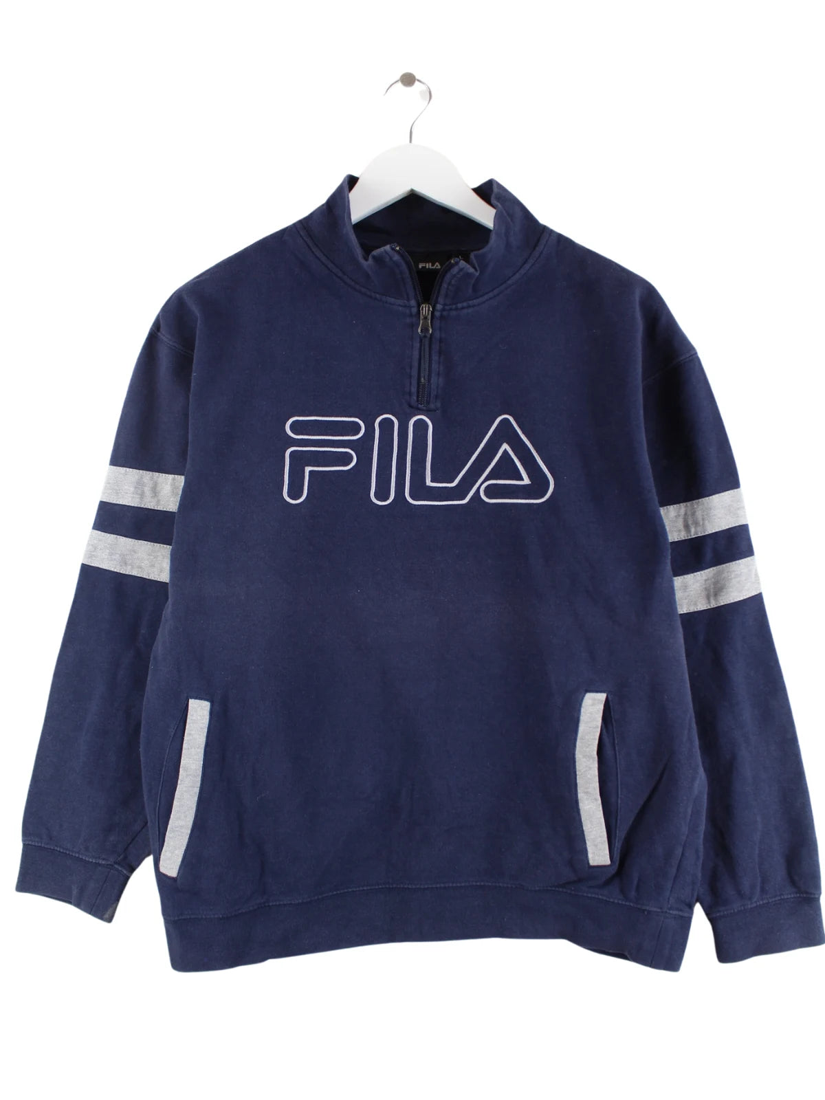 Sweater vom Label Fila mit gestickten Motiven und kurzem Reißverschluß in Größe L. Er ist aus einer Baumwollmischung angefertigt und in Blau zu bekommen.