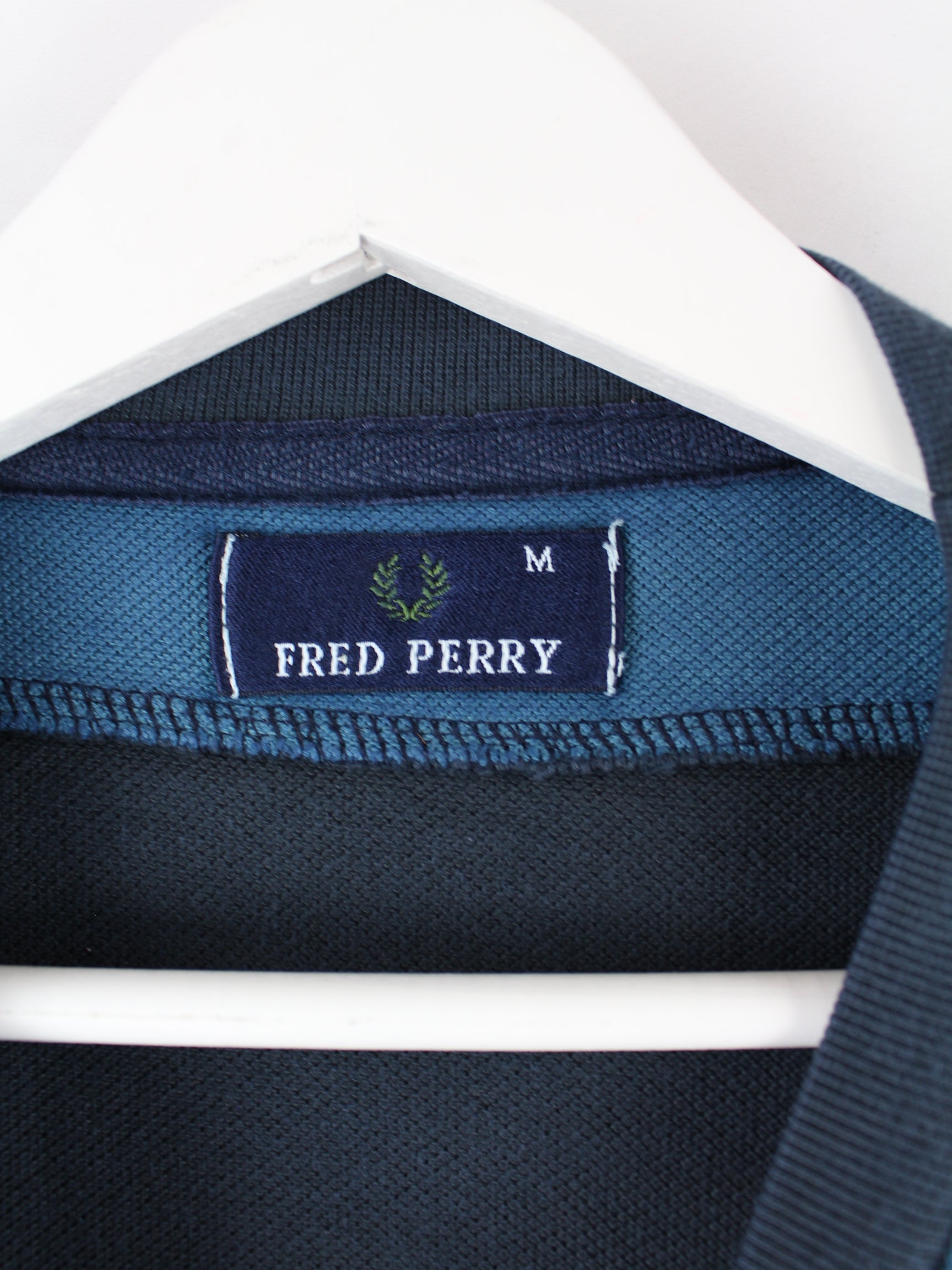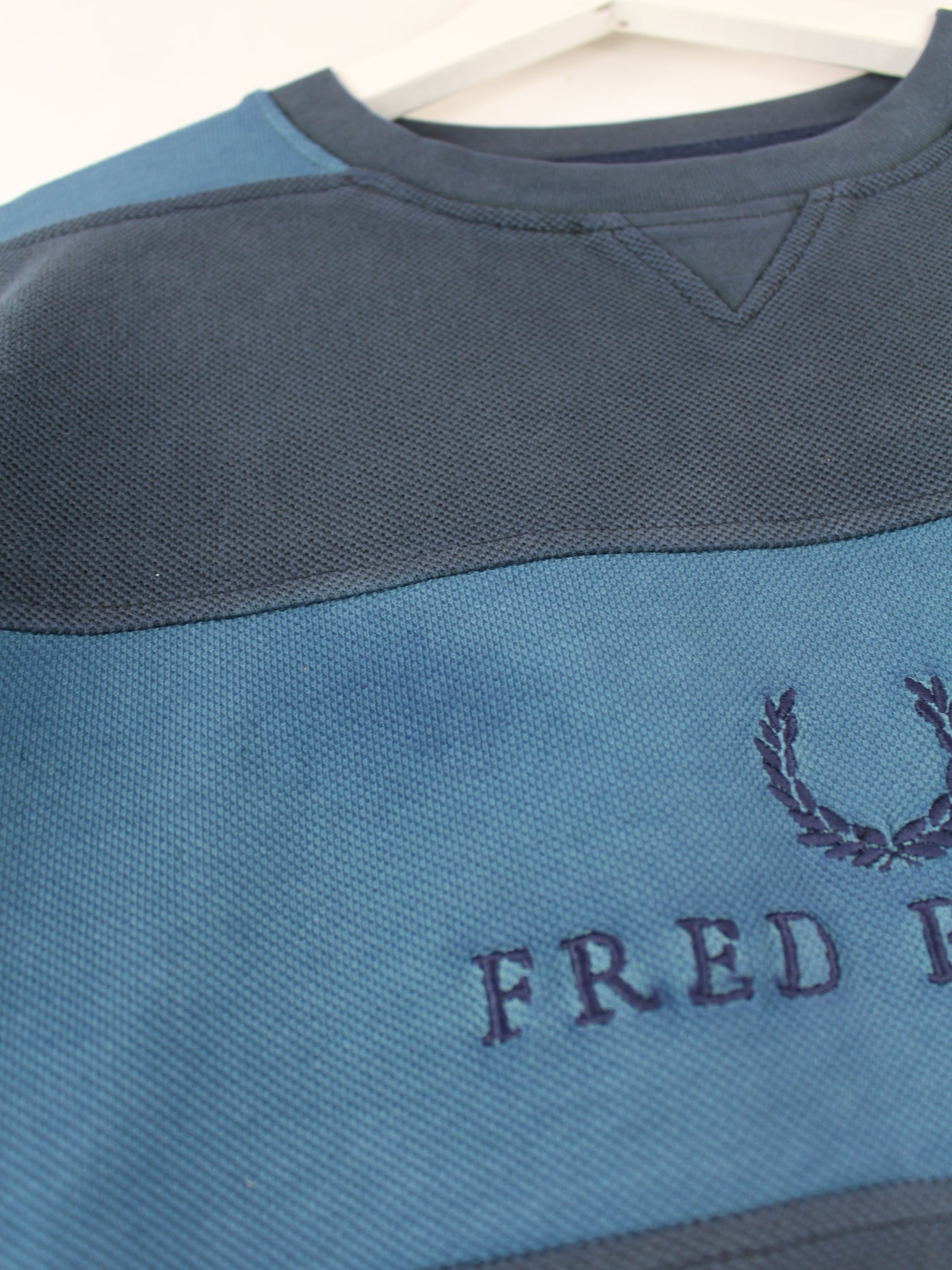 Blue sweater with embroidery from the Fred Perry label from the 90's in size M. It is made from a cotton blend and is in good condition in stock.