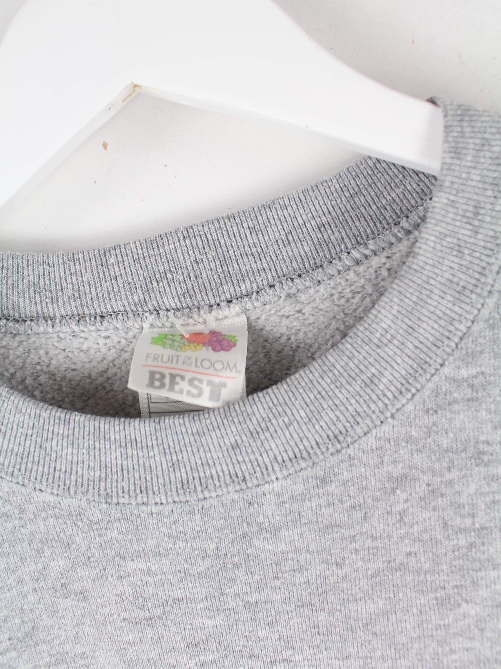 Grauer Sweater mit gestickten Motiven der Brand Fruit of the Loom aus den 90'ern in Größe L. Er ist aus einer Baumwollmischung gemacht und in sehr gutem Zustand in Stock.