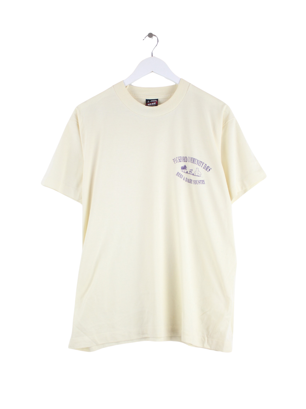T-shirt from Fruit of the Loom in size L from the 90's. It is made of cotton and we have it in yellow. With a rare farmer print.