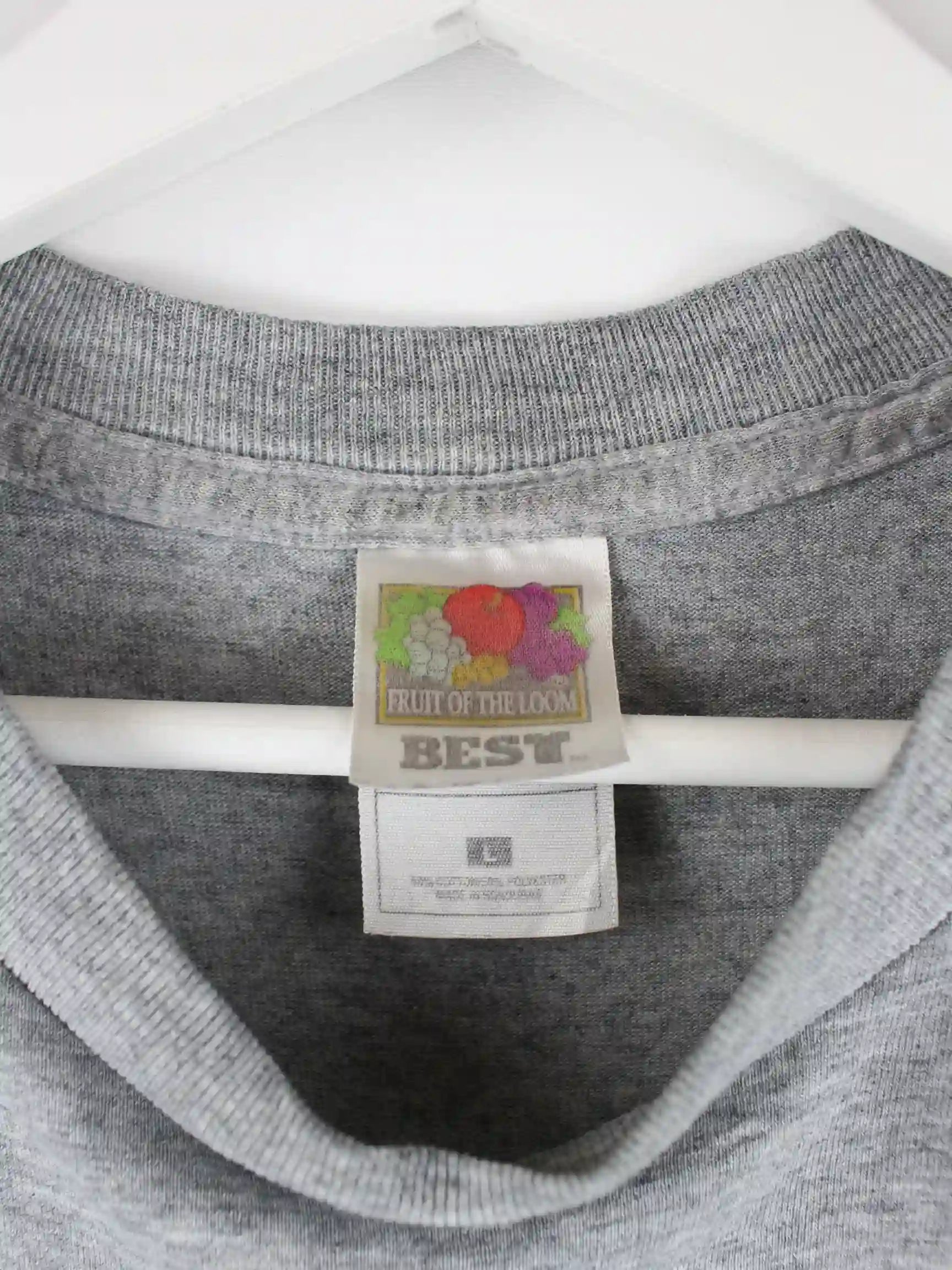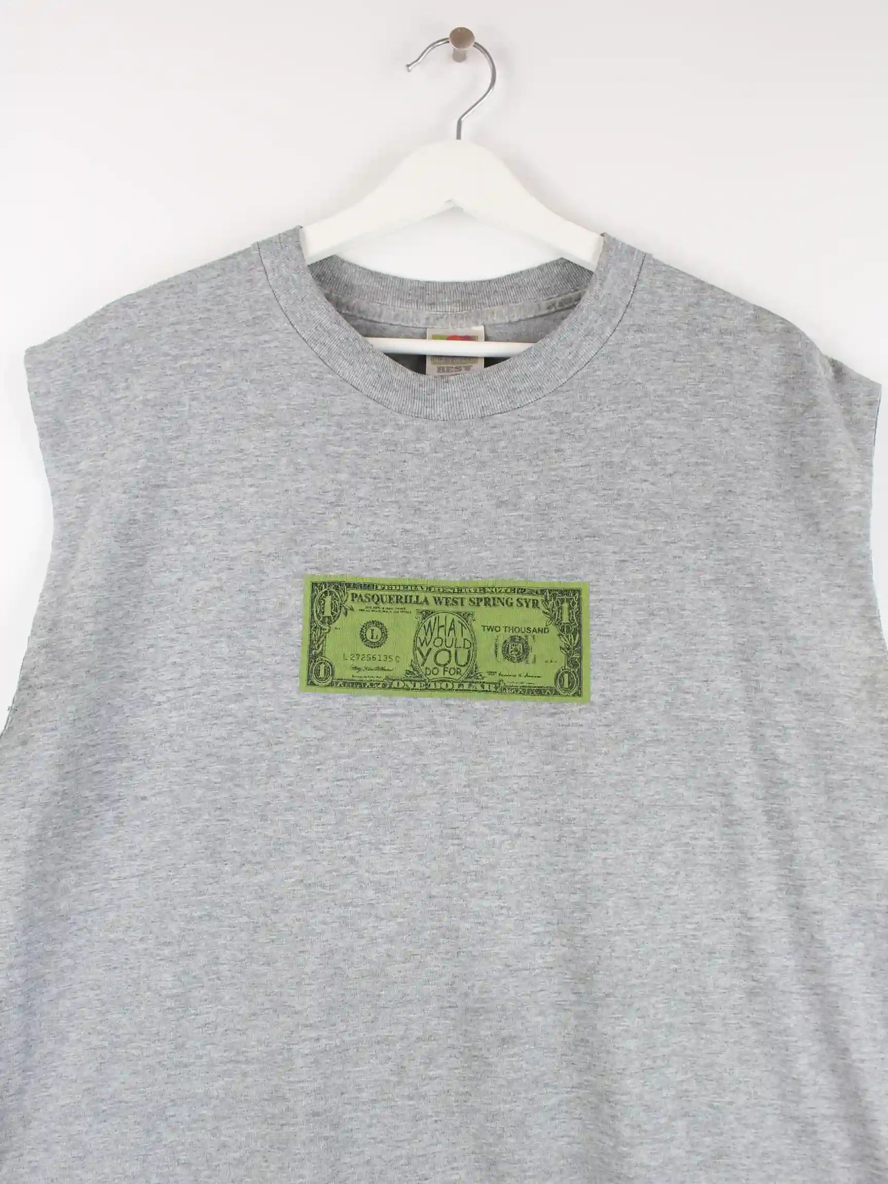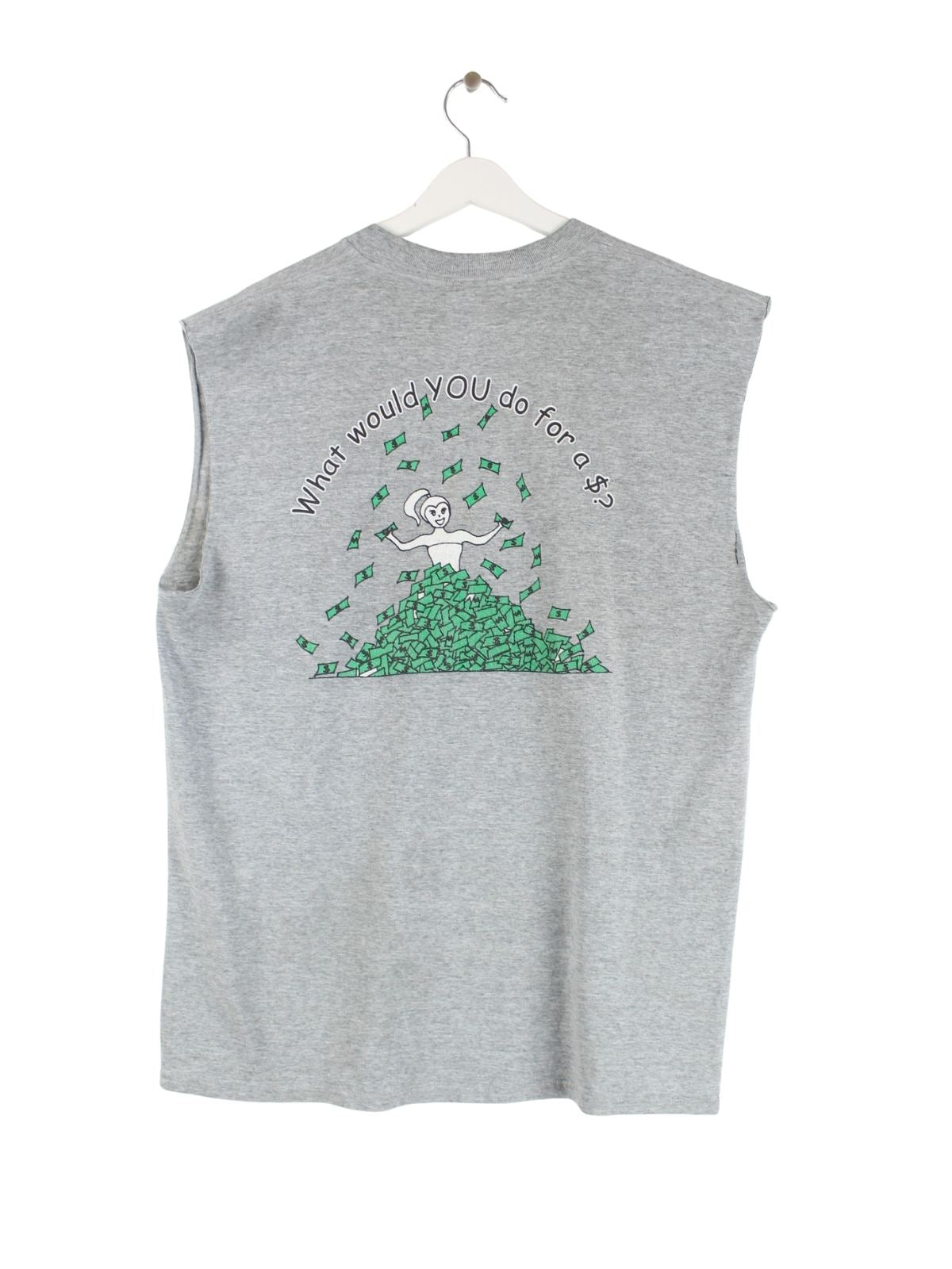 Tank Top vom Label Fruit of the Loom in Größe L aus den 90'ern. Er ist aus Baumwolle und in Grau bei uns vorrätig. Mit chiquem Money Print.