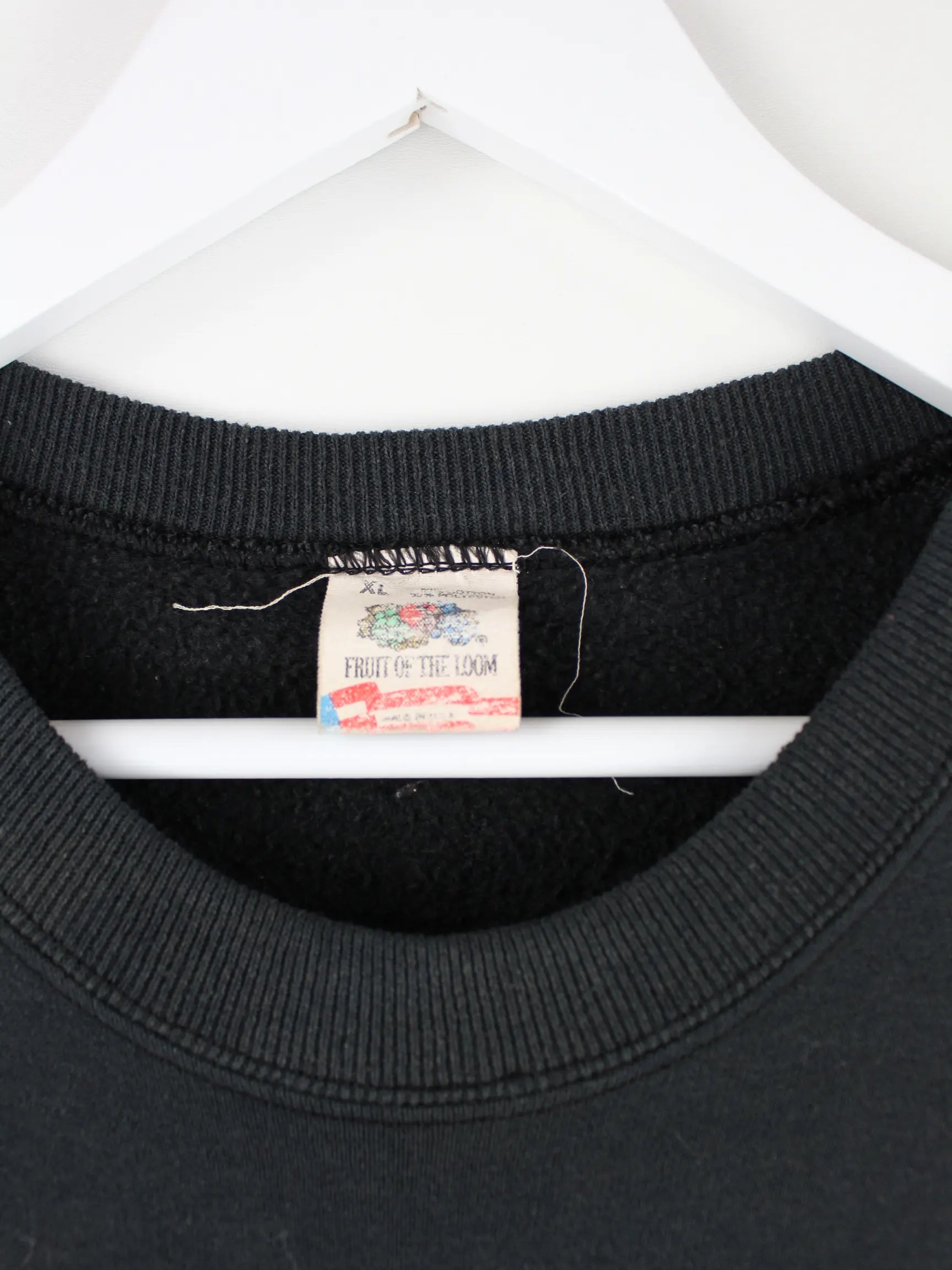 Schwarzer Sweater aus dem Hause Fruit of the Loom aus den 90'ern in Größe XL. Er ist aus einer Baumwollmischung gefertigt und in gutem Zustand auf Lager. Mit seltenem Storm Print.