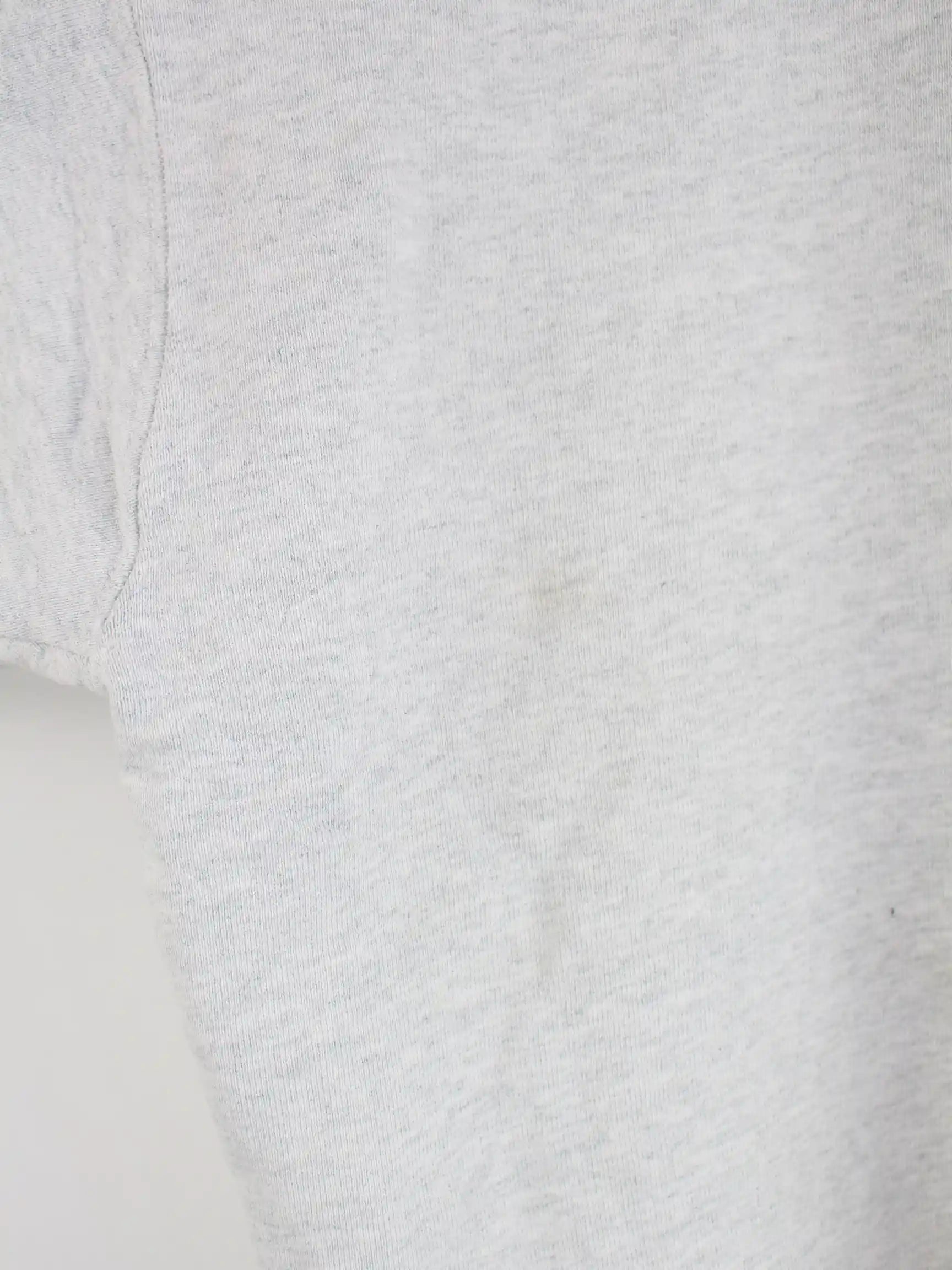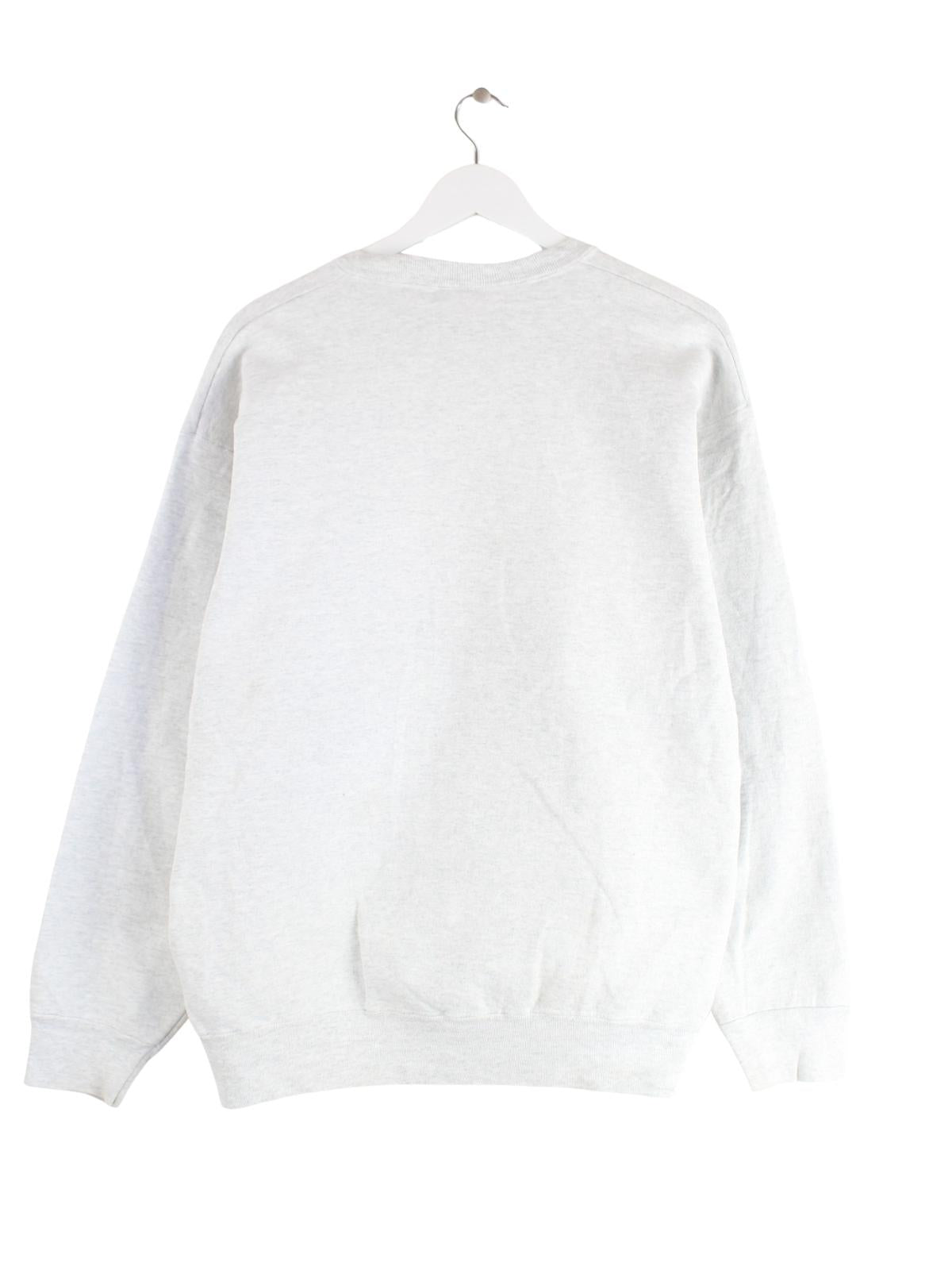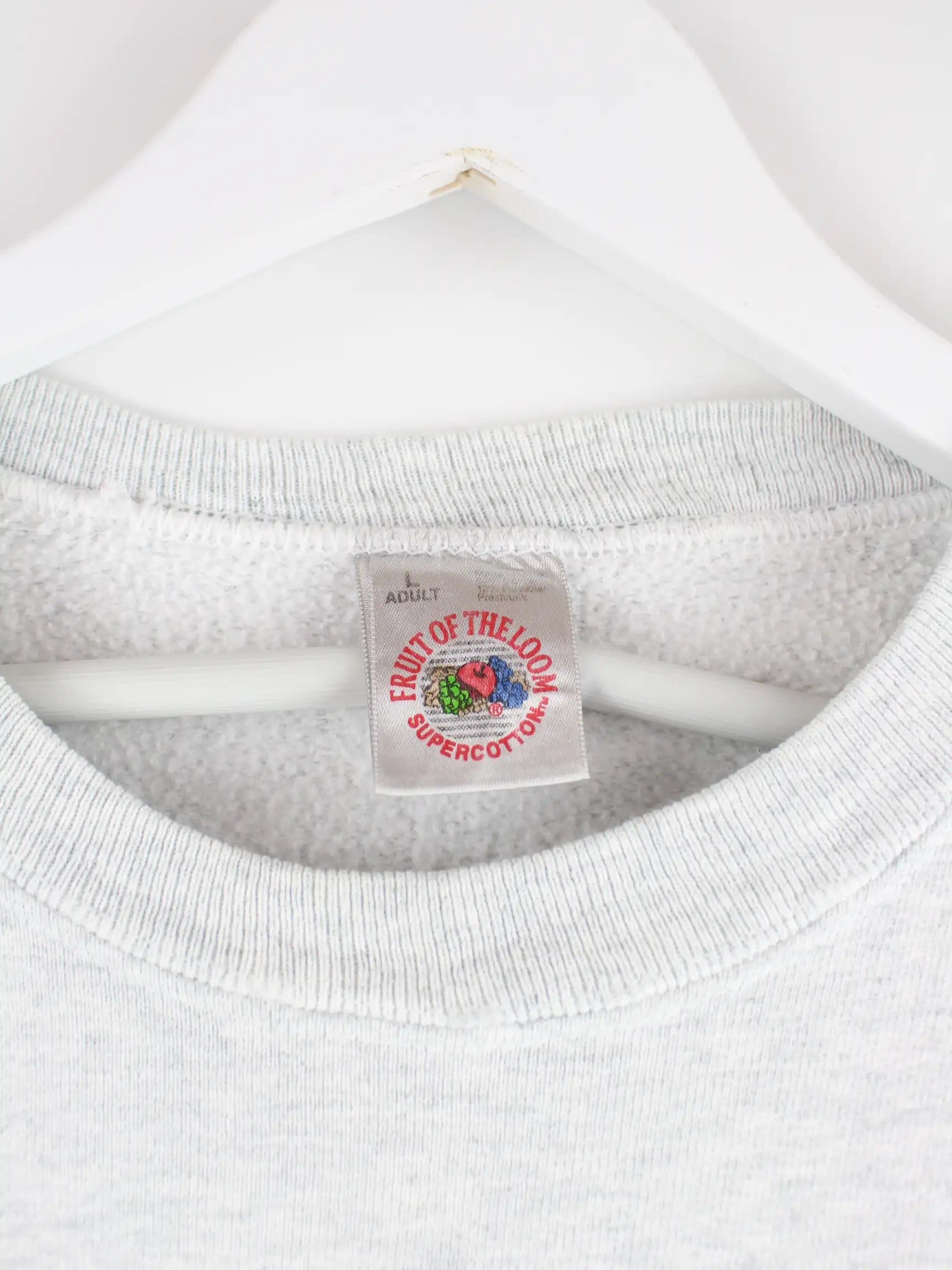 Sweater vom Label Fruit of the Loom in Größe L aus den 90'ern. Er ist aus einer Baumwollmischung und in Grau in Stock. Mit schickem Camp Print.