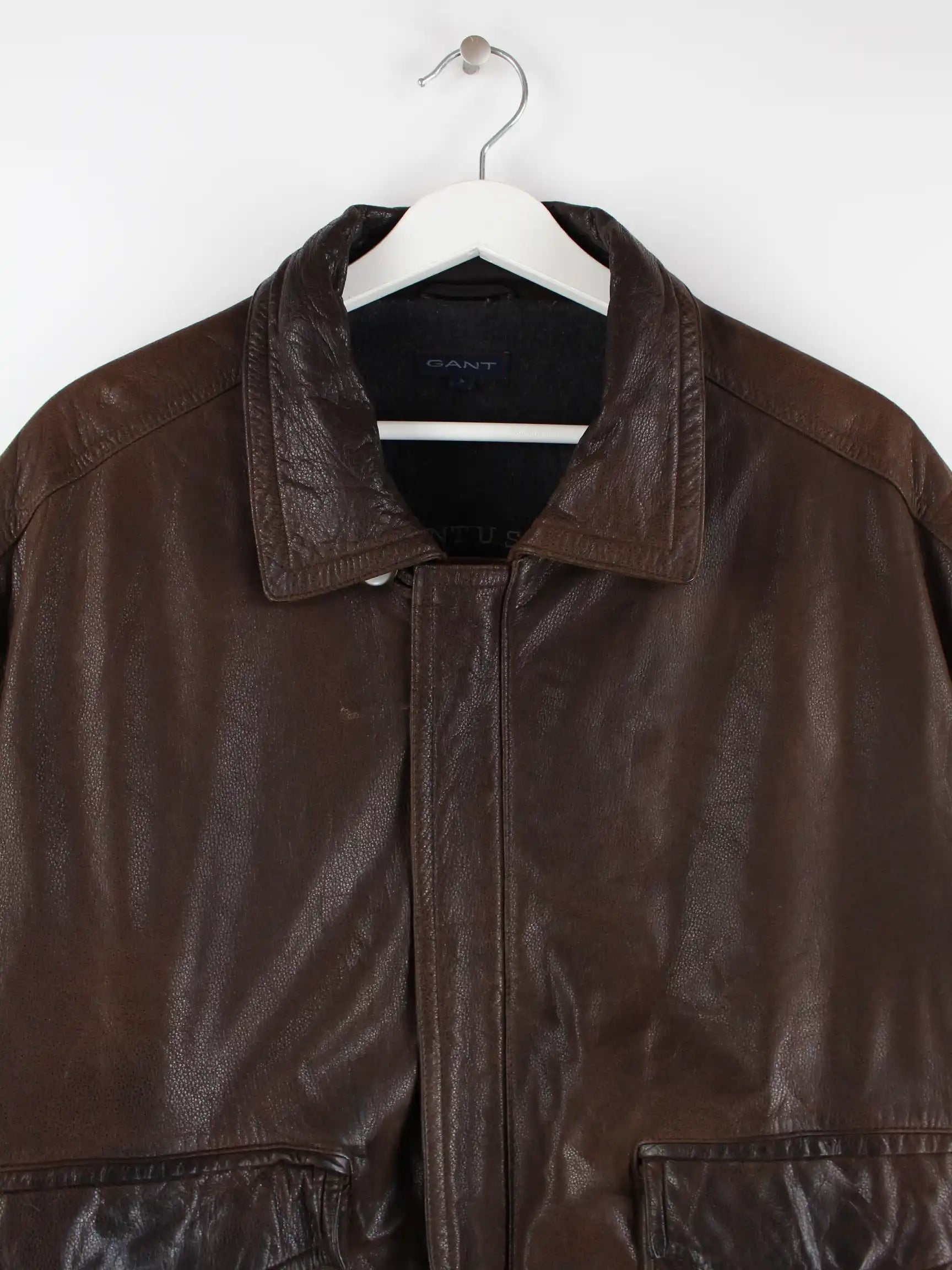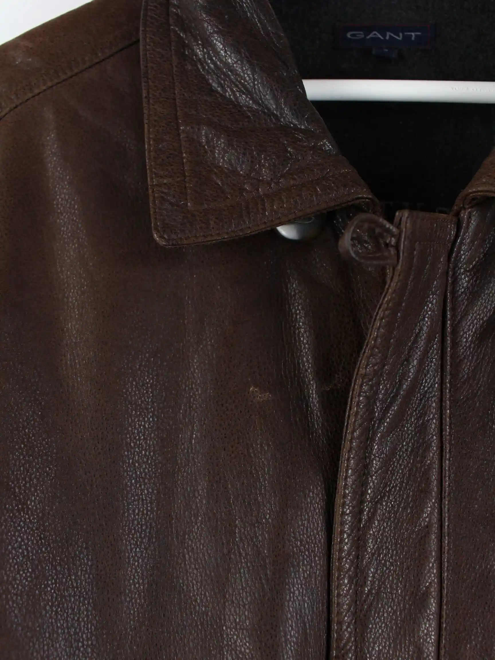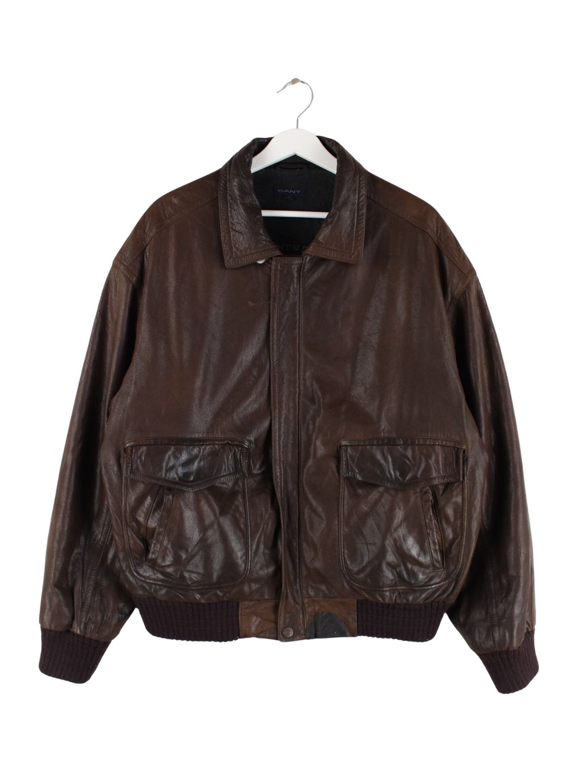 Braune Jacke von Gant aus den 90'ern in Größe L. Sie ist aus Leder gemacht und in gutem Zustand bei uns zu bekommen.