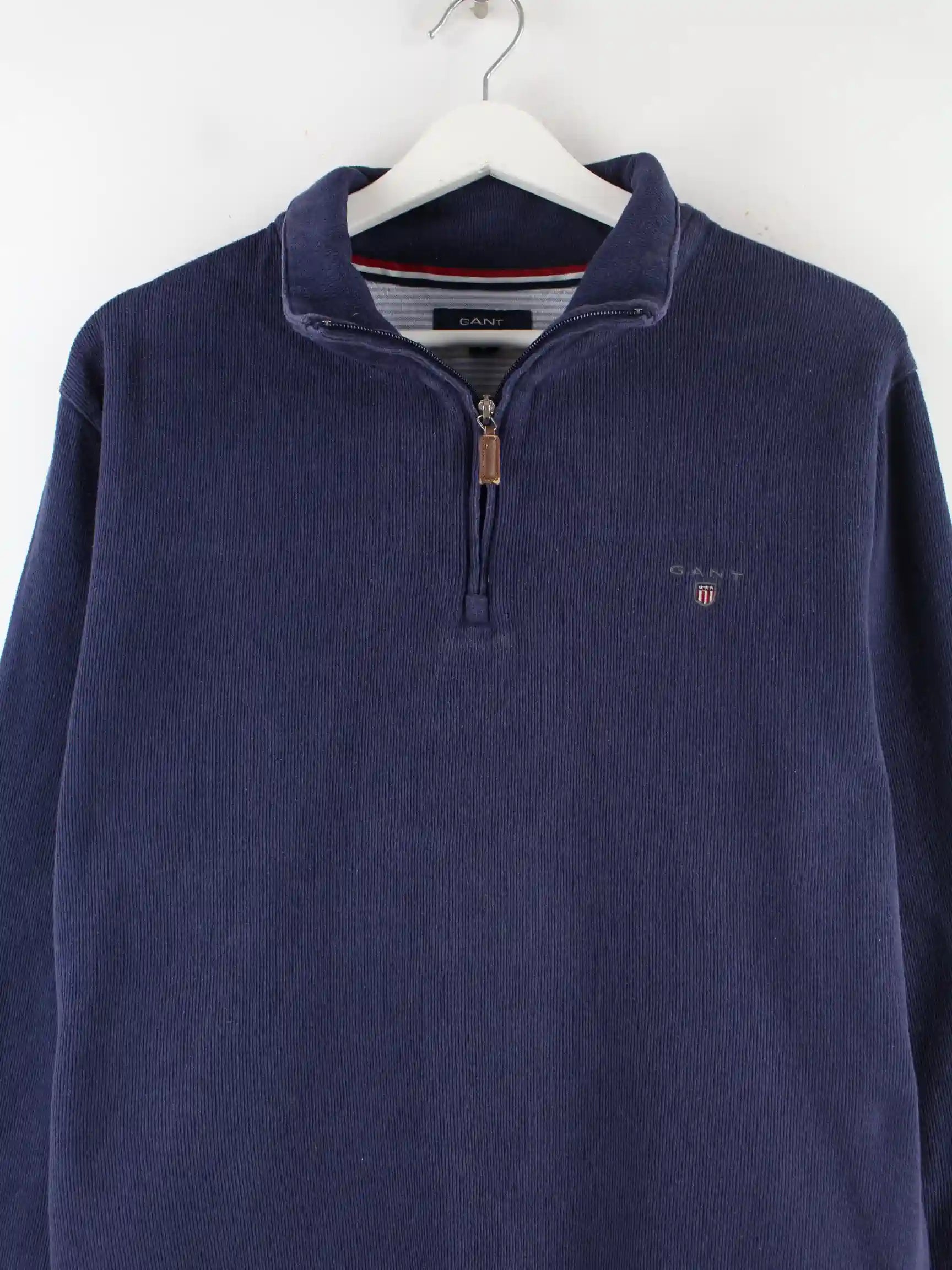 Blauer Sweater mit halbem Reißverschluß des Labels Gant in Größe M. Er ist aus einer Baumwollmischung hergestellt und in gutem Zustand vorrätig.