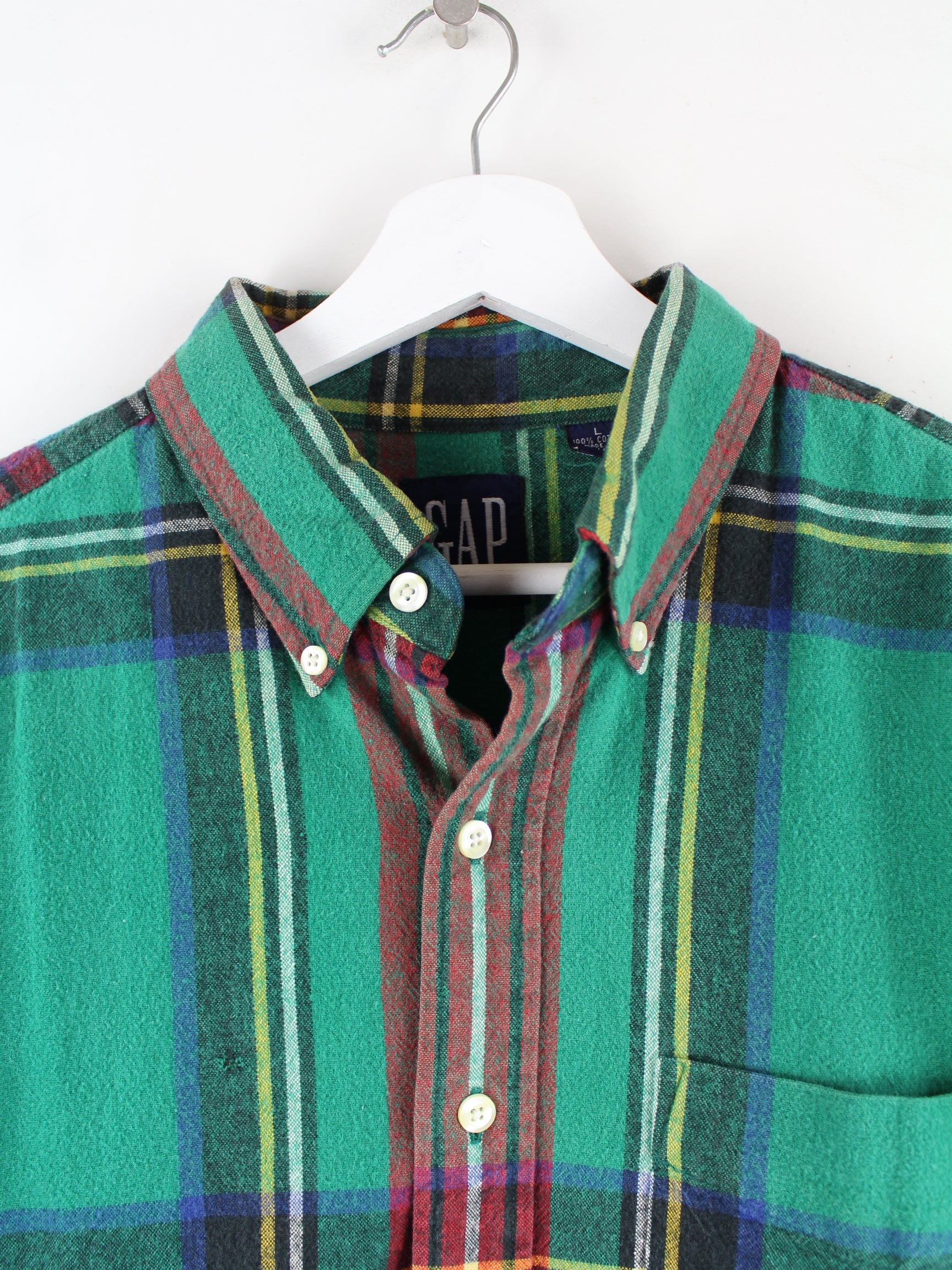 Green casual shirt by GAP from the 90's in size L. It is made of cotton and in good condition in stock.