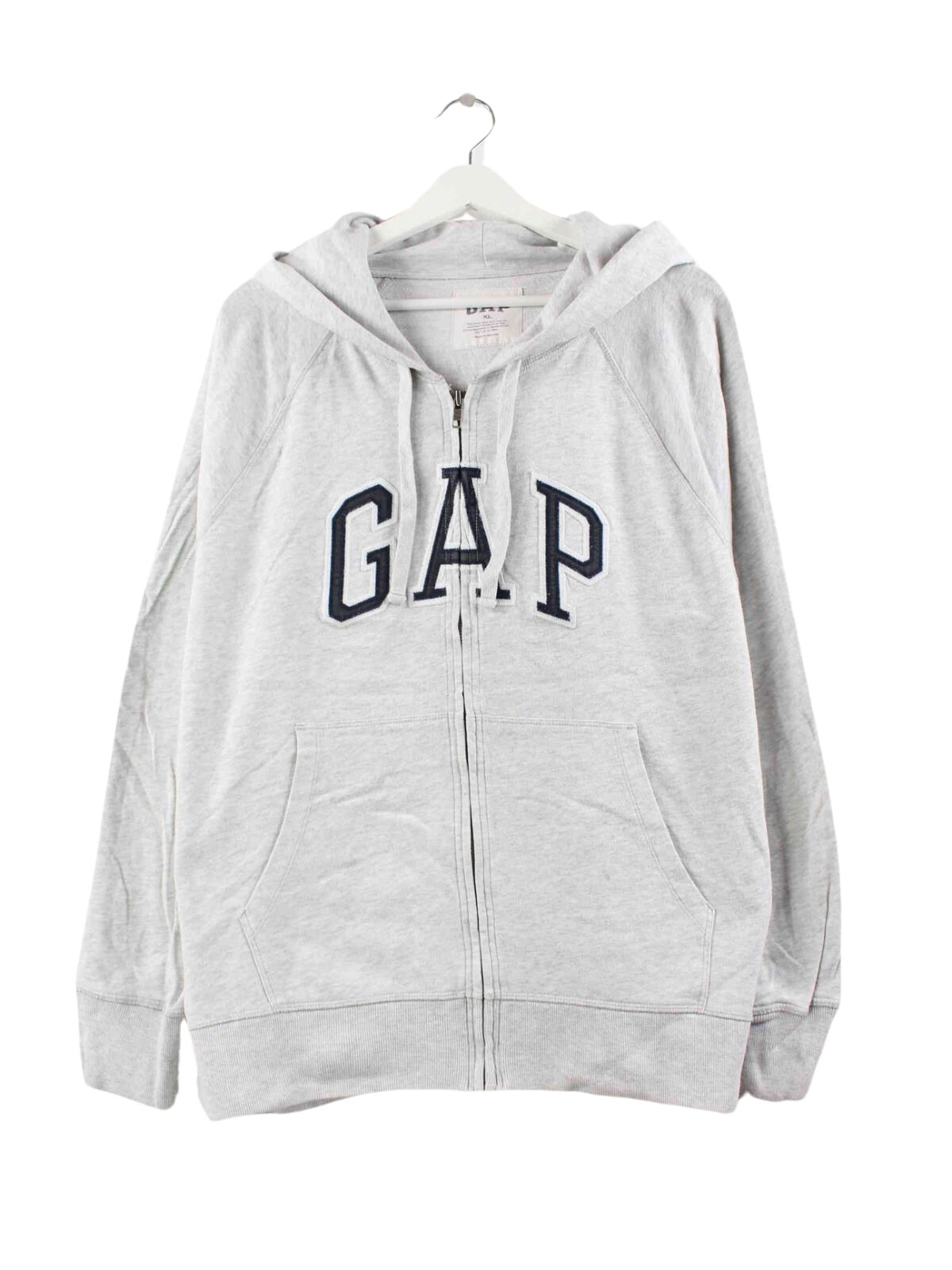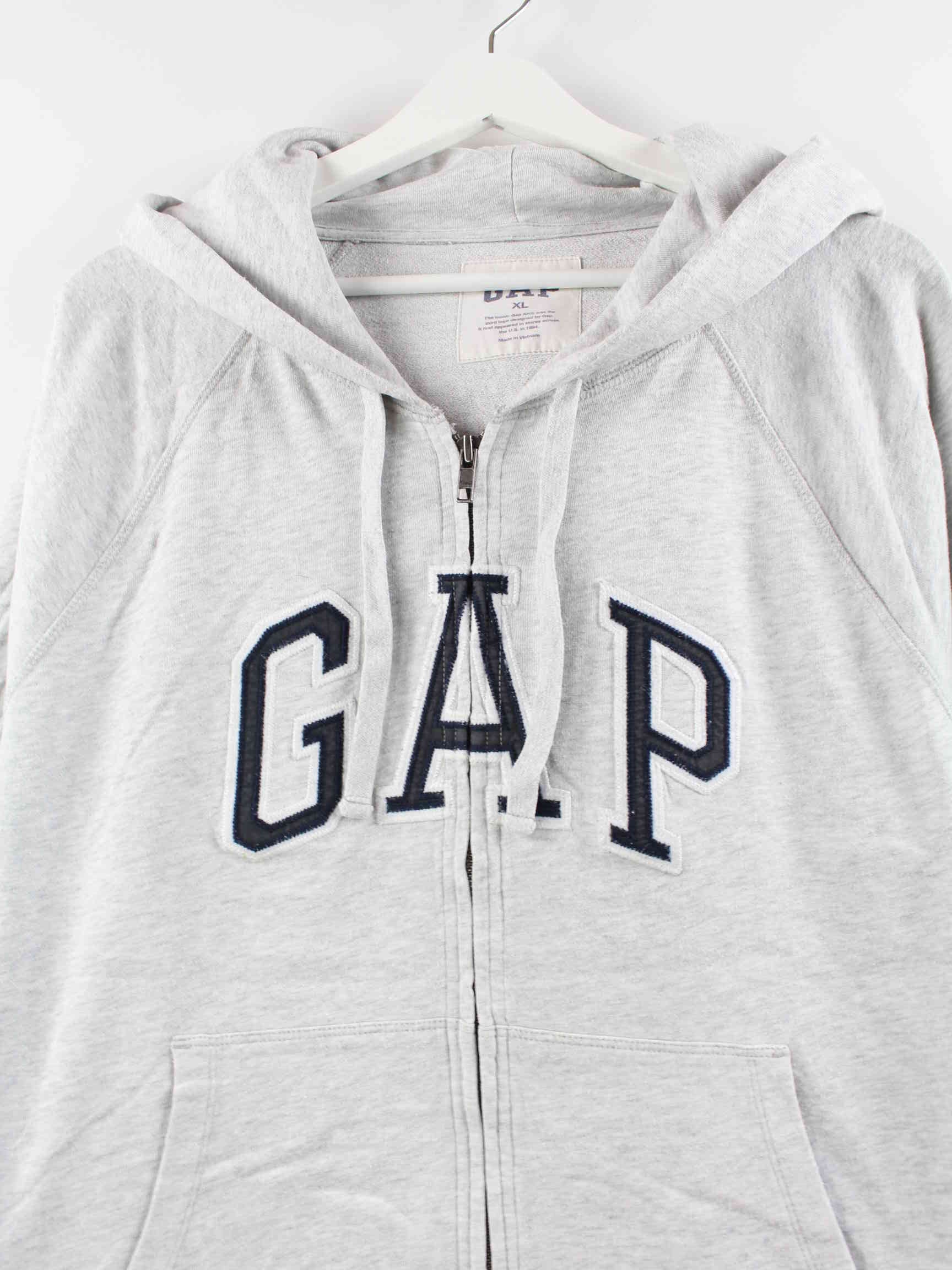 Gray hoodie with embroidered logo and zipper from the GAP brand in size L. It is made of a cotton blend and is available in good condition.