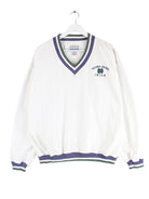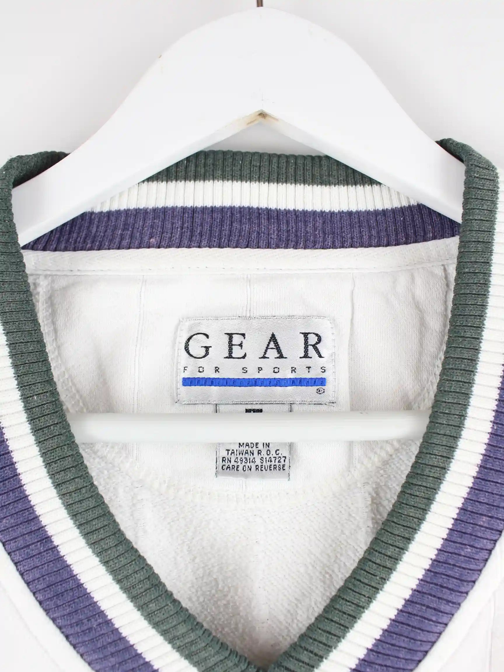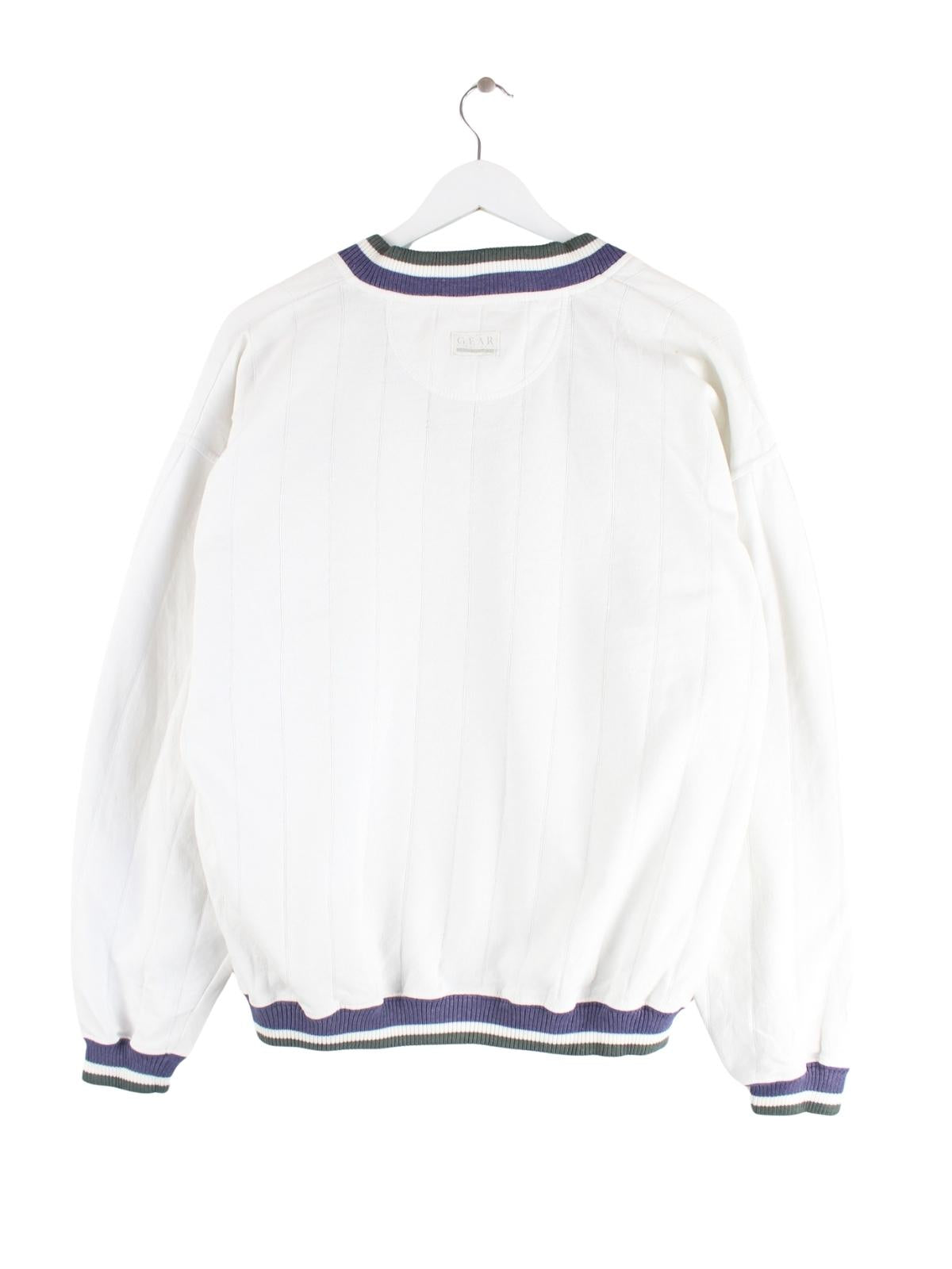Weißer Sweater vom Label Gear for Sports aus den 90'ern in Größe L. Er ist aus einer Baumwollmischung und in sehr gutem Zustand bei uns zu bekommen.