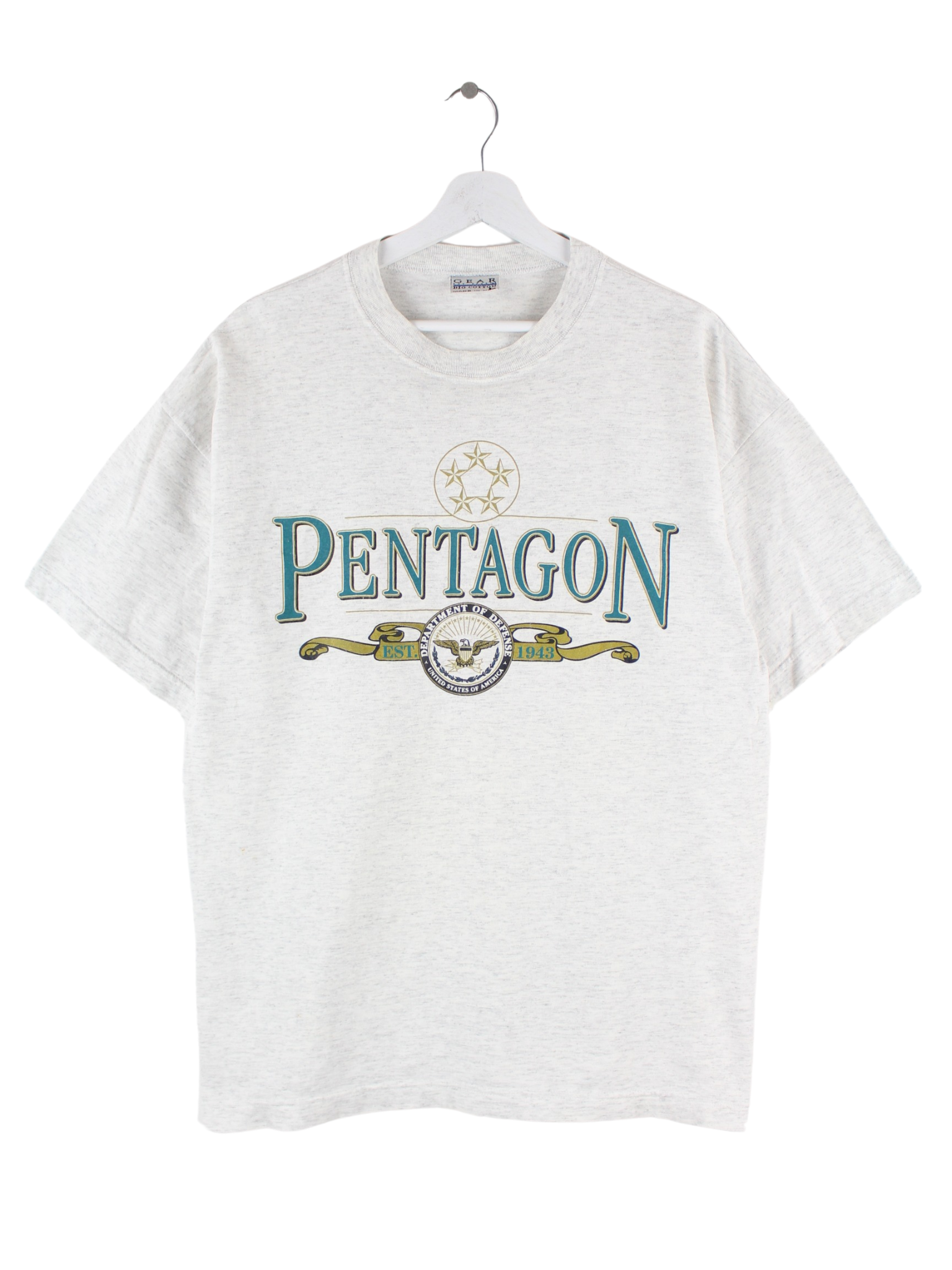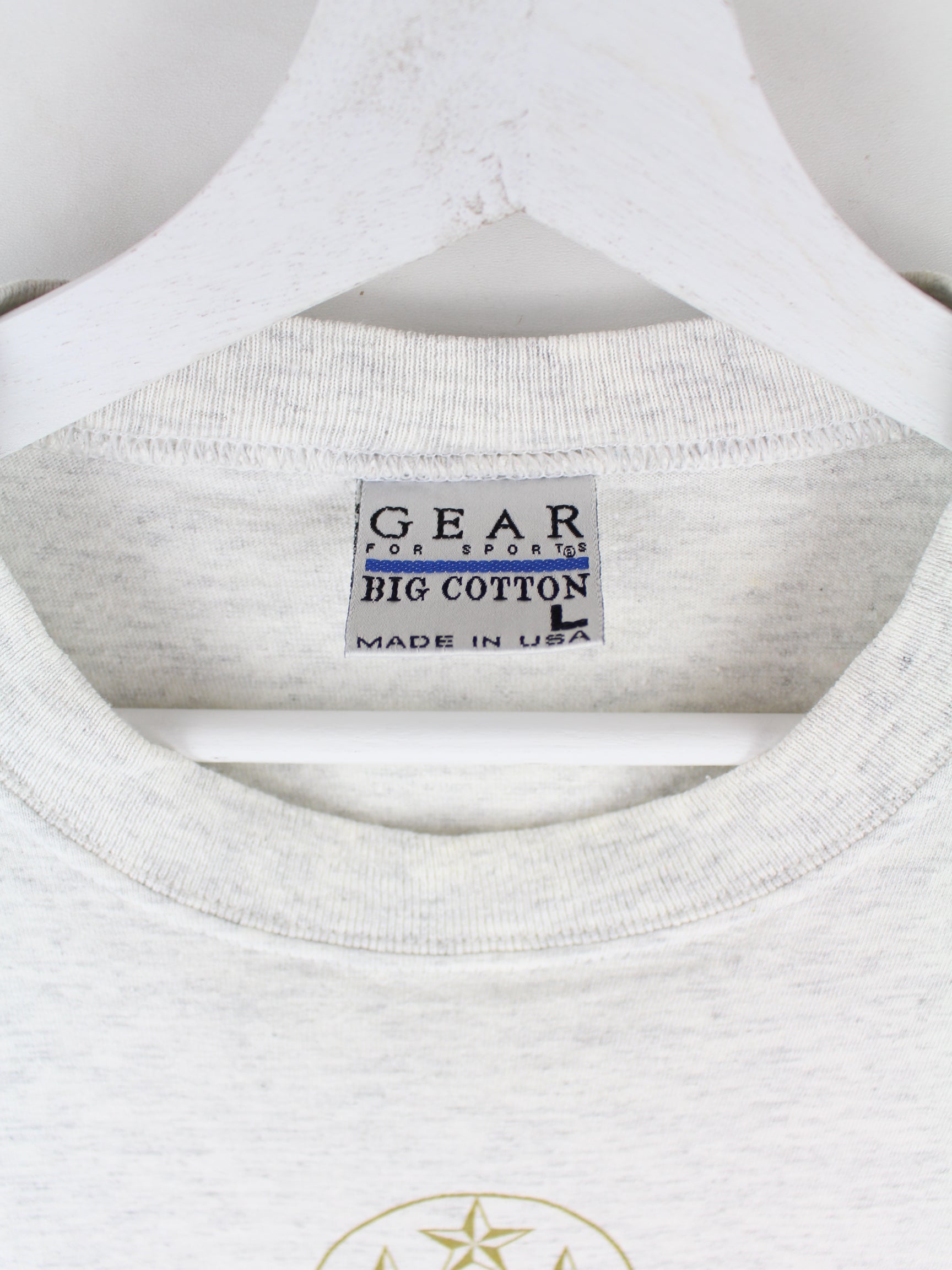 T-shirt from the Gear for Sports label in size L from the 90's. It is made of cotton and is in stock in grey. With a chic pentagon print.