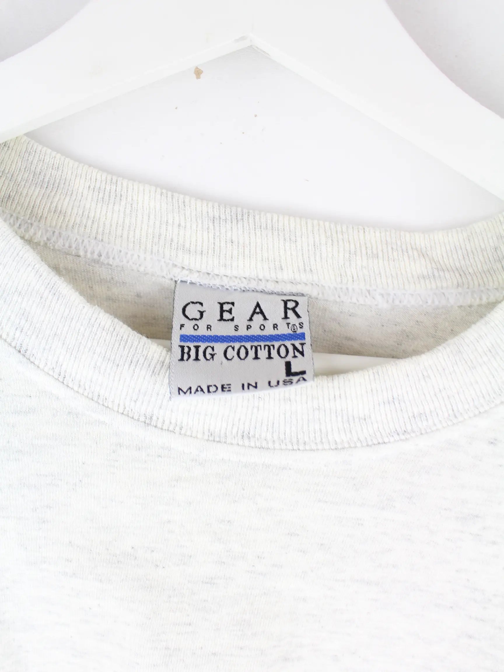 Graues T-Shirt des Labels Gear for Sports aus den 90'ern in Größe L. Es ist aus Baumwolle produziert und in gutem Zustand lieferbar. Mit tollem Airlines Print.