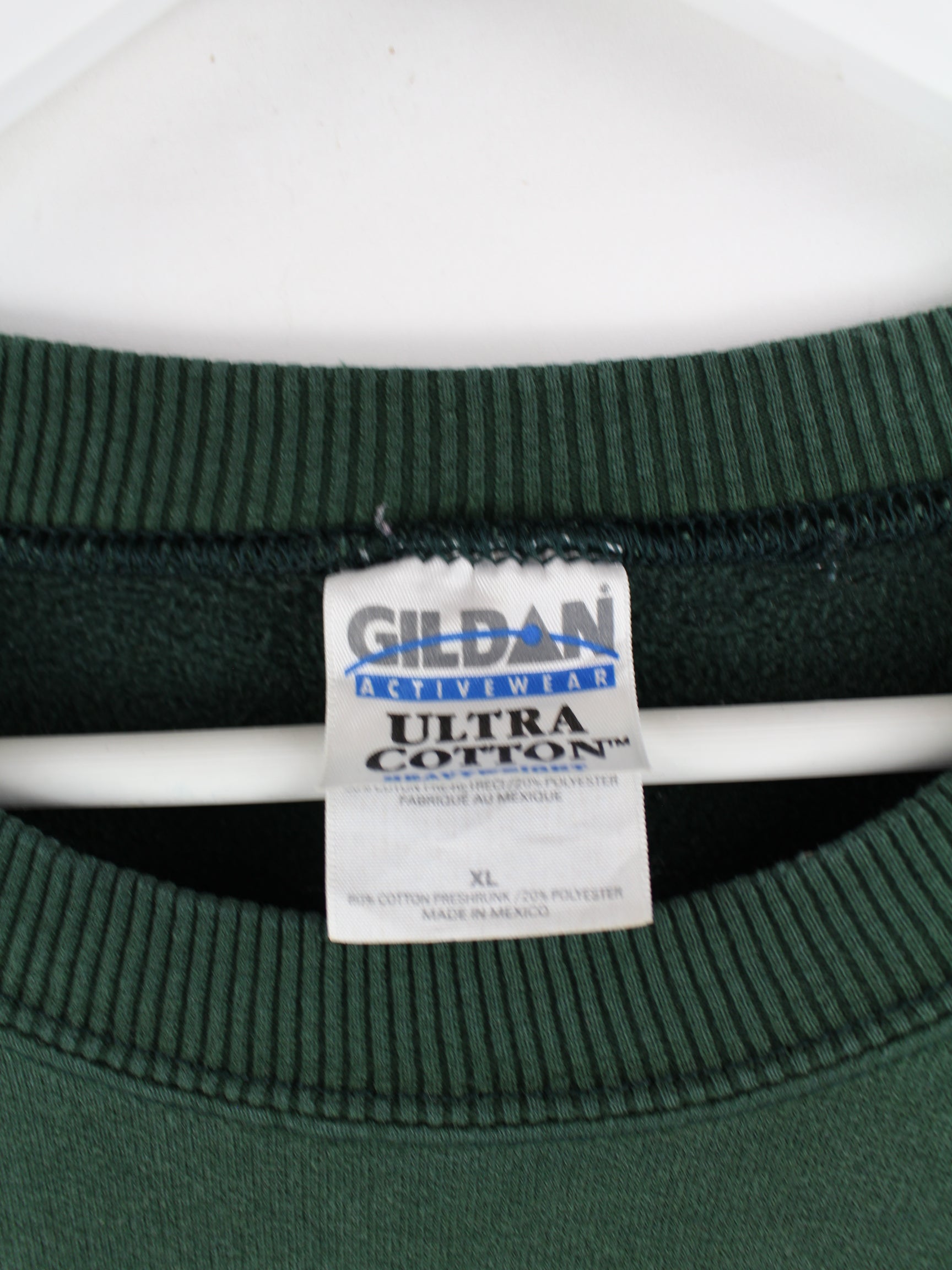 Green sweater with embroidery from the Gildan brand from the 90's in size XL. It is made from a cotton blend and is in good condition.