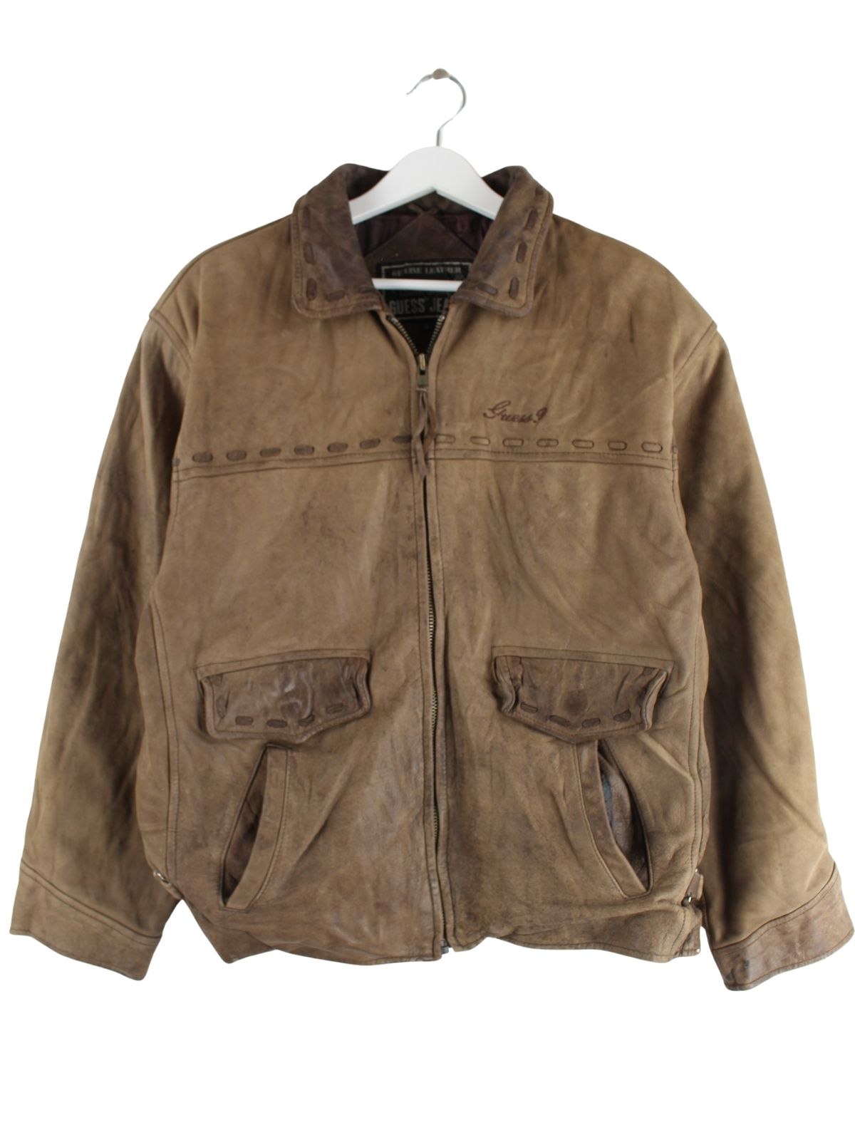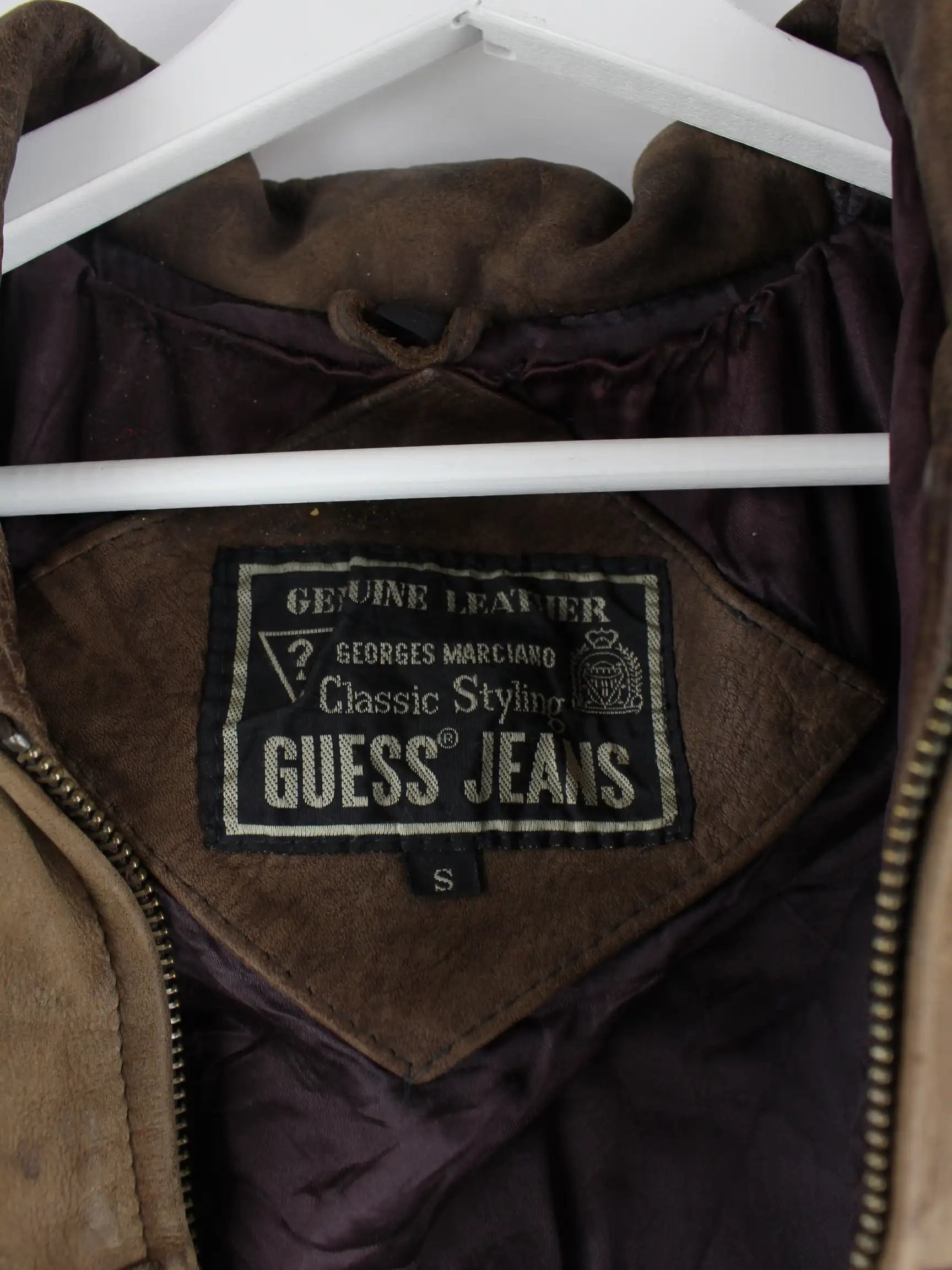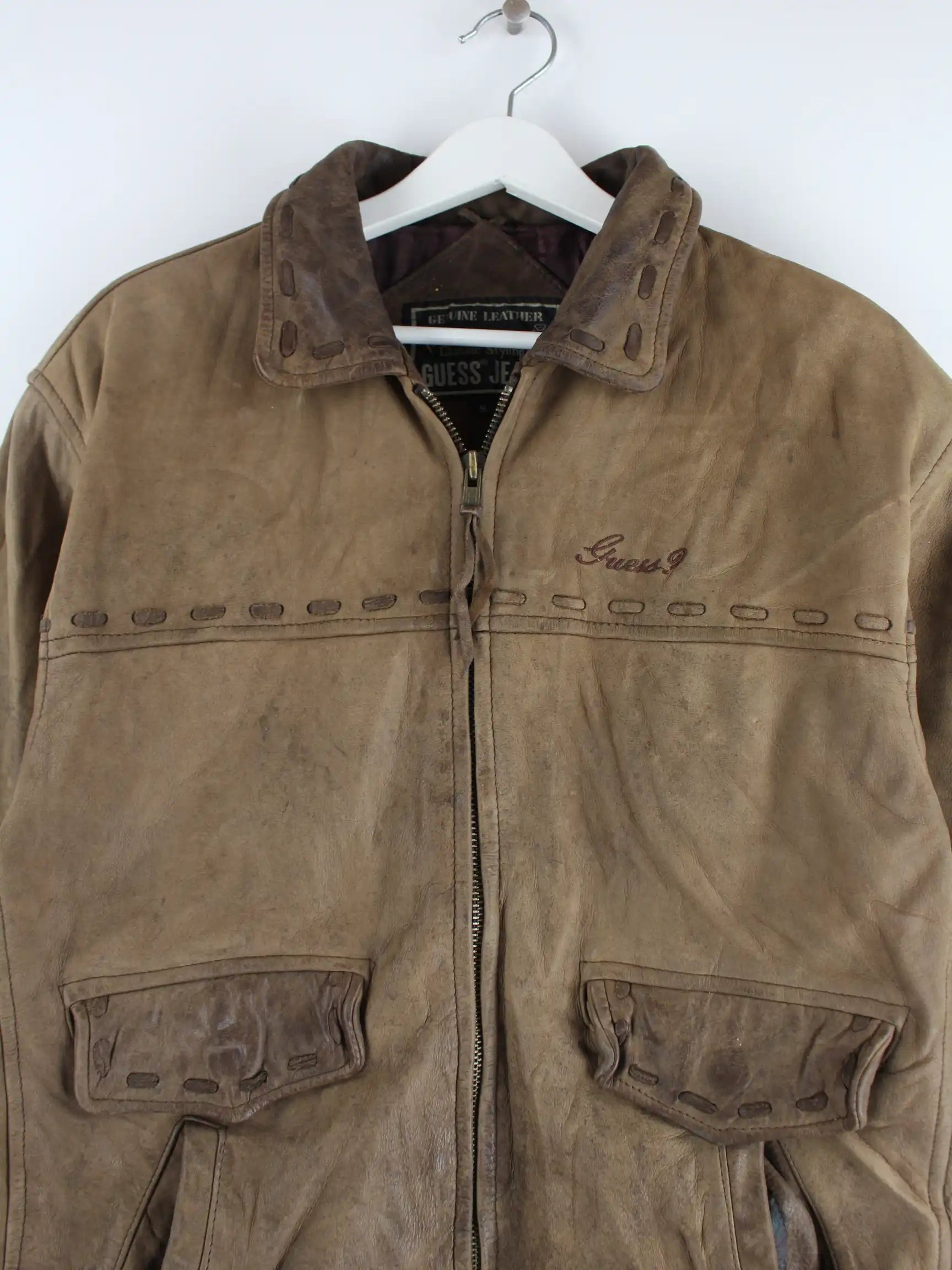 Braune Jacke aus dem Hause Guess aus den 90'ern in Größe S. Sie ist aus Leder hergestellt. Den Zustand würden wir als 'In Ordnung' bezeichnen (vergl. Bilder).