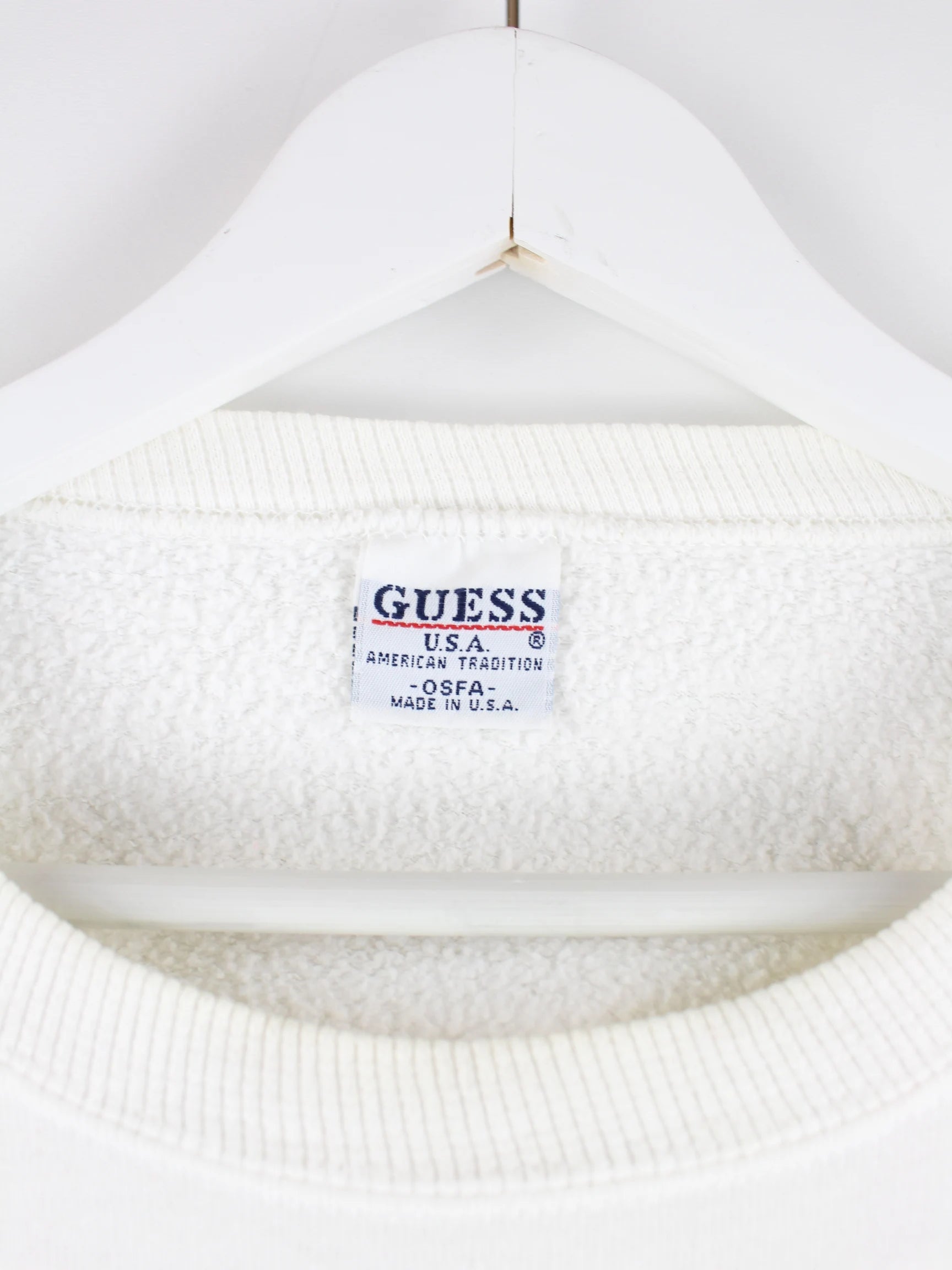 Sweater aus dem Hause Guess in Größe M aus den 90'ern. Er ist aus einer Baumwollmischung gemacht und in Weiß lieferbar.