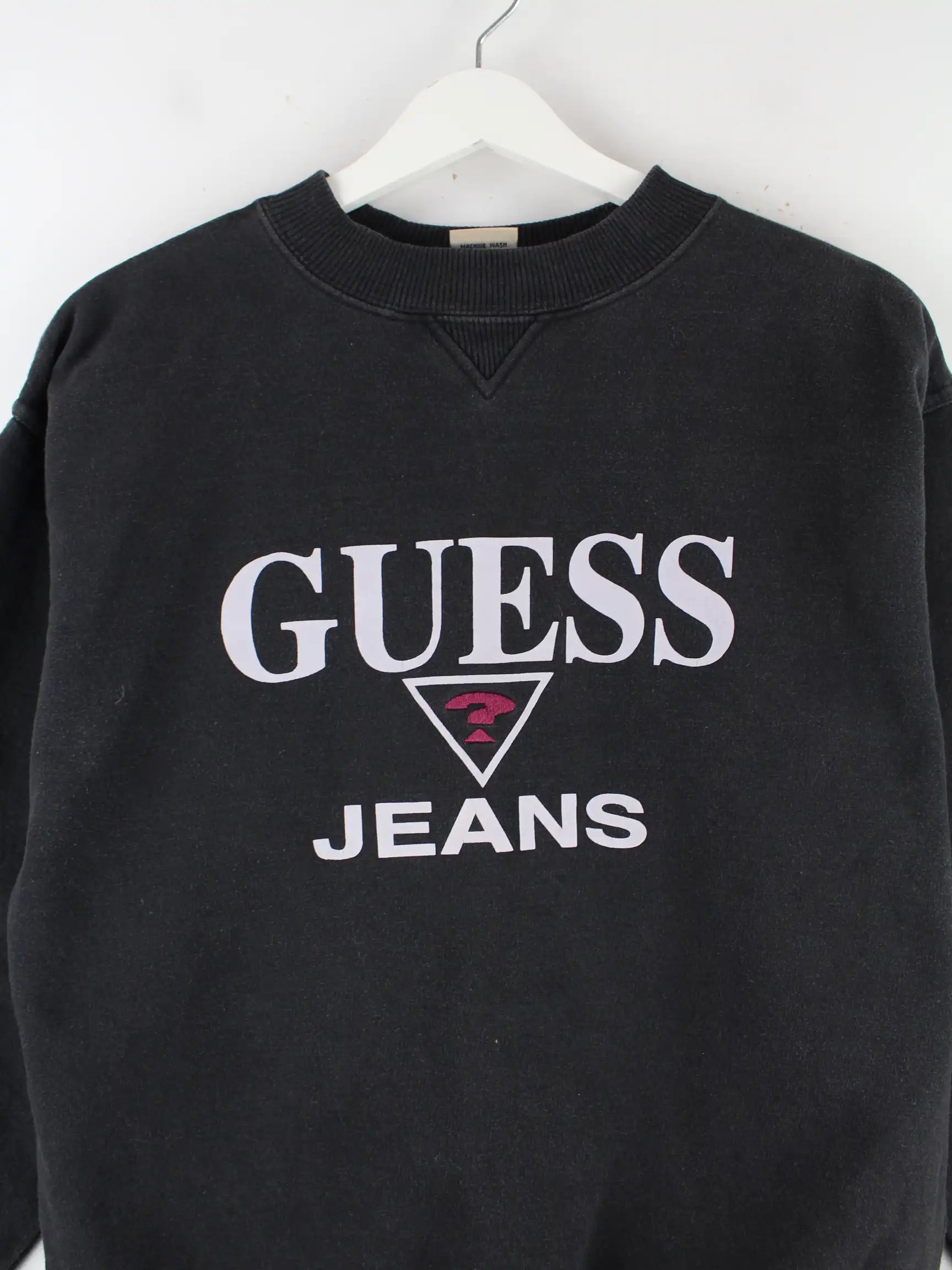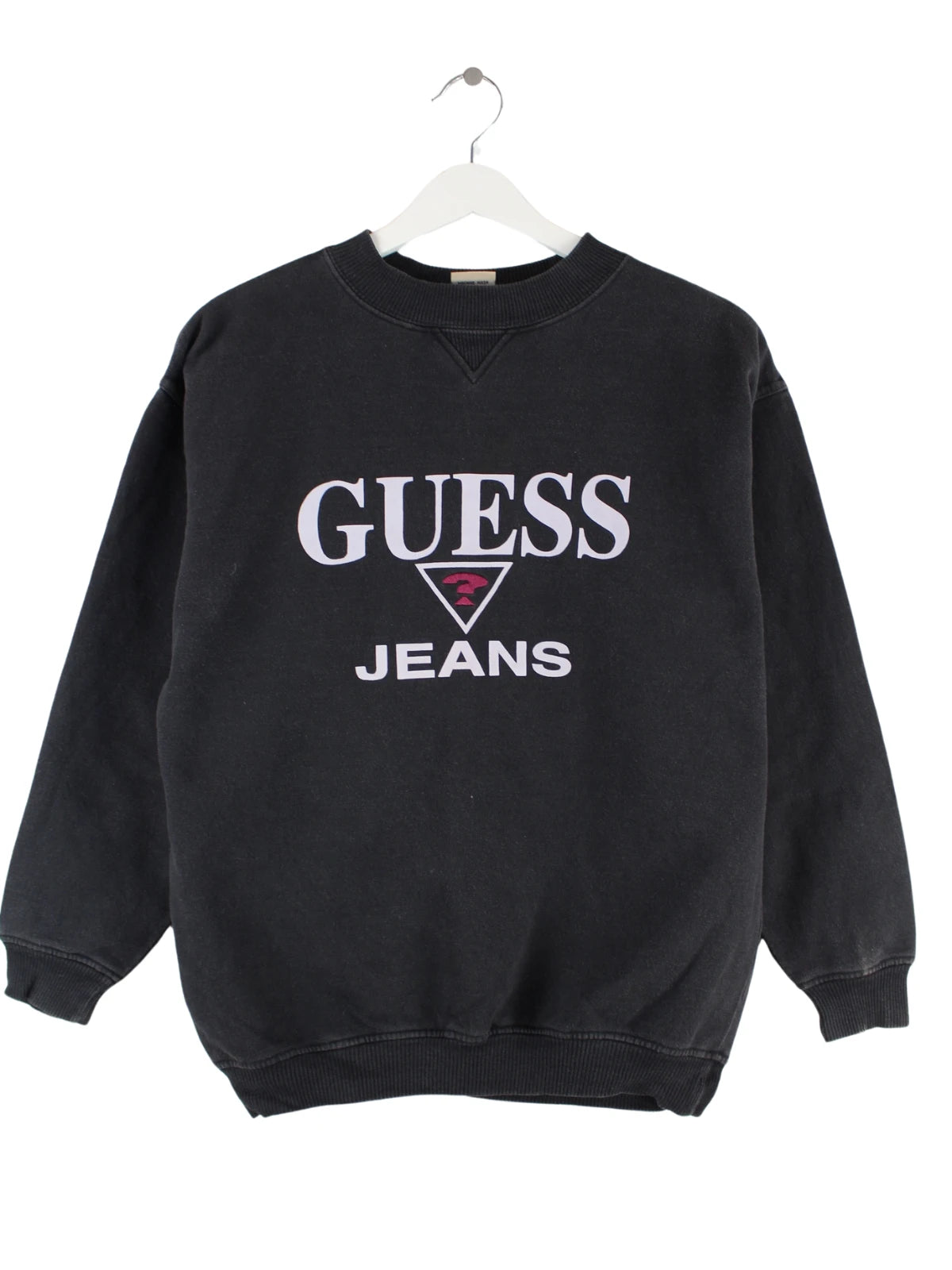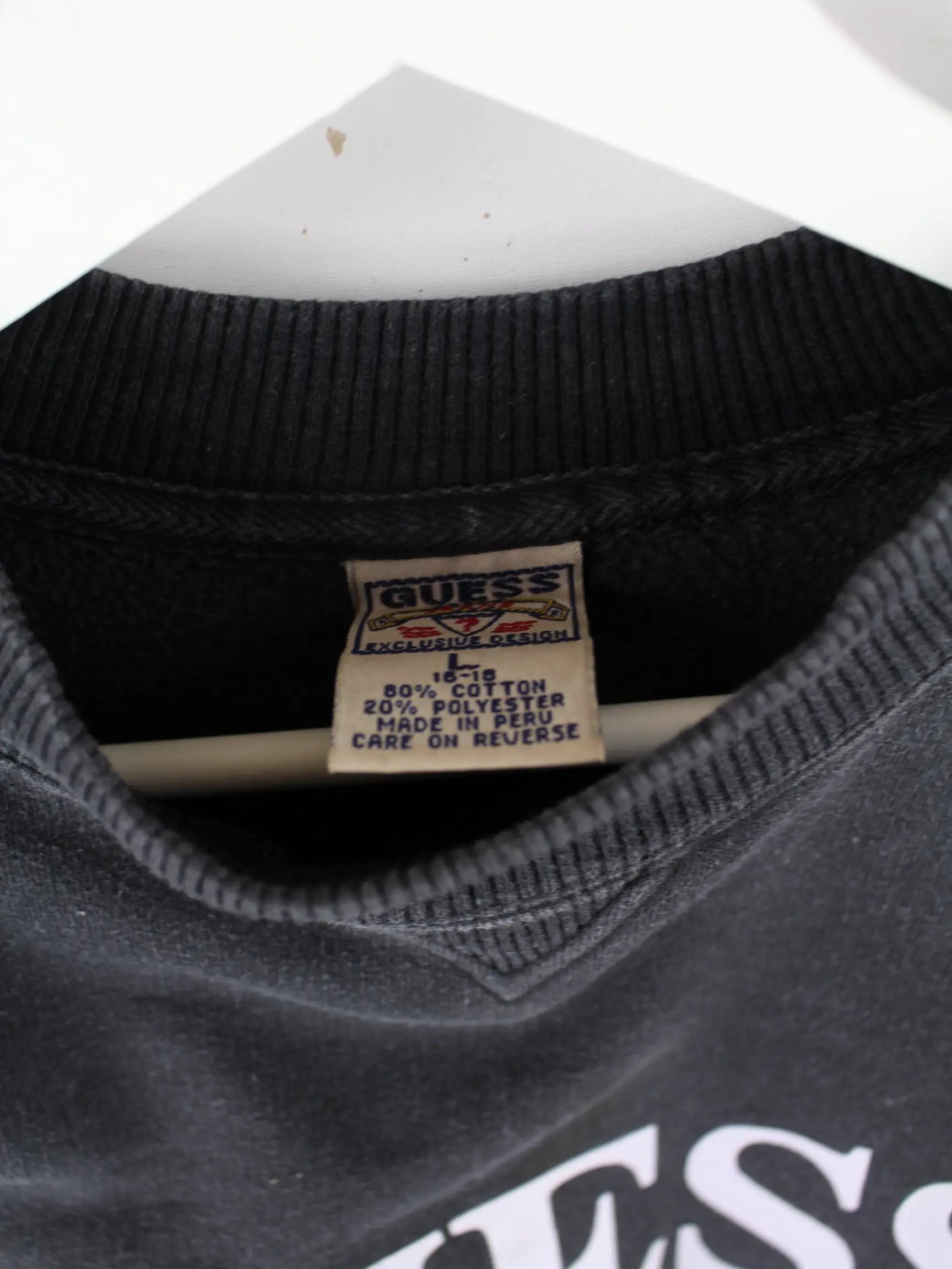 Schwarzer Sweater des Labels Guess aus den 90'ern in Größe L. Er ist aus einer Baumwollmischung und in gutem Zustand bei uns zu bekommen. Mit seltenem Vintage Print.