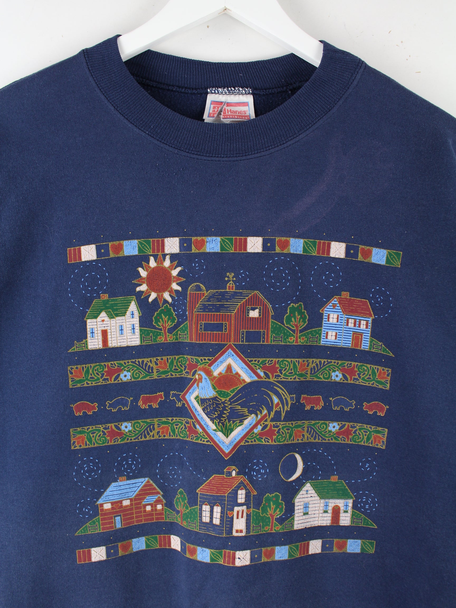 Blauer Sweater von Hanes aus den 90'ern in Größe XL. Er ist aus einer Baumwollmischung und in gutem Zustand zu haben. Mit seltenem Christmas Print.