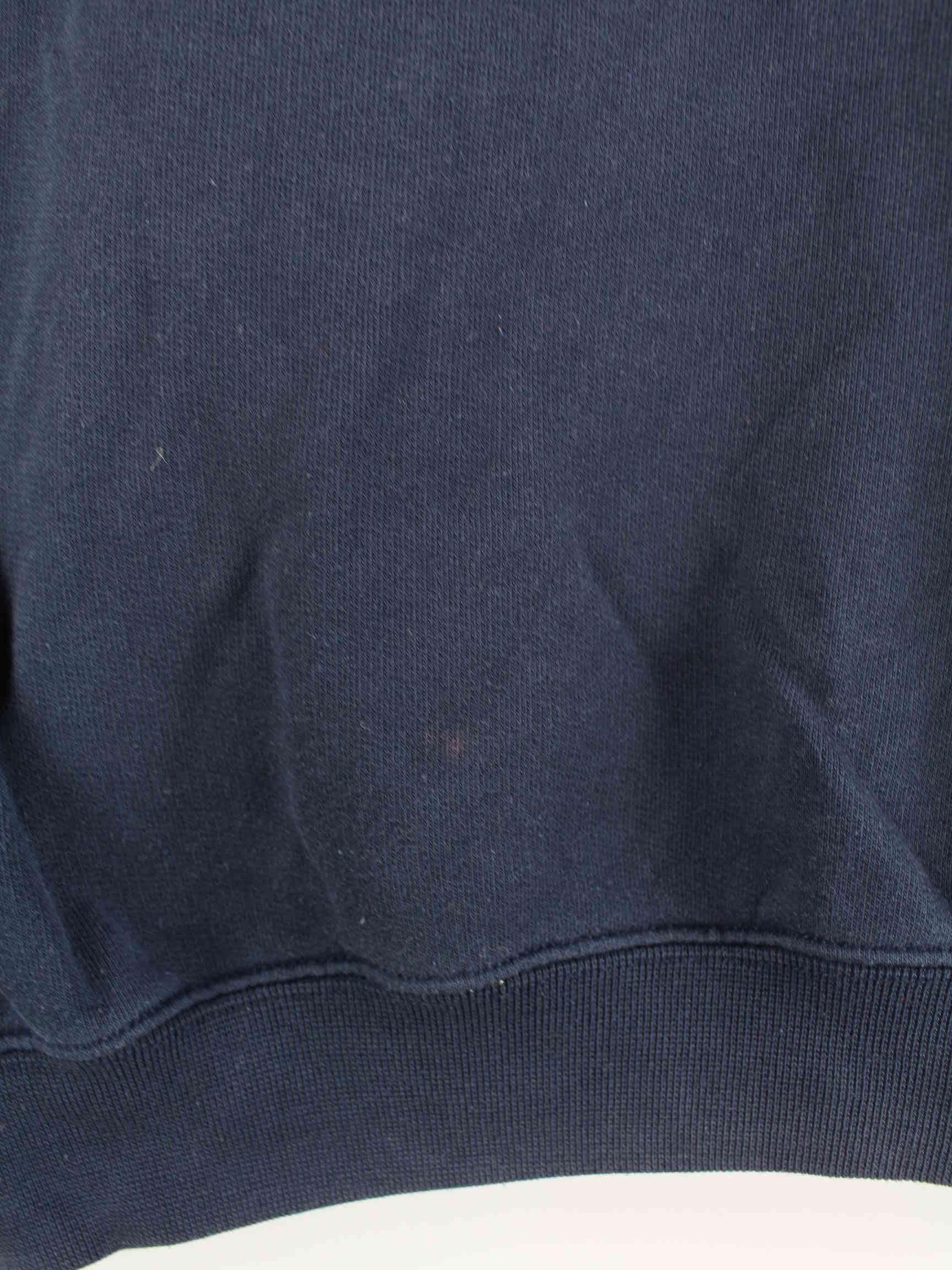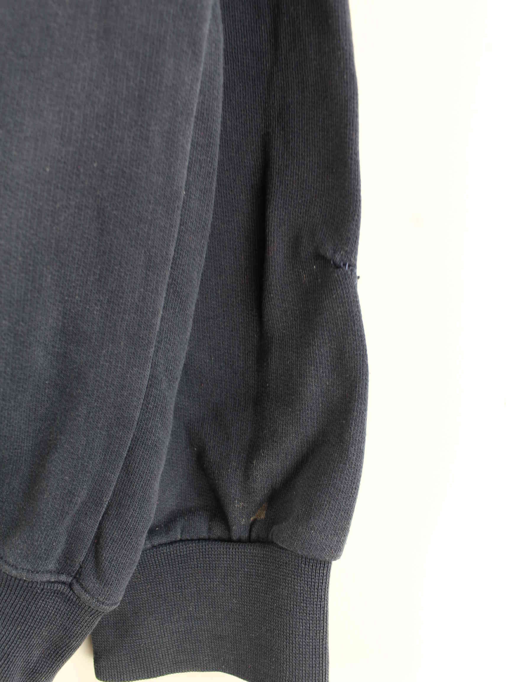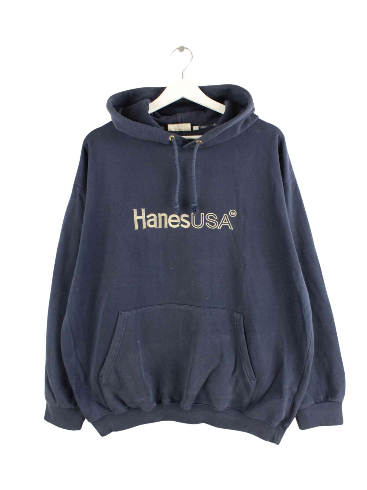 Blue hoodie with embroidered logo of the Hanes brand from the 90's in size L. It is made of a cotton blend. We would describe the condition as 'OK' (see pictures).