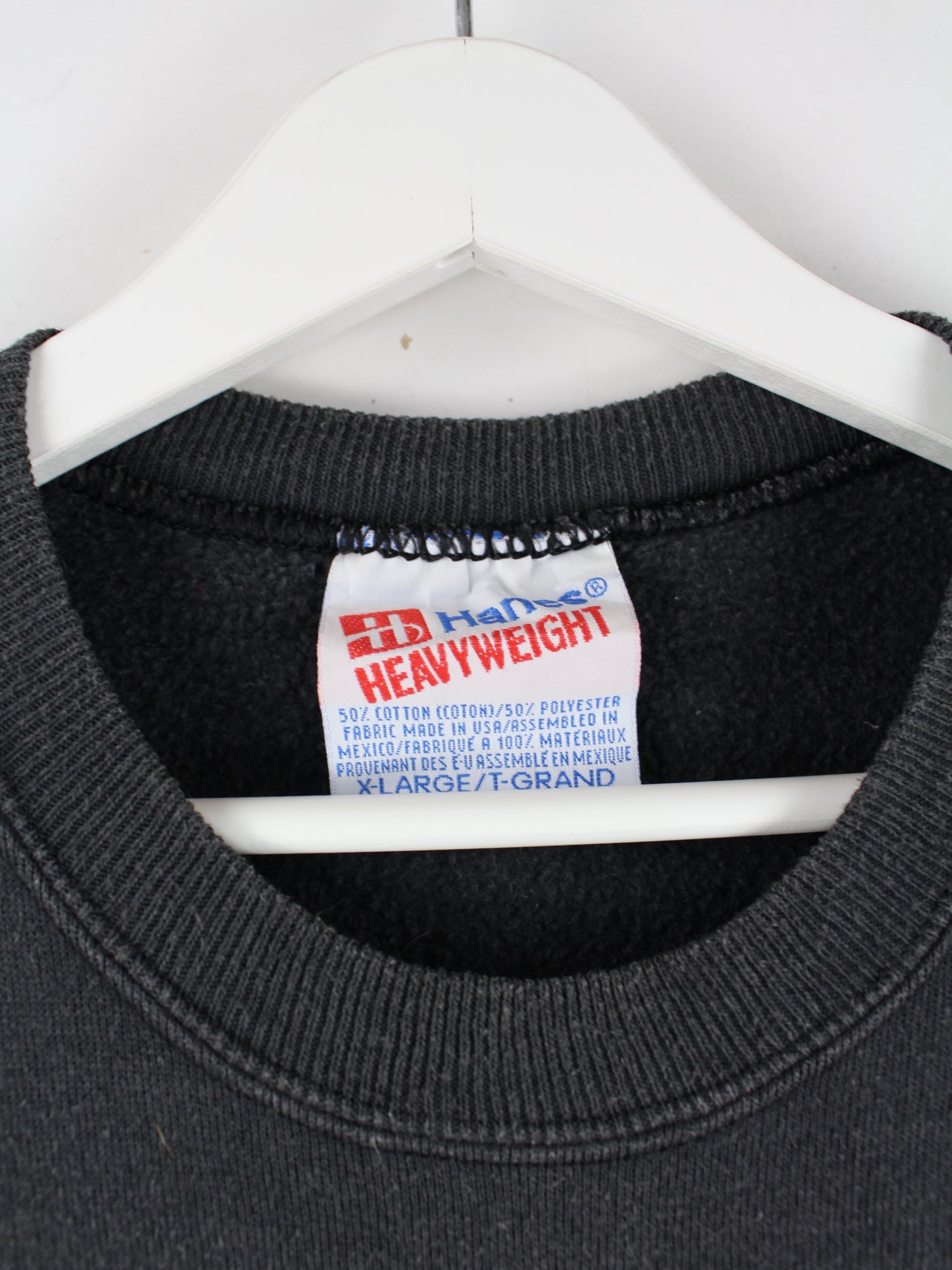 Schwarzer Sweater der Brand Hanes aus den 90'ern in Größe XL. Er ist aus einer Baumwollmischung angefertigt und in gutem Zustand auf Lager. Mit schickem Vintage Print.