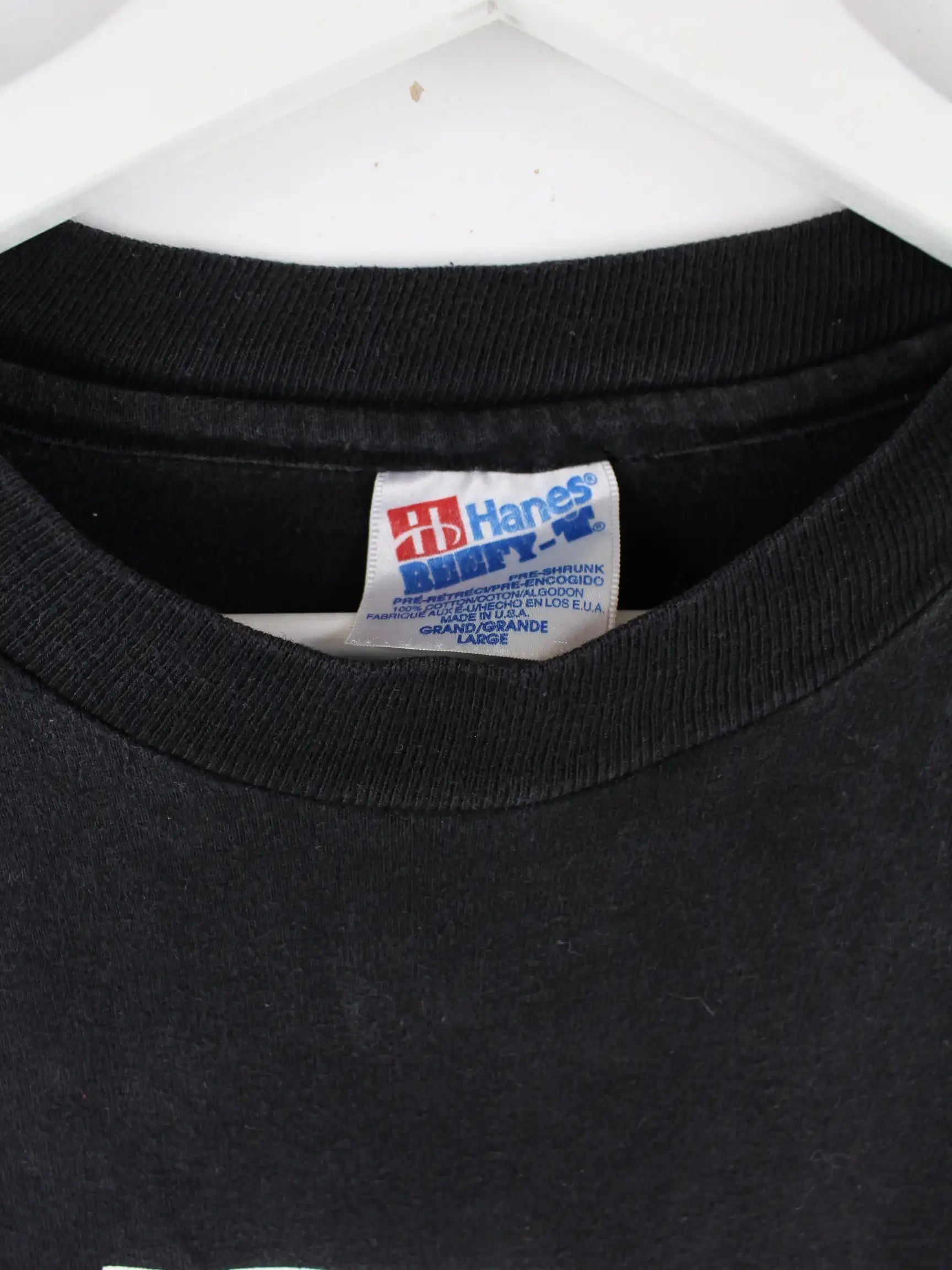 Schwarzes T-Shirt der Marke Hanes aus den 90'ern in Größe L. Es ist aus Baumwolle produziert und in gutem Zustand bei uns zu bekommen.