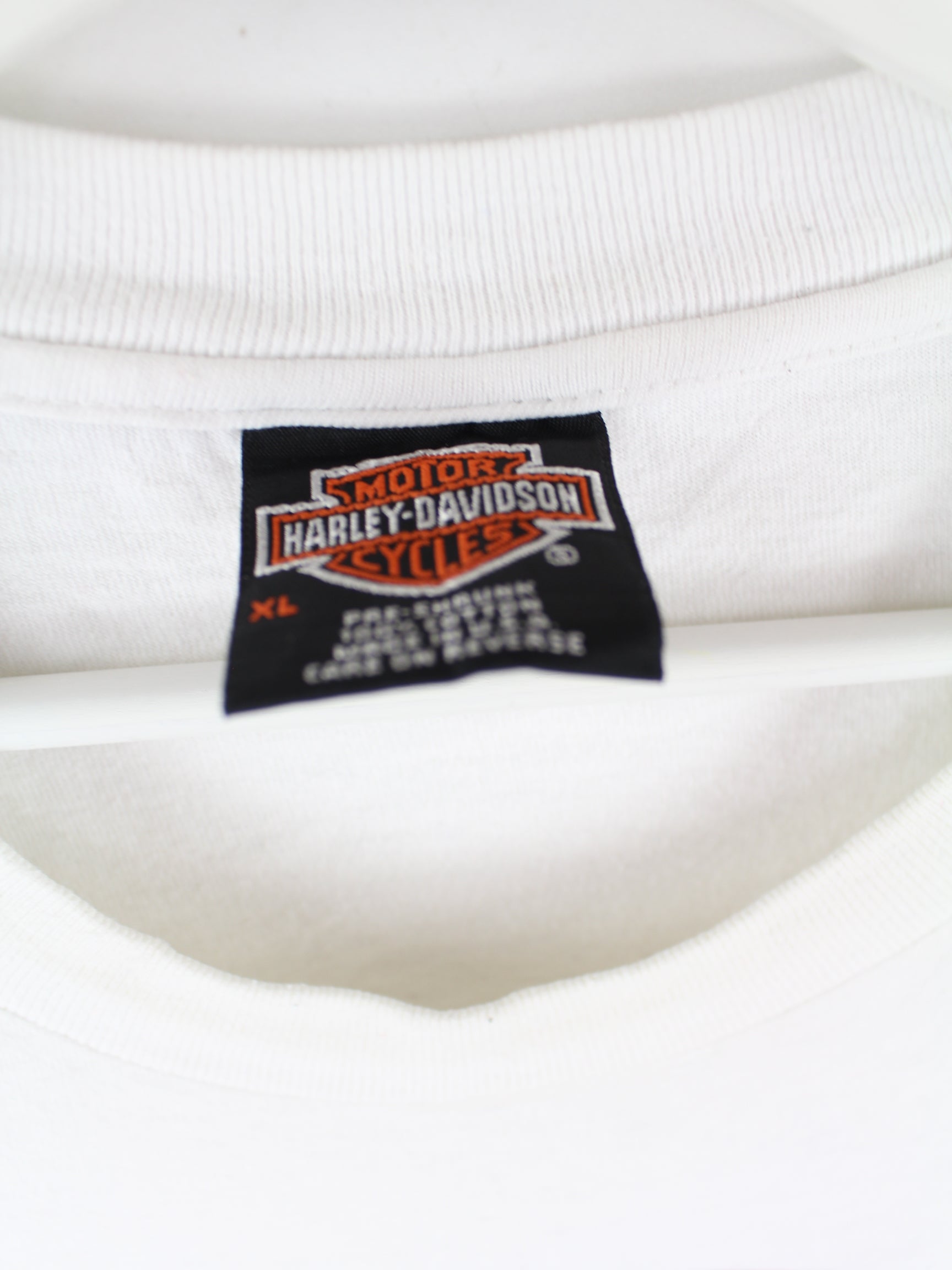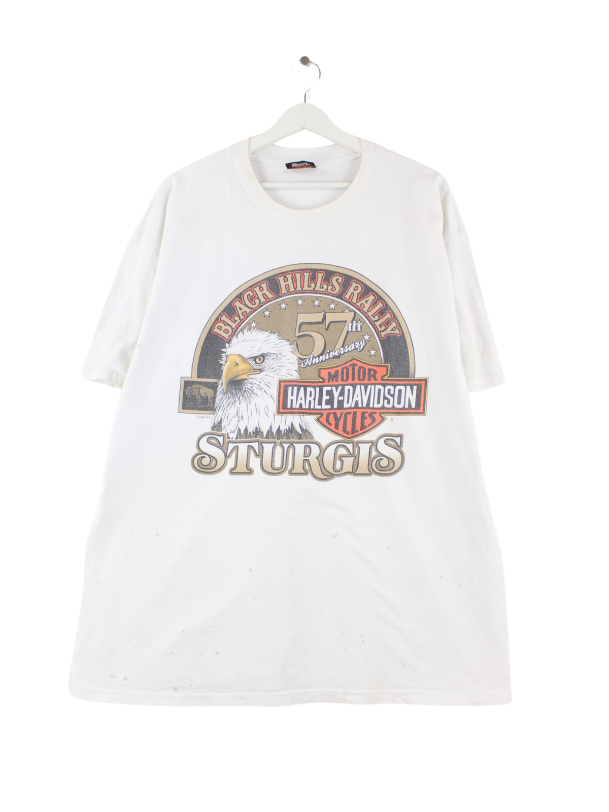 White T-shirt from the Harley Davidson label in size XL. It is made of cotton. We would describe the condition as 'fine' (see pictures). With rare Sturgies print.