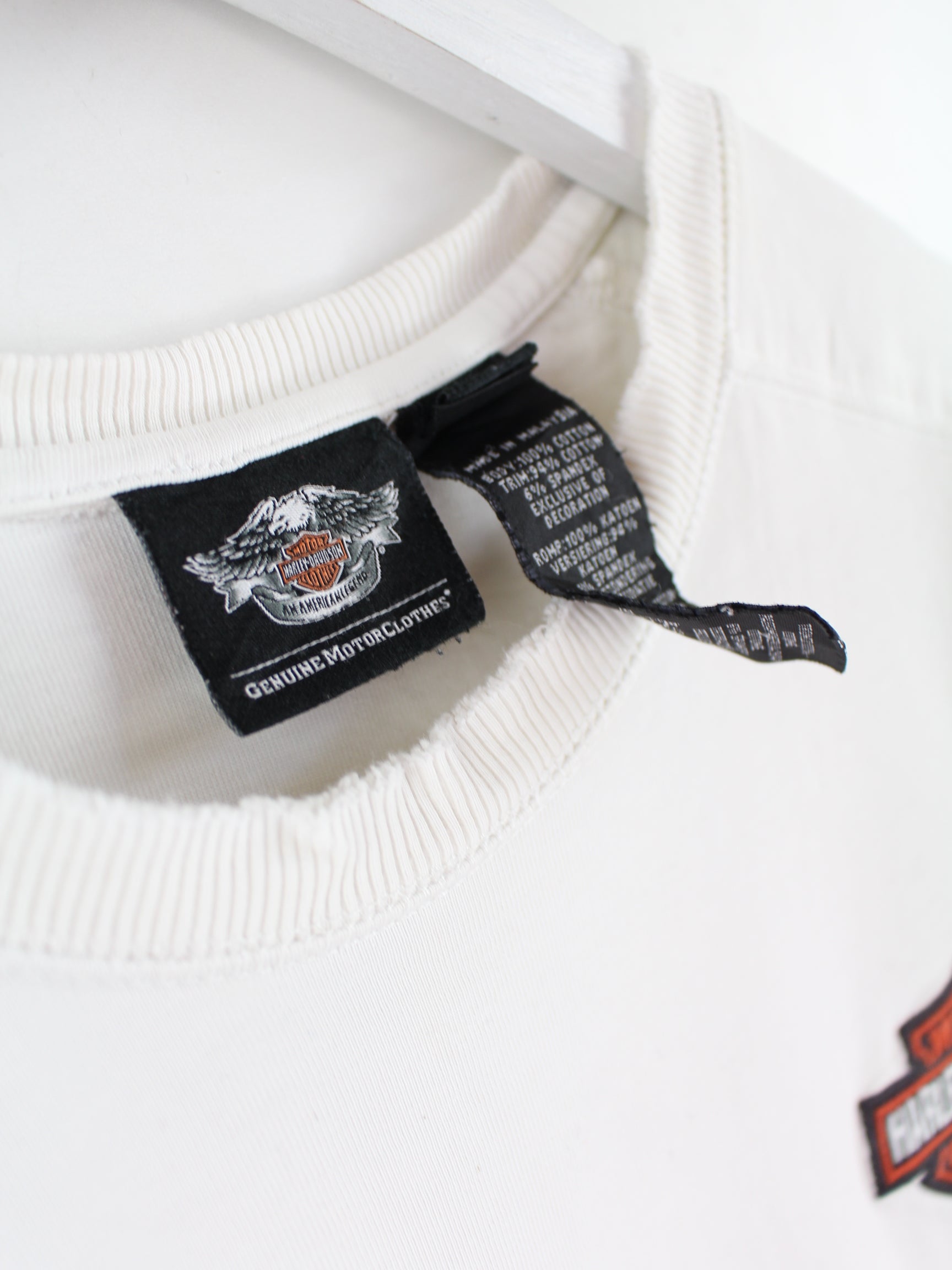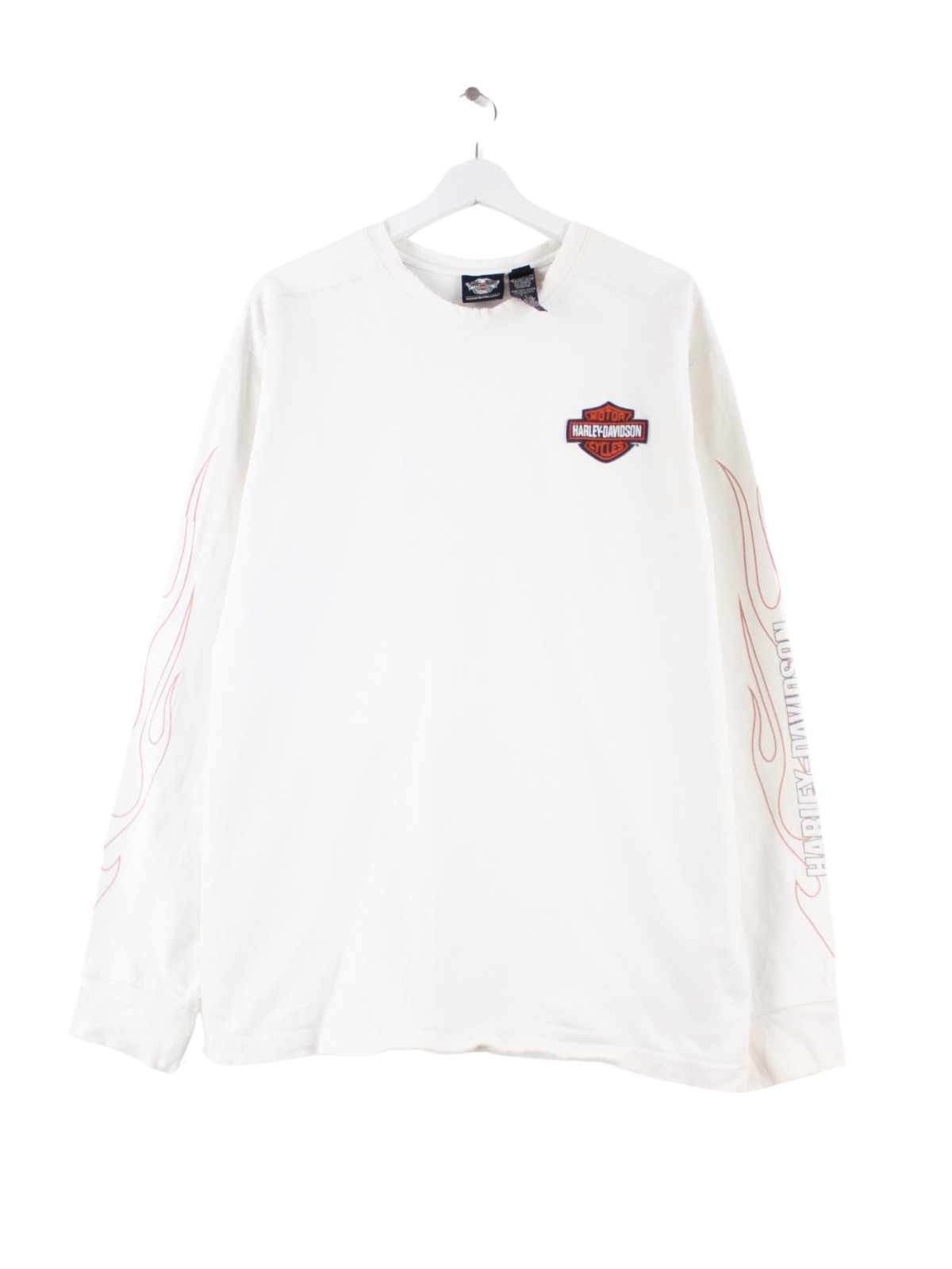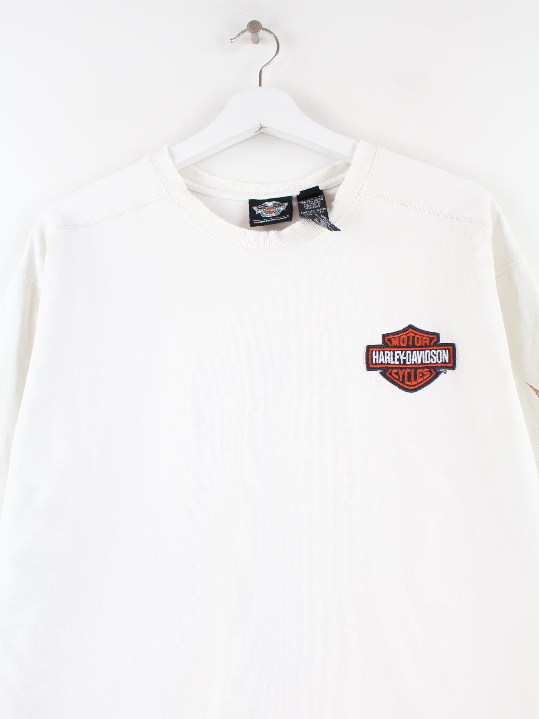 White sweatshirt with embroidered motifs from the Harley Davidson brand from the early 2000s in size XL. It is made from a cotton blend. We would describe the condition as 'fine' (see pictures).
