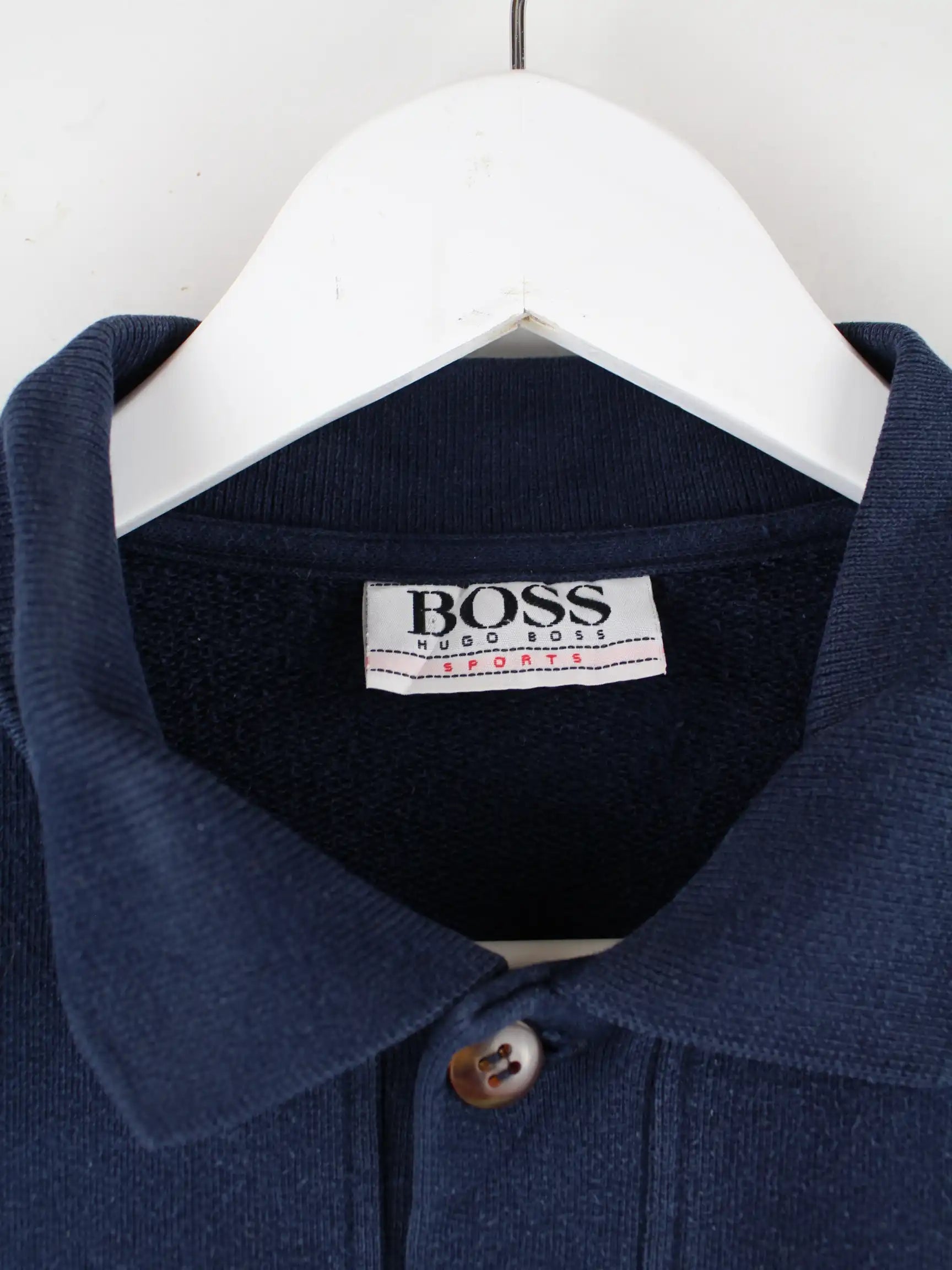 Blauer Sweater der Marke Hugo Boss aus den 80'ern in Größe M. Er ist aus einer Baumwollmischung gemacht und in sehr gutem Zustand im Bestand.
