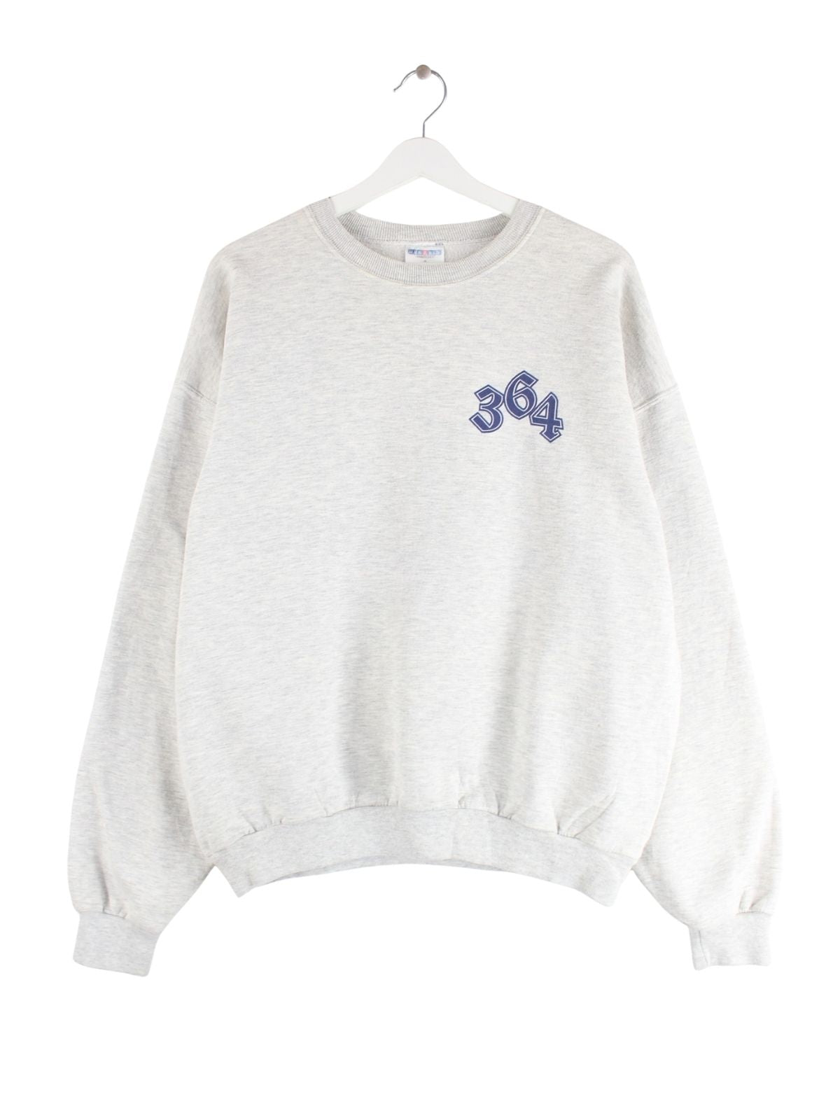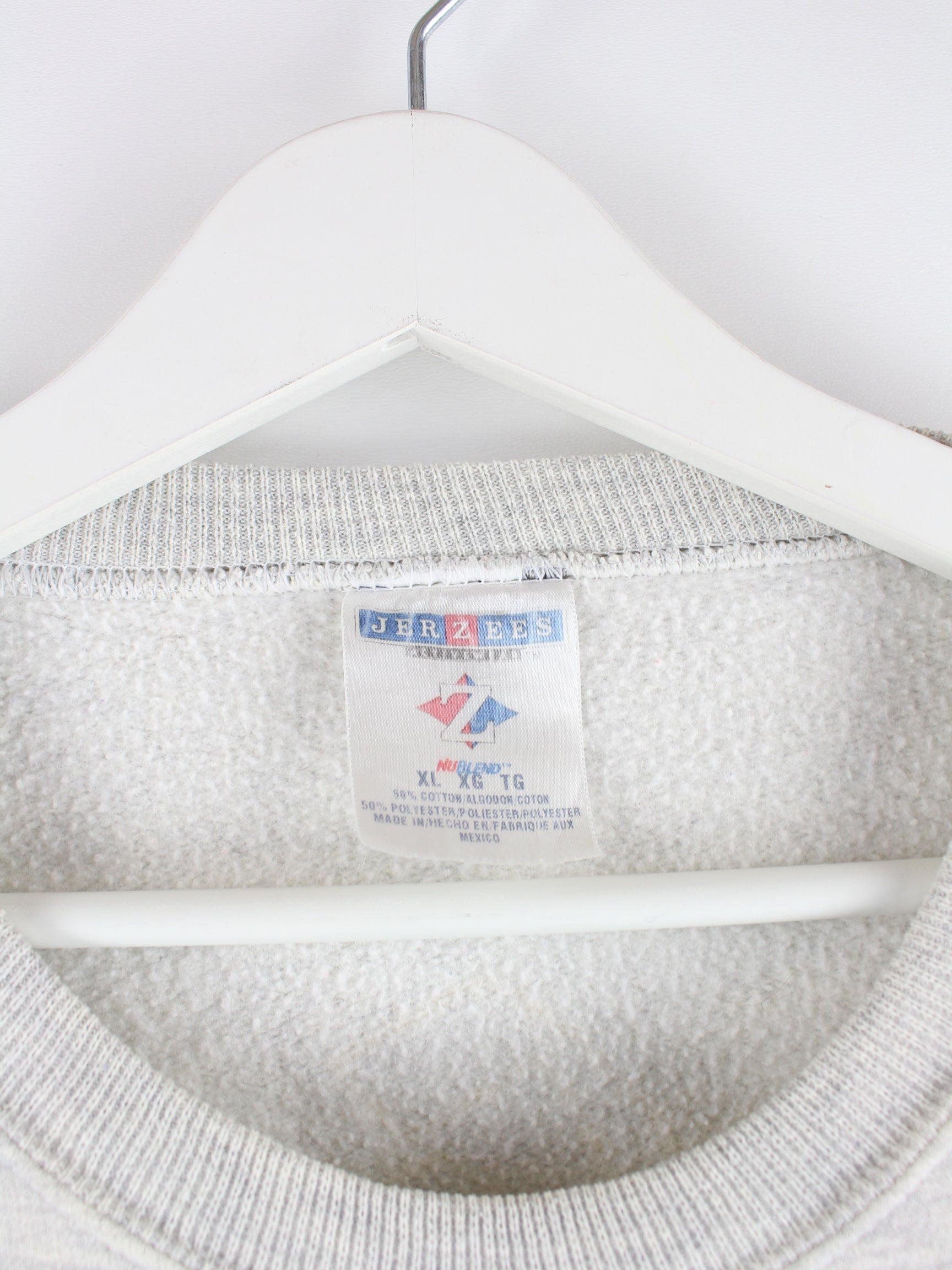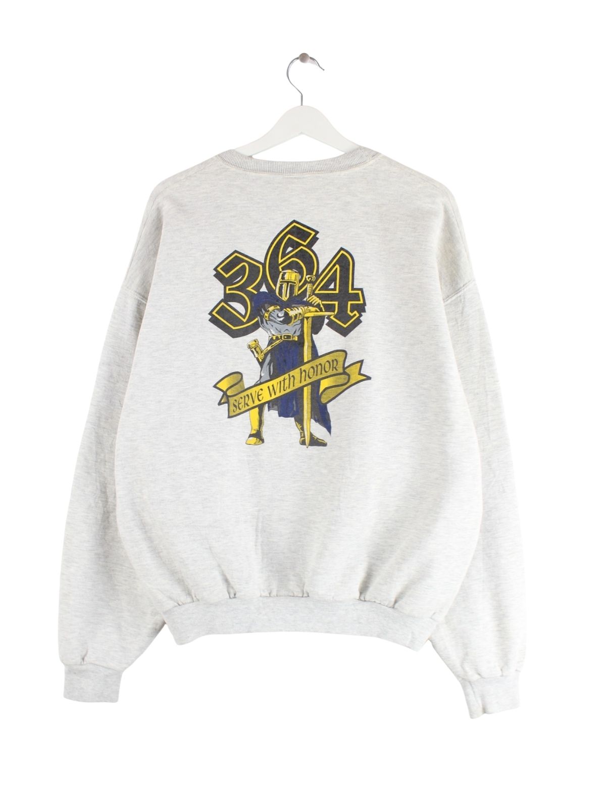 Grauer Sweater des Labels Jerzees aus den 90'ern in Größe XL. Er ist aus einer Baumwollmischung gefertigt und in gutem Zustand bei uns zu bekommen. Mit schickem Knight Print.
