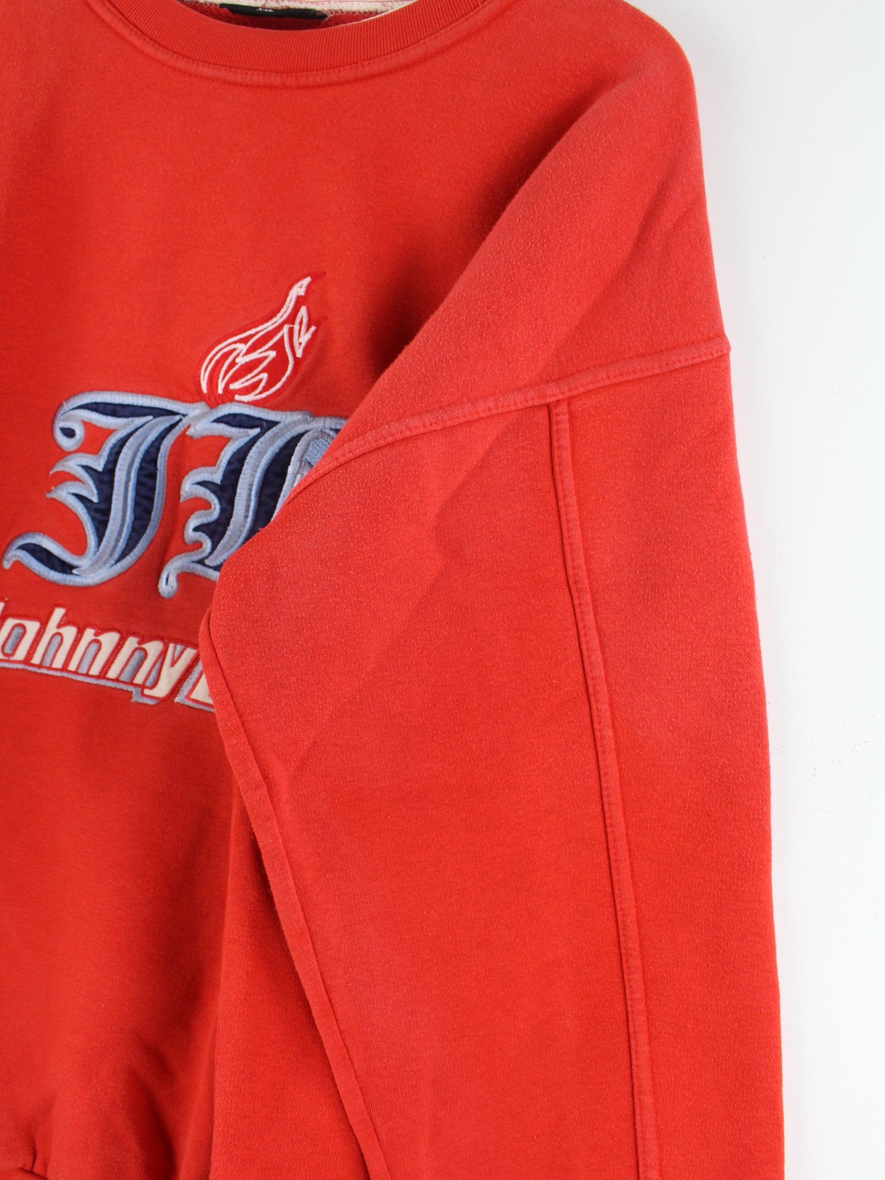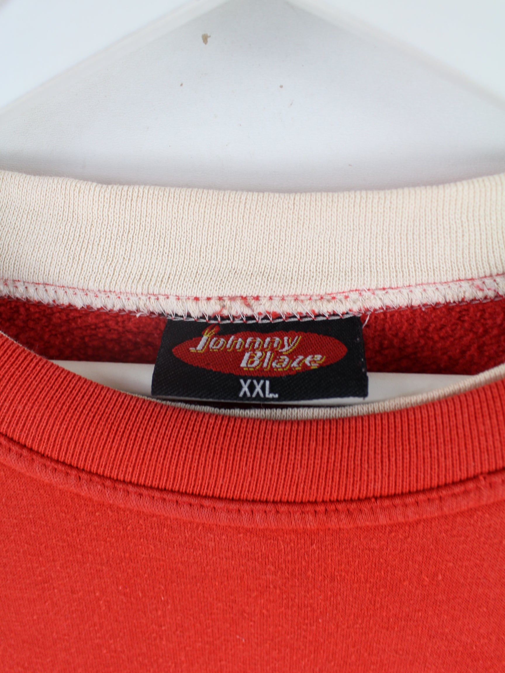 Sweater der Marke Johnny Blaze mit gestickten Motiven in Größe XXL aus den 90'ern. Er ist aus einer Baumwollmischung und in Rot in Stock.