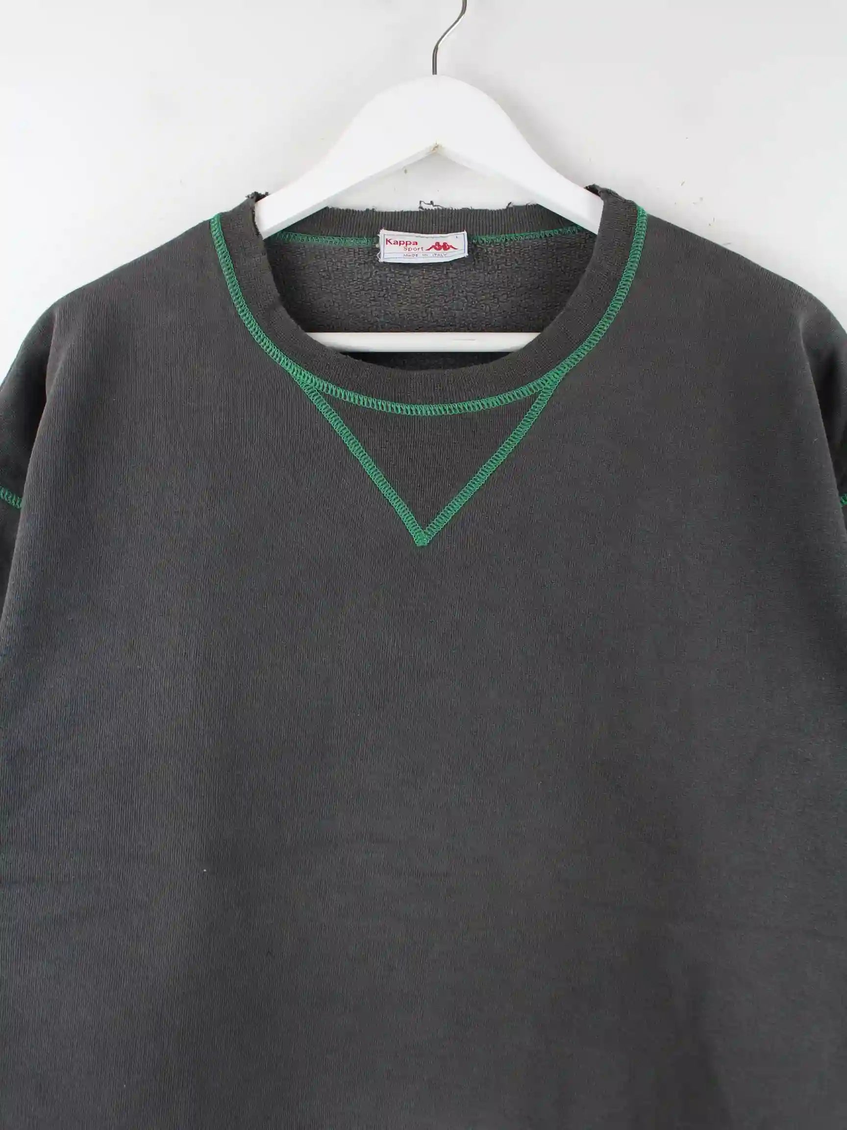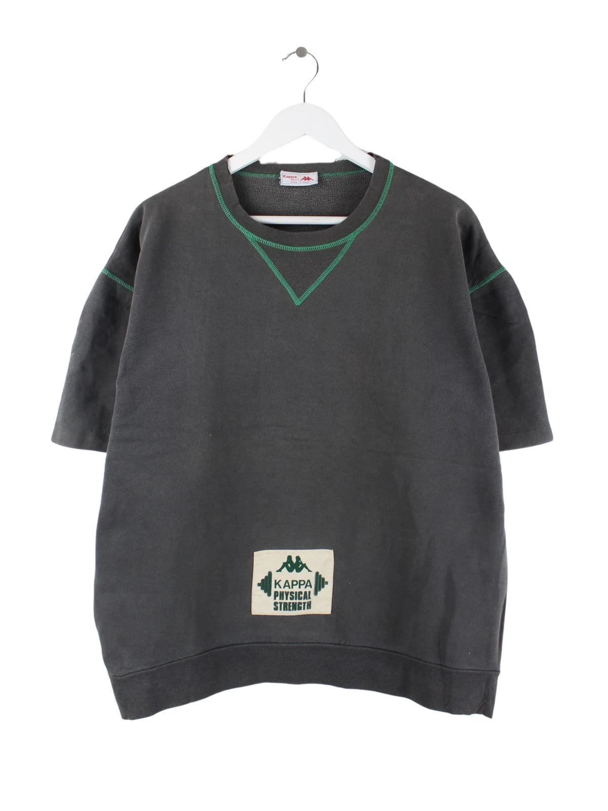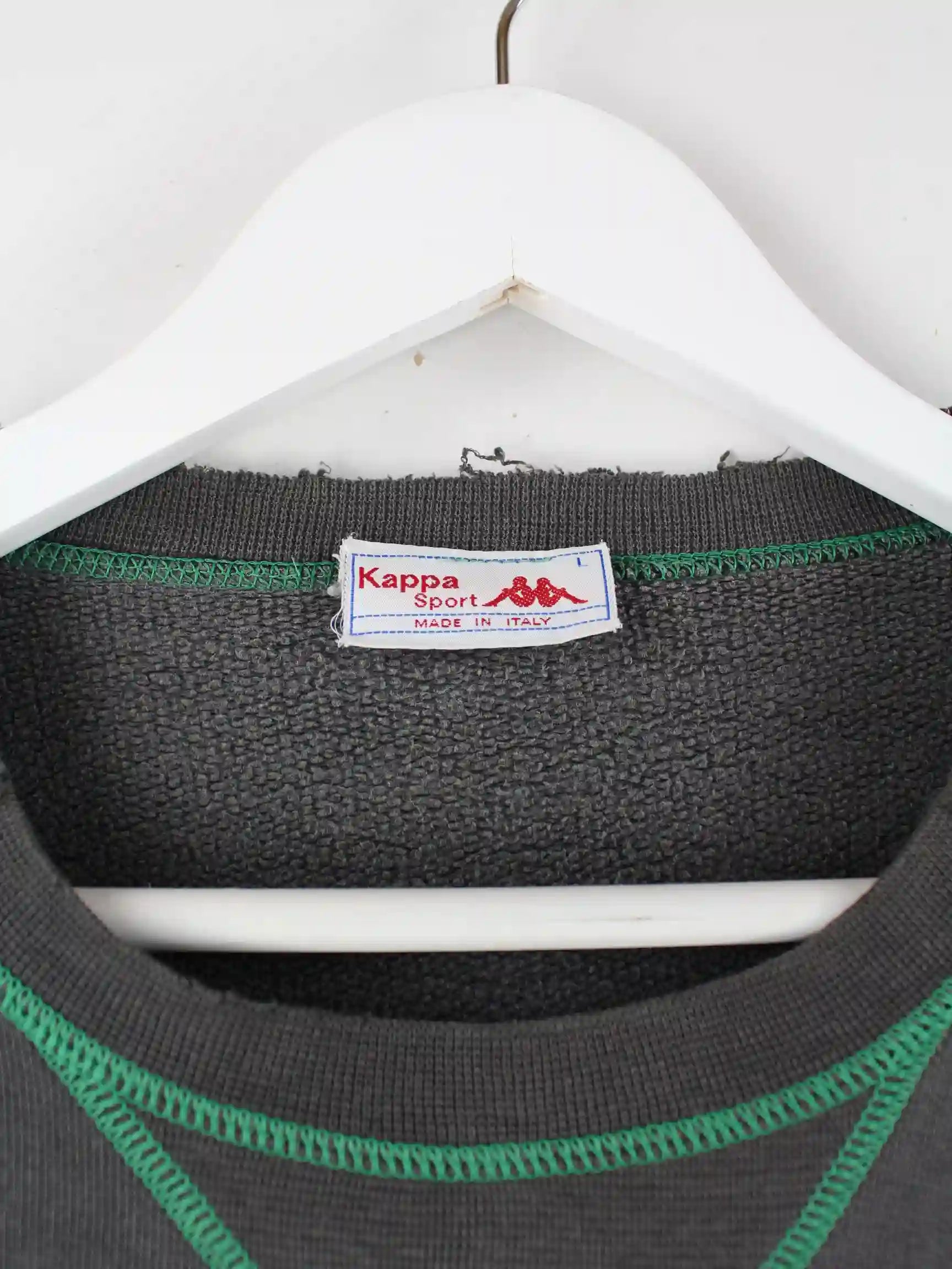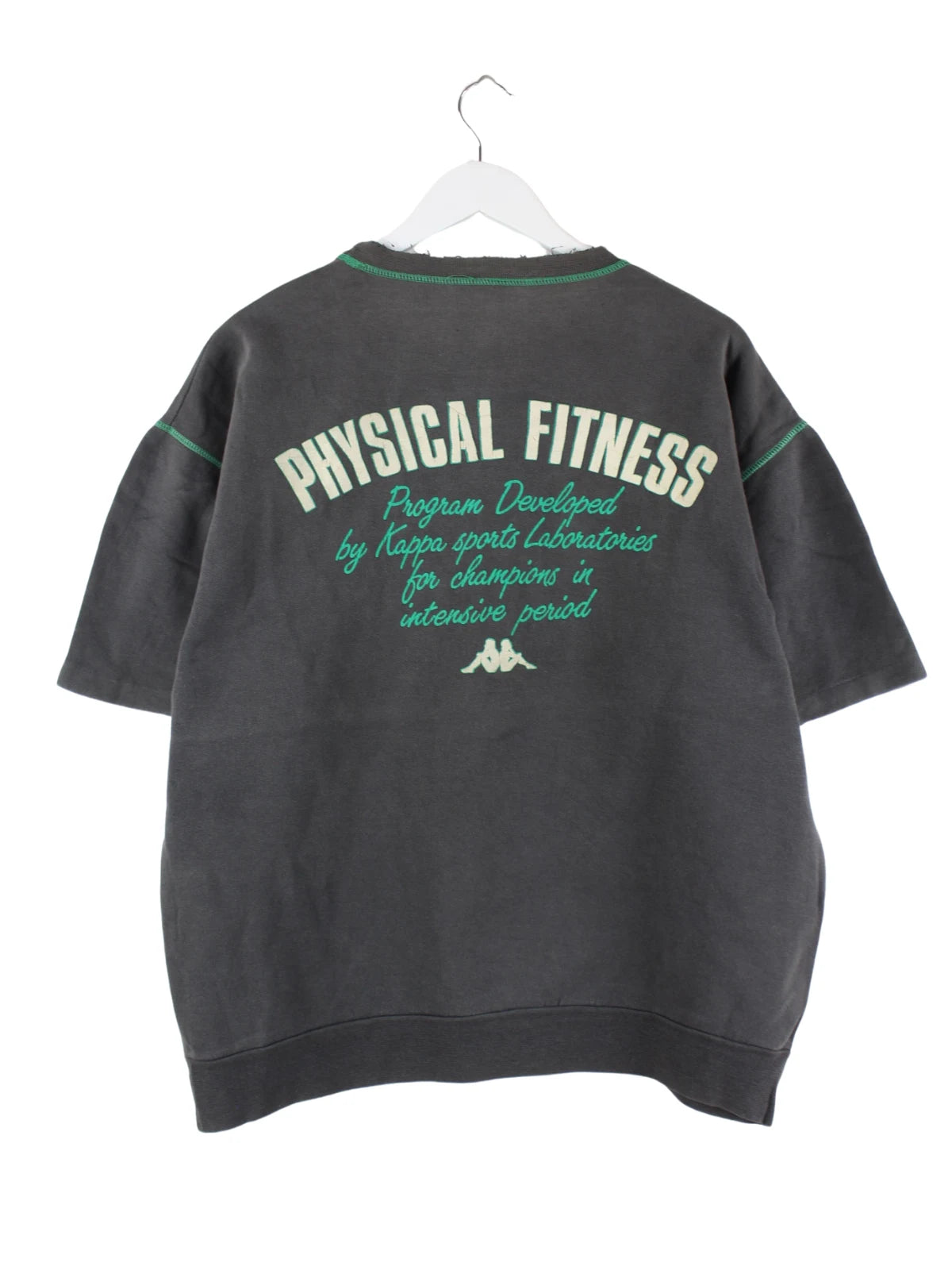 T-Shirt des Labels Kappa in Größe L aus den 80'ern. Es ist aus Baumwolle angefertigt und in Grau lieferbar. Mit seltenem Vintage Print.