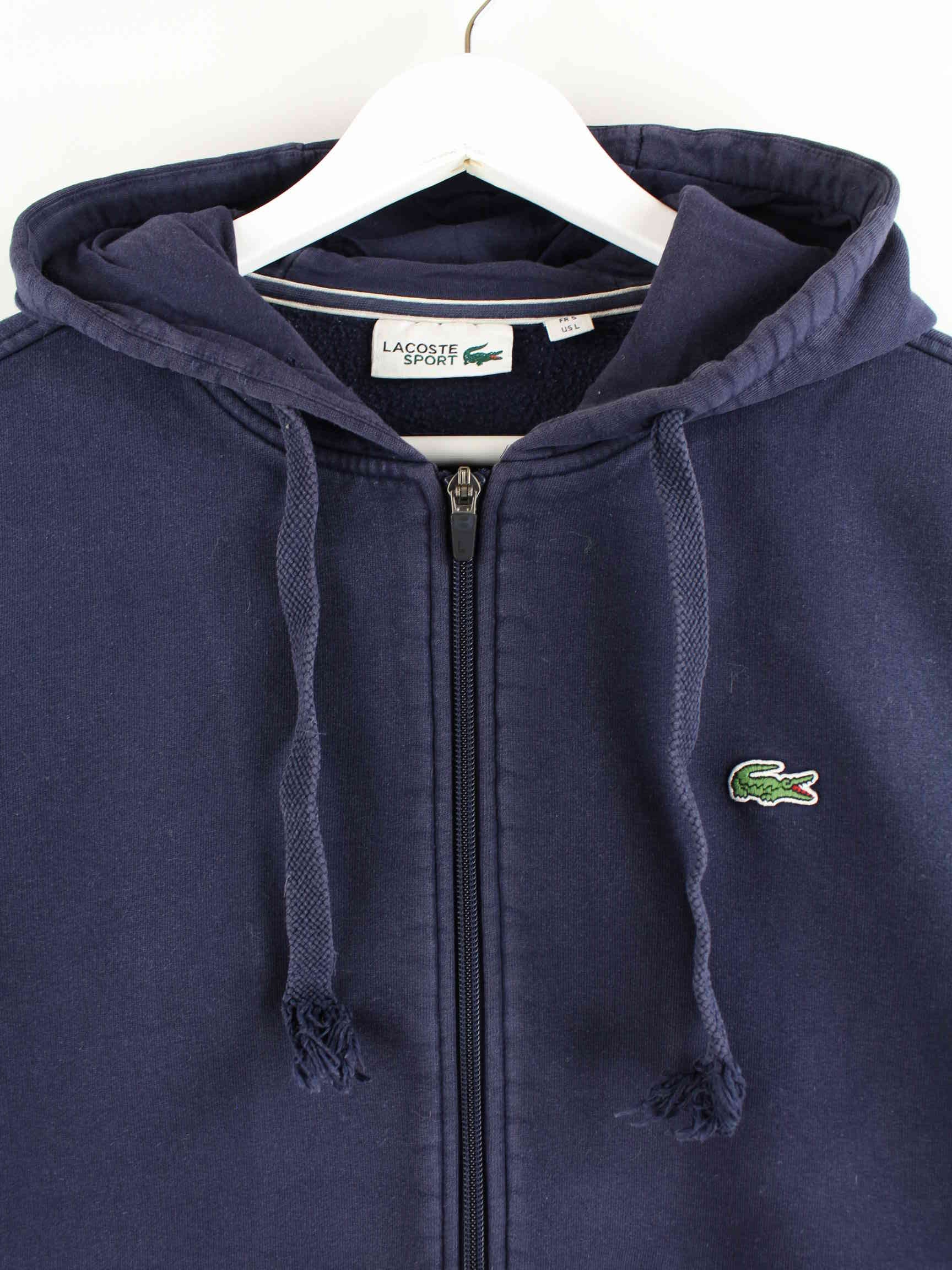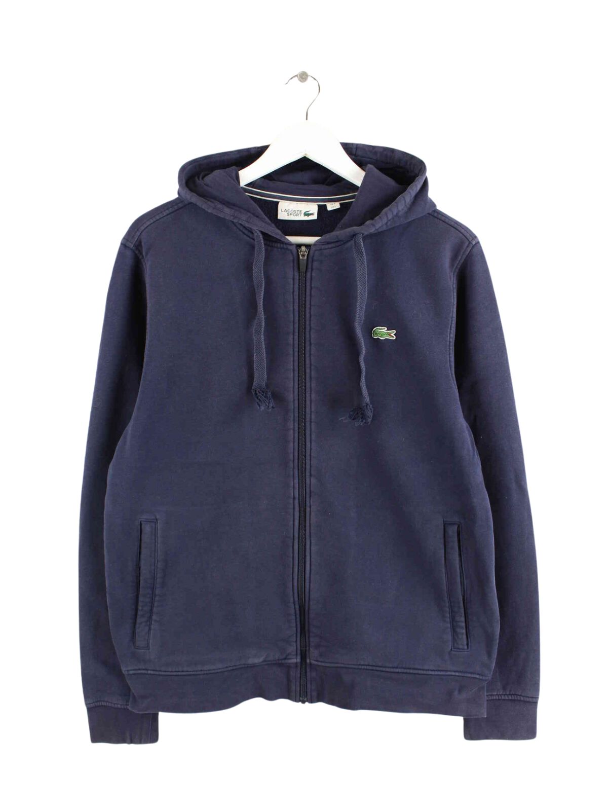 Hoodie from the Lacoste brand with a zipper in size S. It is made from a cotton blend and is available in blue.