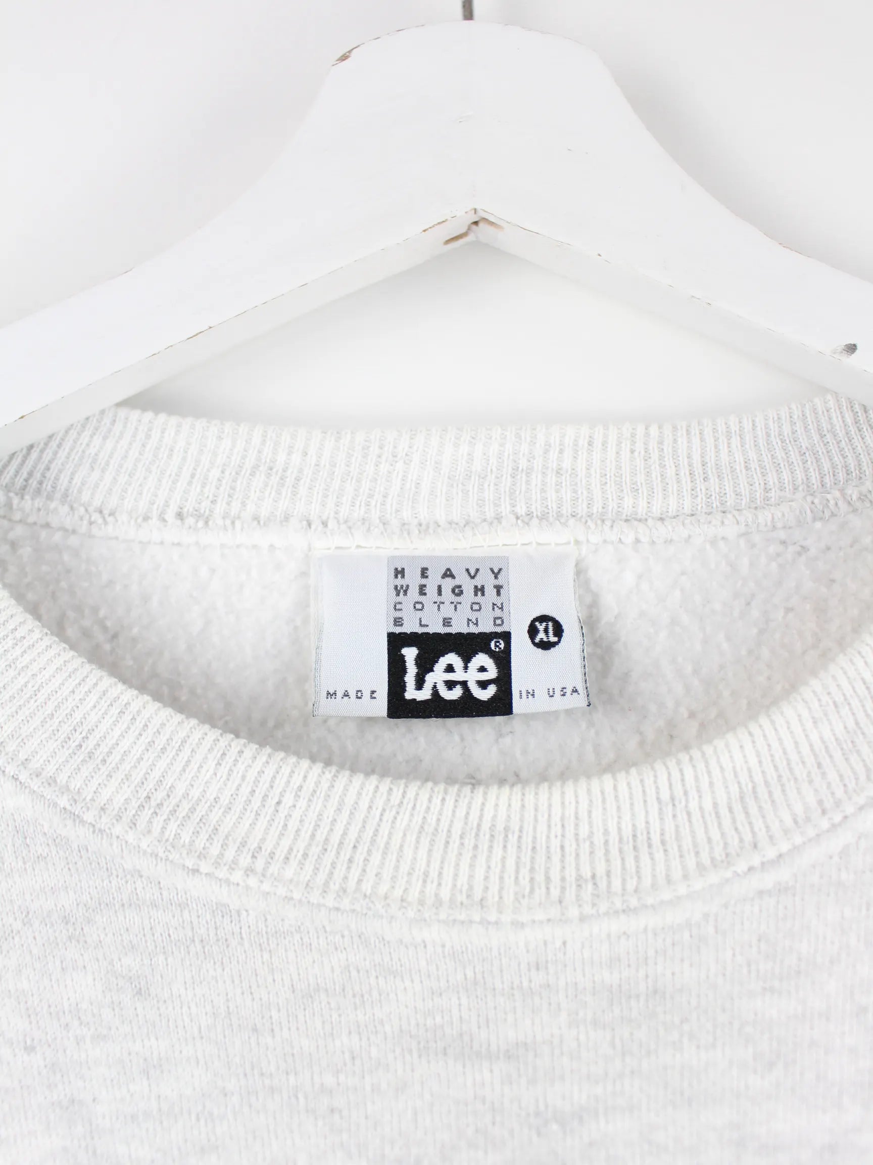 Grauer Sweater vom Label Lee aus den 90'ern in Größe XL. Er ist aus einer Baumwollmischung angefertigt und in gutem Zustand bei uns zu bekommen. Mit seltenem Tiger Print.