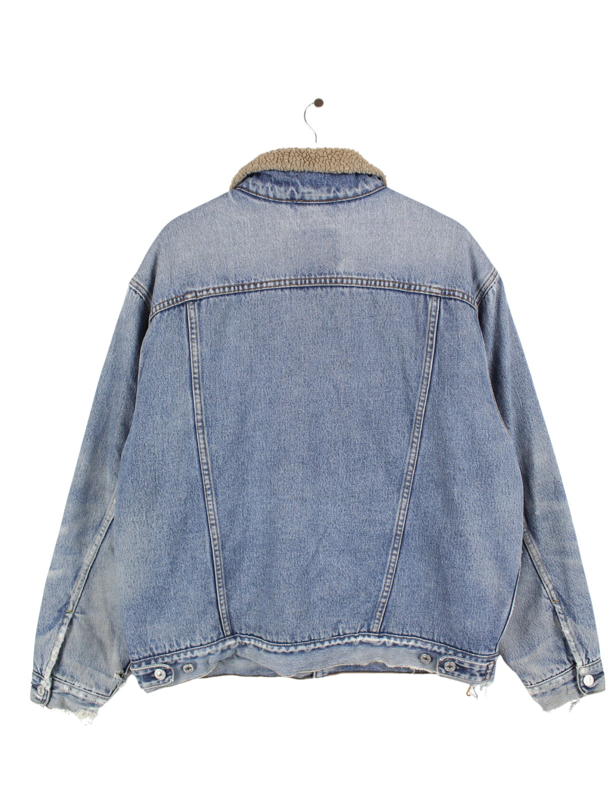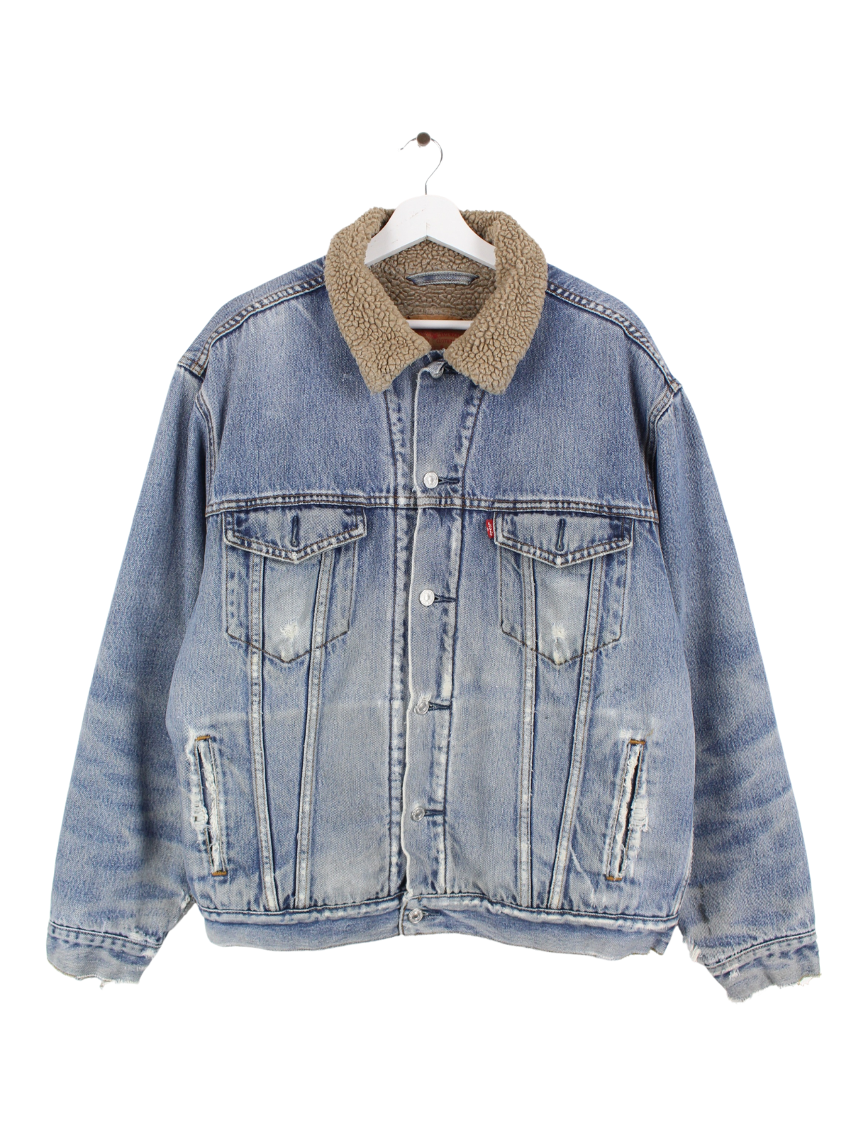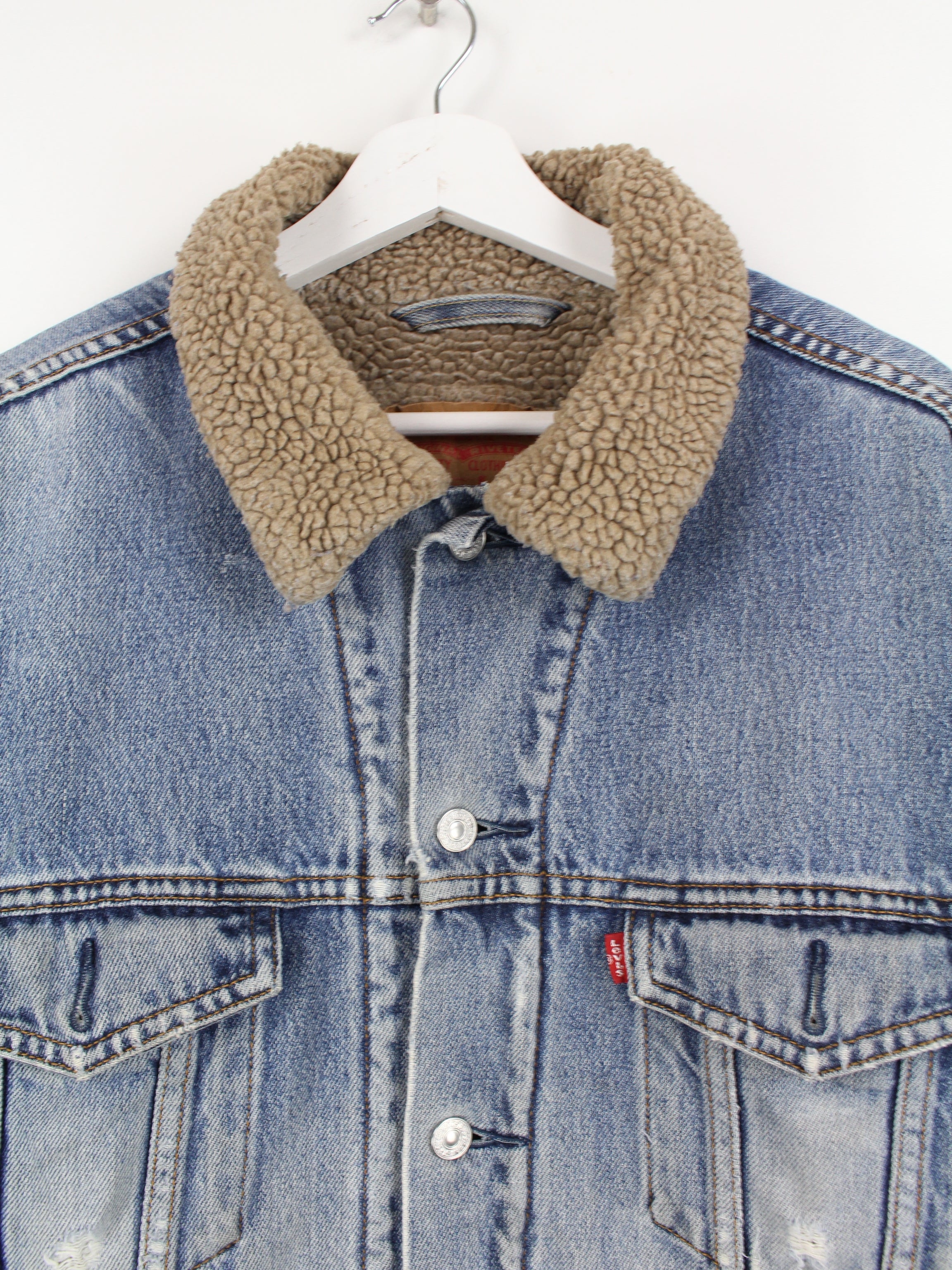 Blue vintage denim jacket with a fur collar, from the Levis brand.