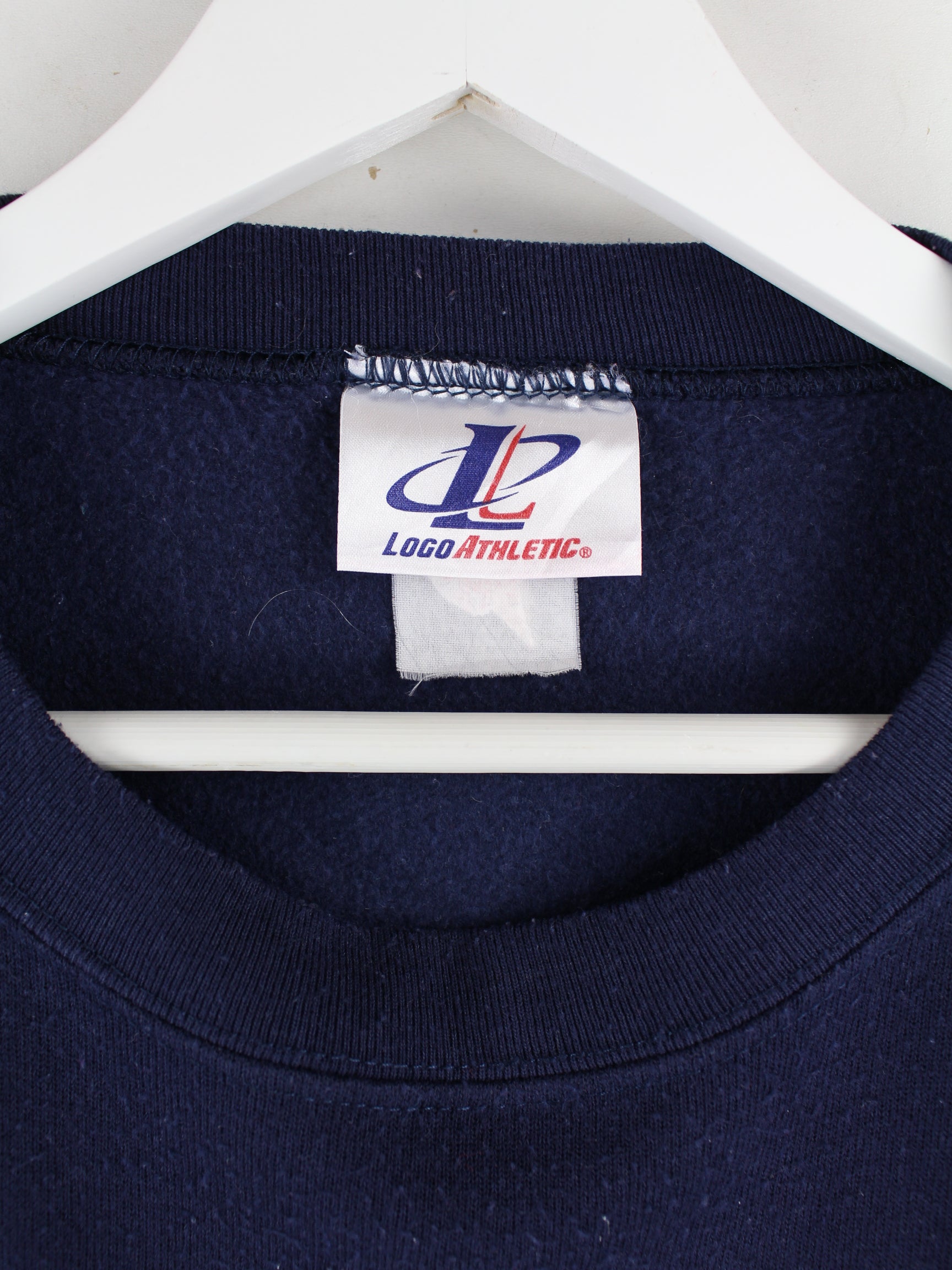 Blue sweater with embroidered motifs from the 90's label Logo Athletic in size XL. It is made from a cotton blend and is in good condition.