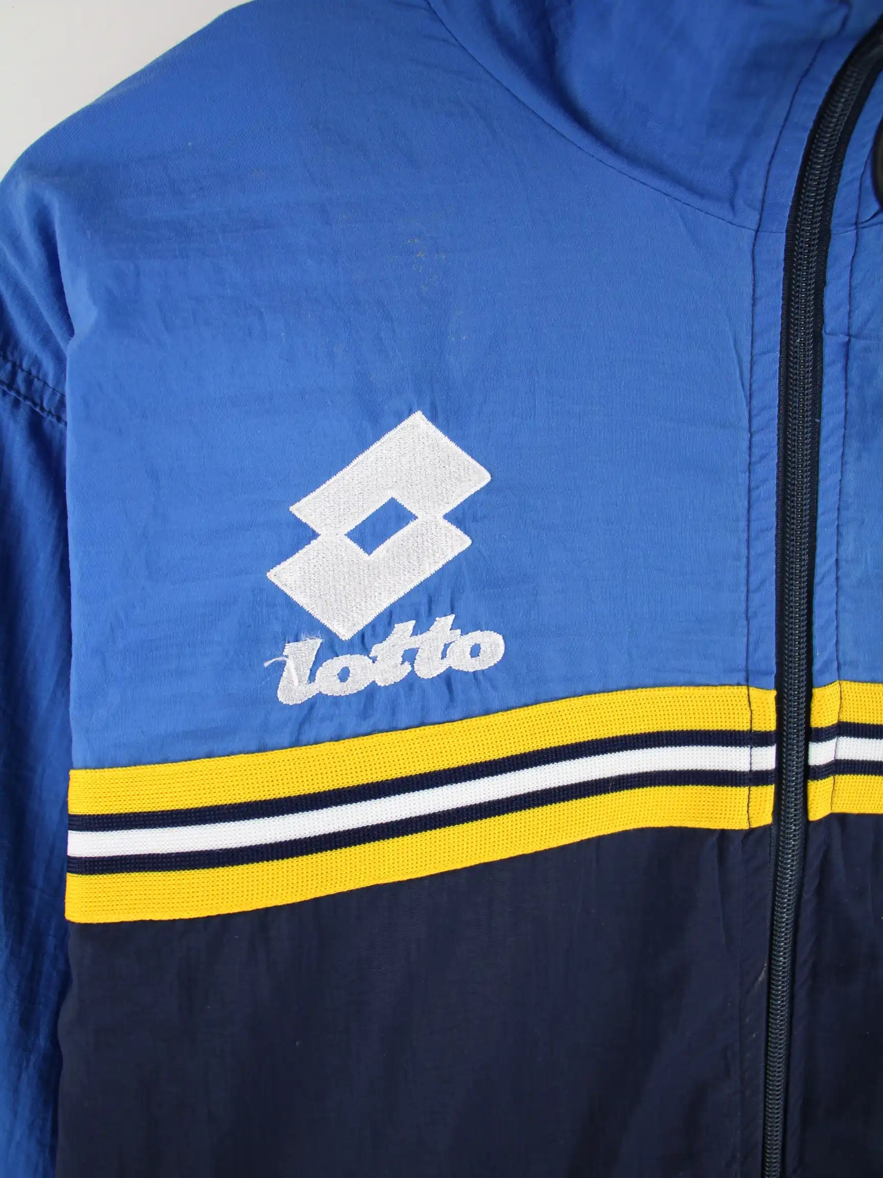 Trainingsjacke von Lotto in Größe M aus den 90'ern. Sie ist aus Synthetik und in Blau lieferbar. Mit tollem Vintage Print.