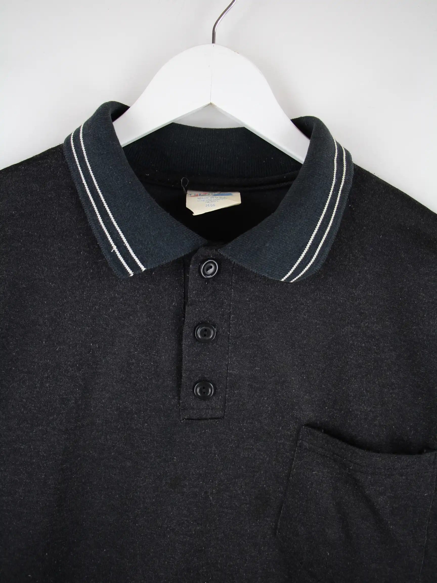 Poloshirt vom Brand Majestic in Größe M aus den 90'ern. Es ist aus Baumwolle hergestellt und in Schwarz bei uns zu bekommen.