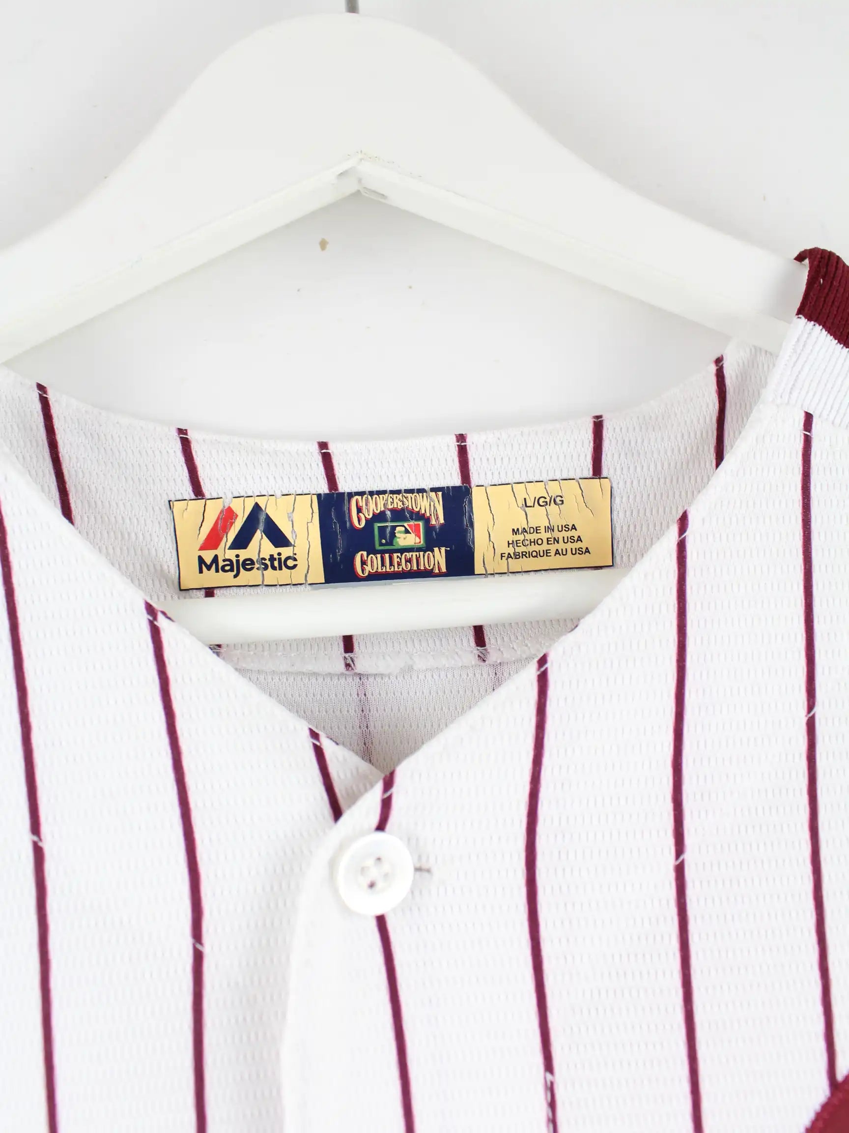 Weißer Jersey der Brand Majestic in Größe L. Es ist aus Synthetik produziert und in sehr gutem Zustand bei uns zu bekommen.