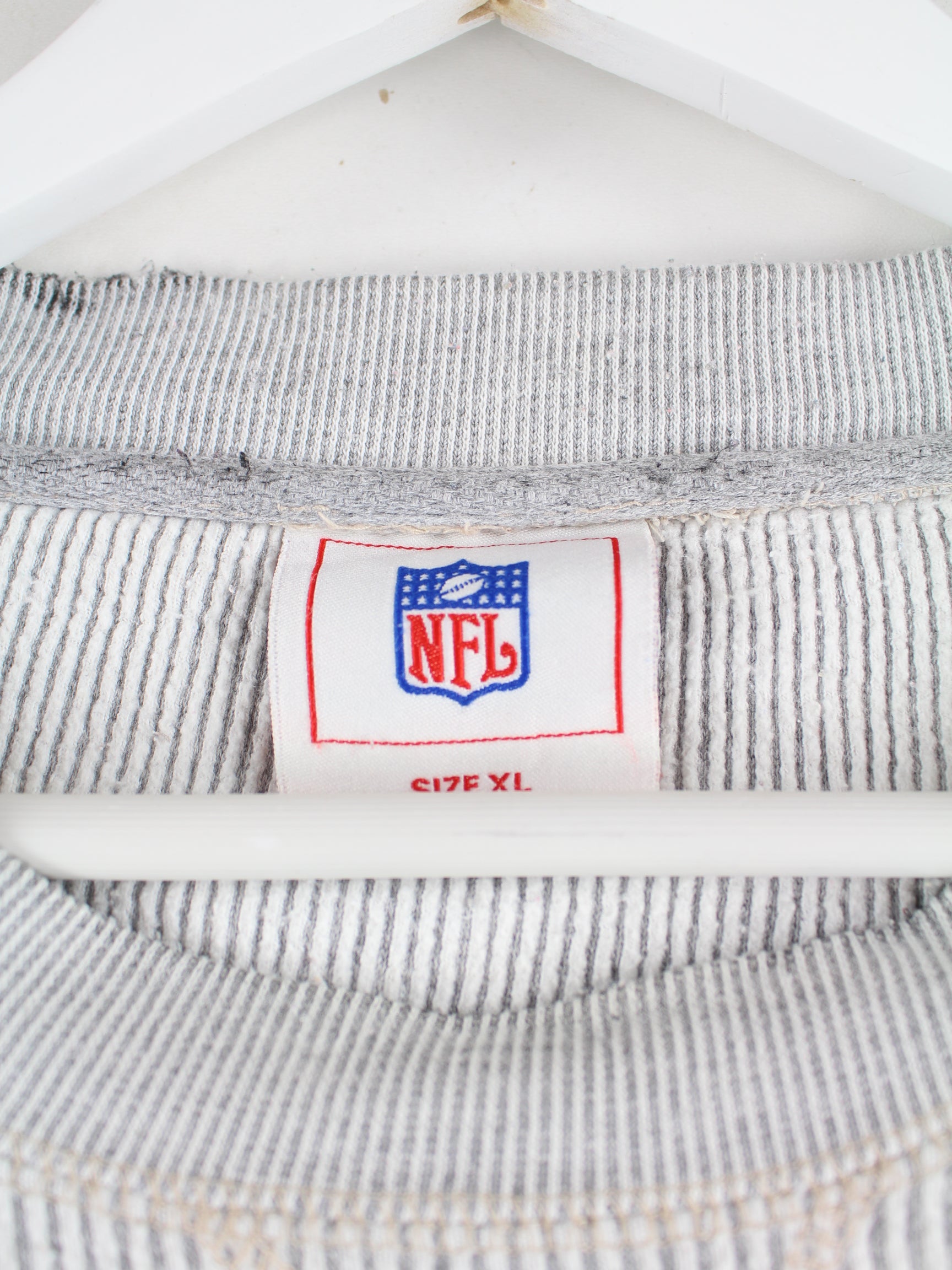 NFL brand sweater in size XL from the 90's. It is made from a cotton blend and comes in grey.
