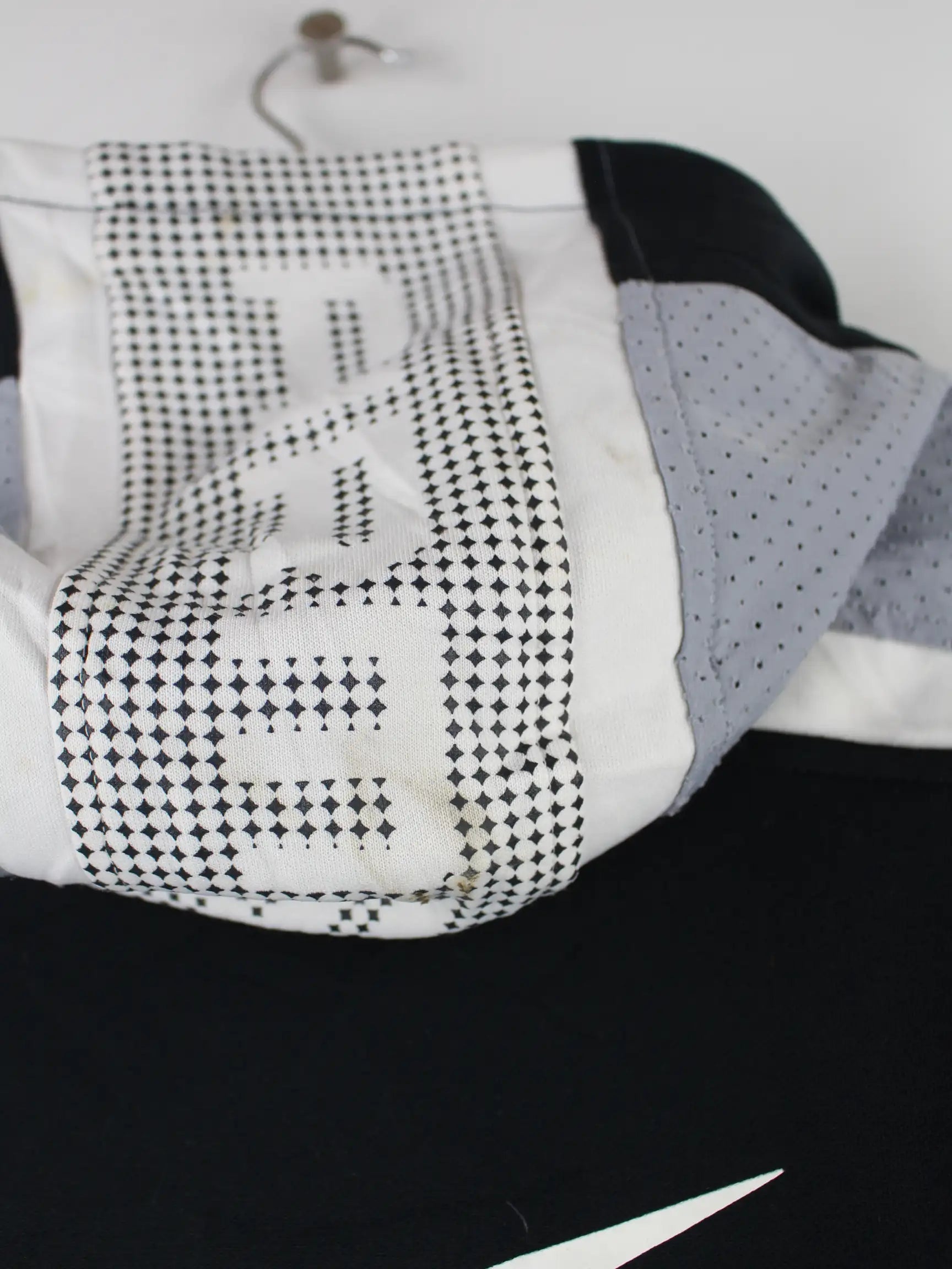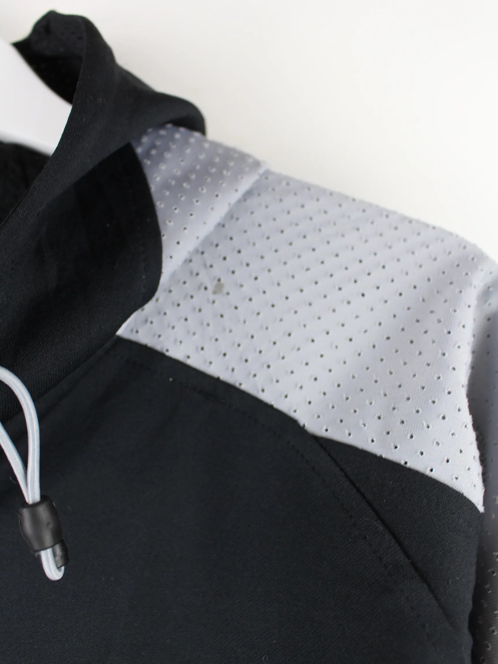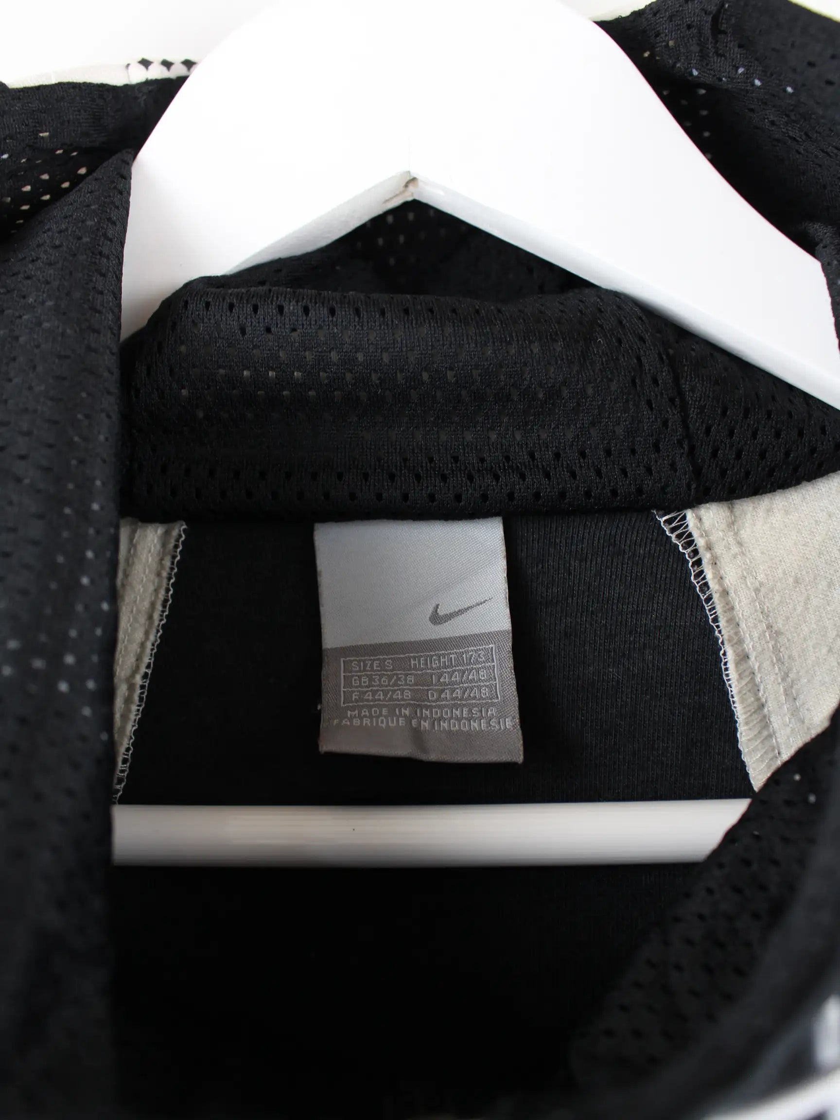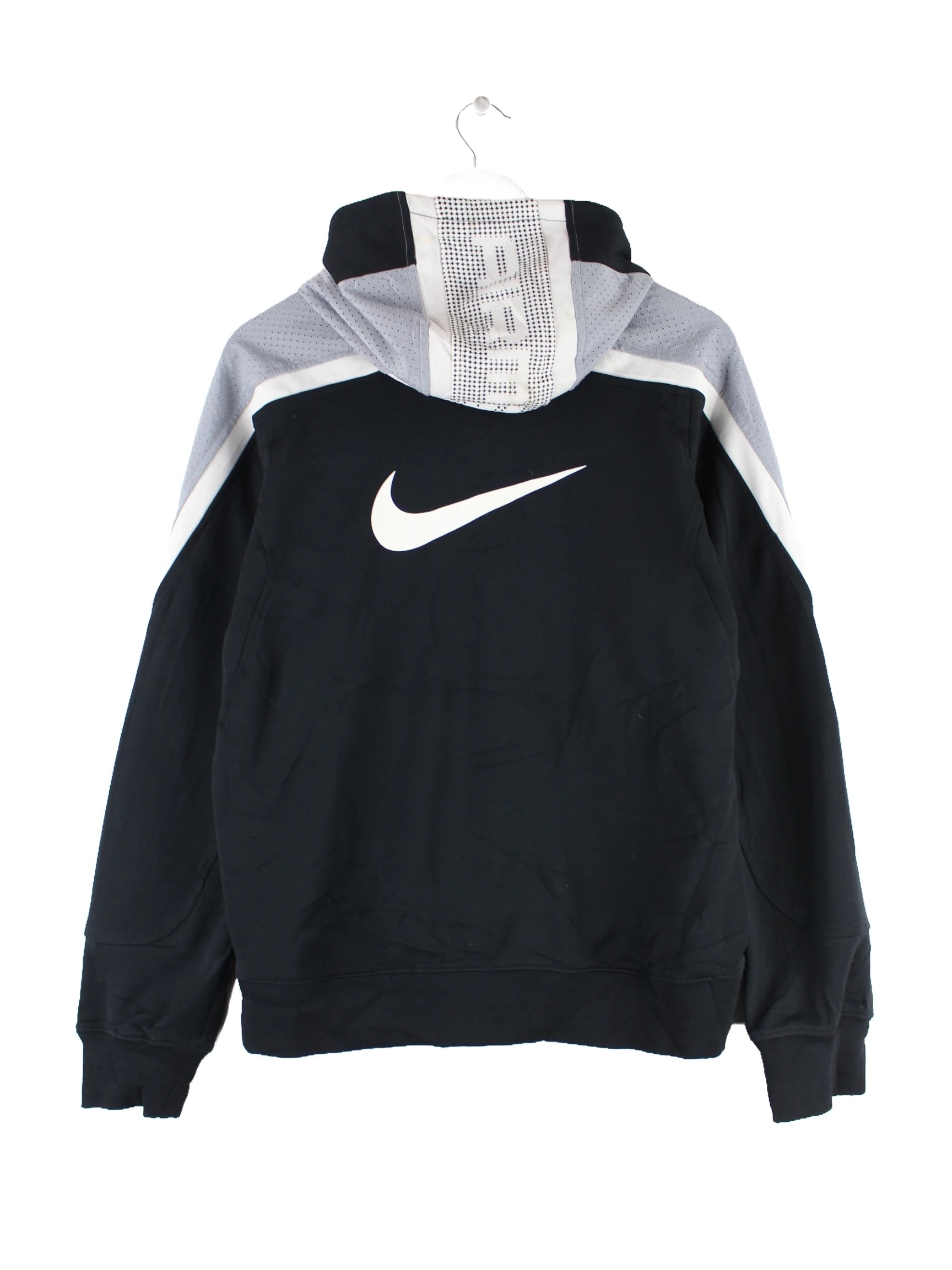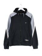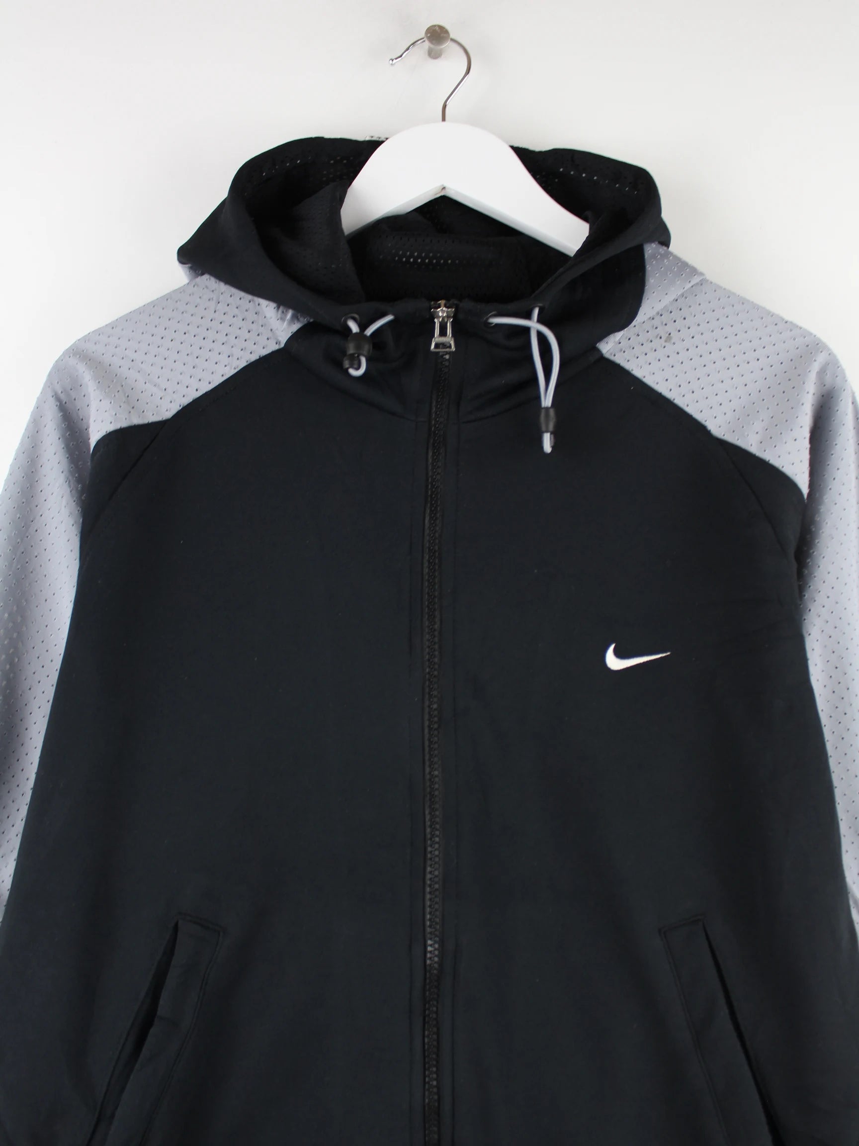 Schwarzer Hoodie mit durchgehendem Reißverschluß des Labels Nike in Größe S. Er ist aus Synthetik produziert und in gutem Zustand lieferbar.