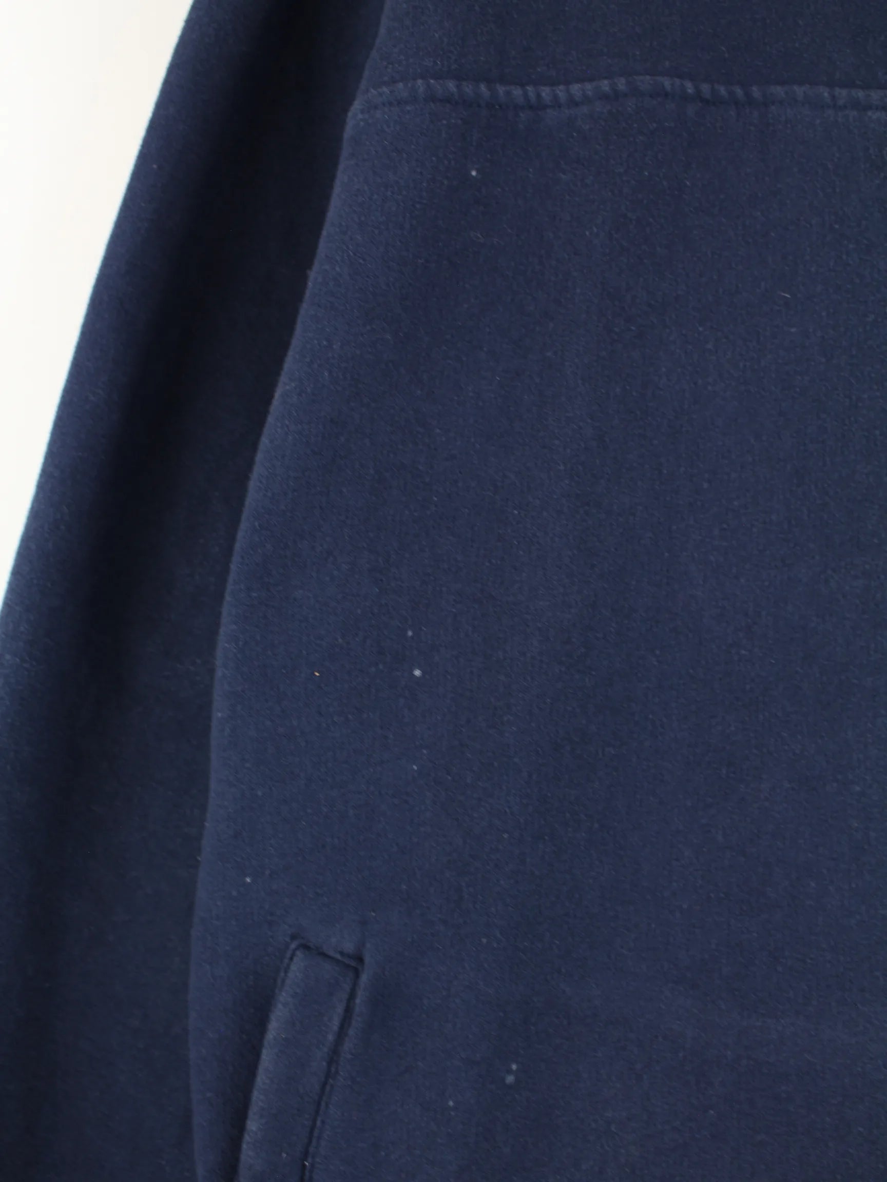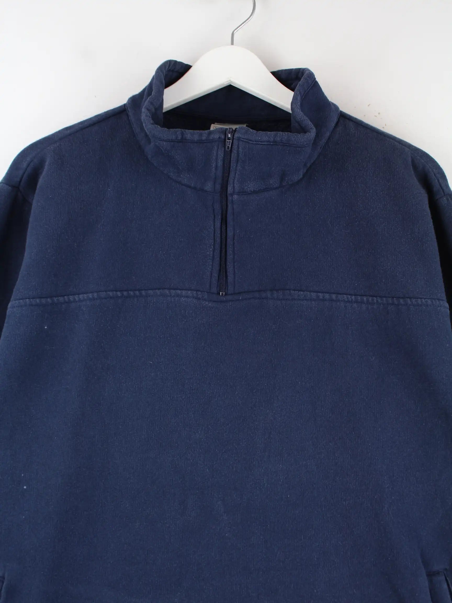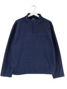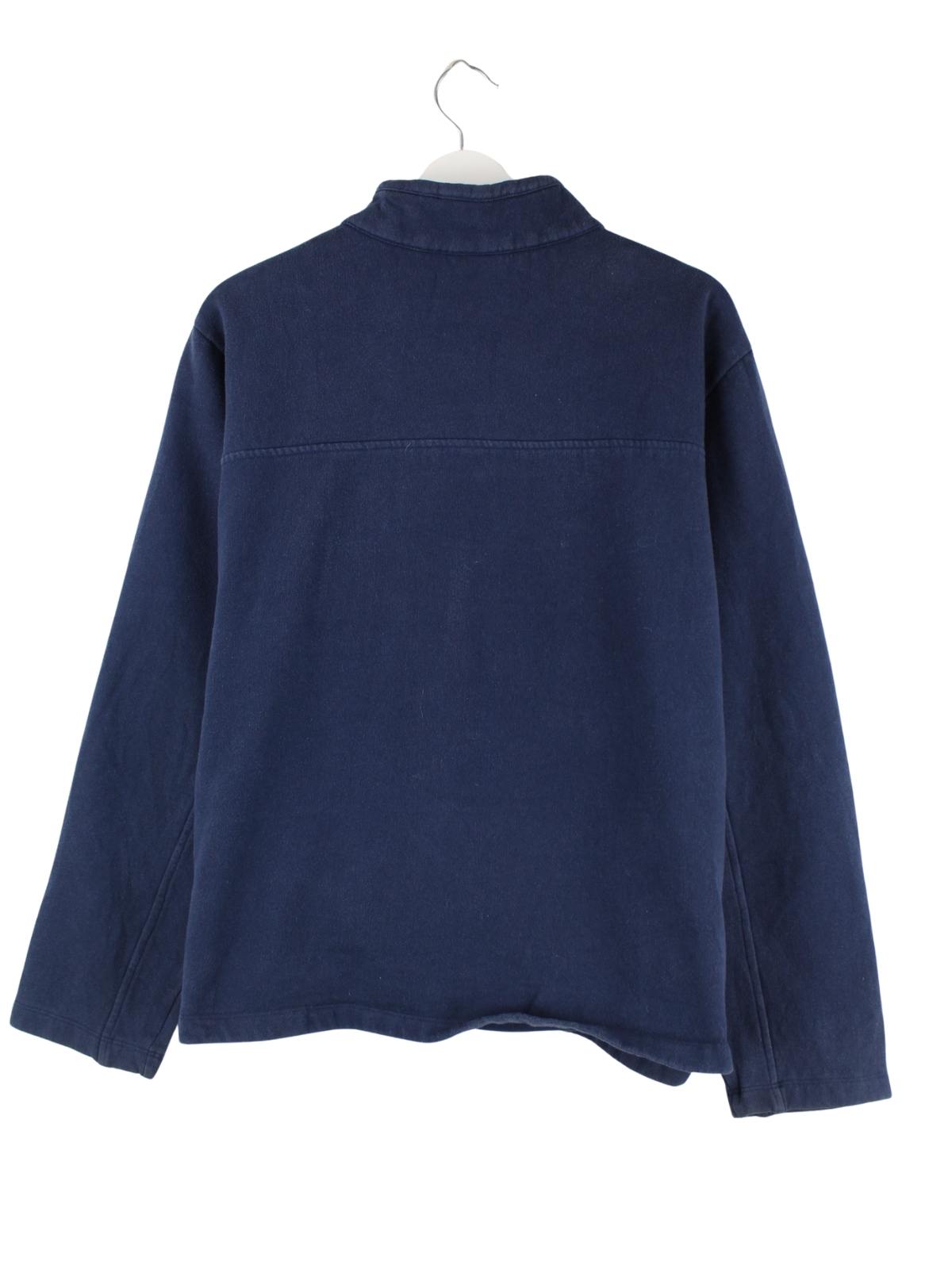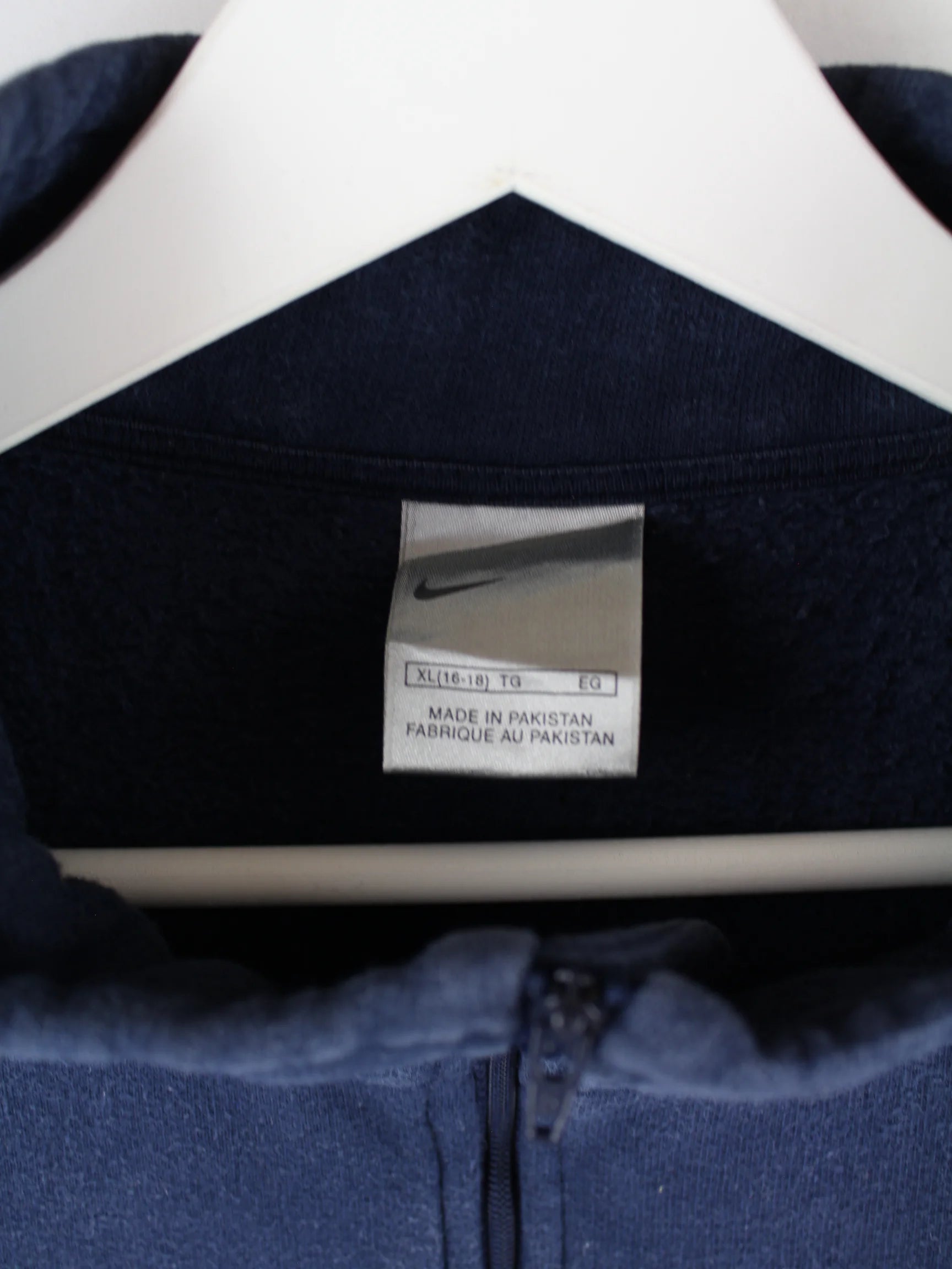 Sweater der Brand Nike mit kurzem Reißverschluß in Größe XL. Er ist aus einer Baumwollmischung produziert und in Blau zu haben.