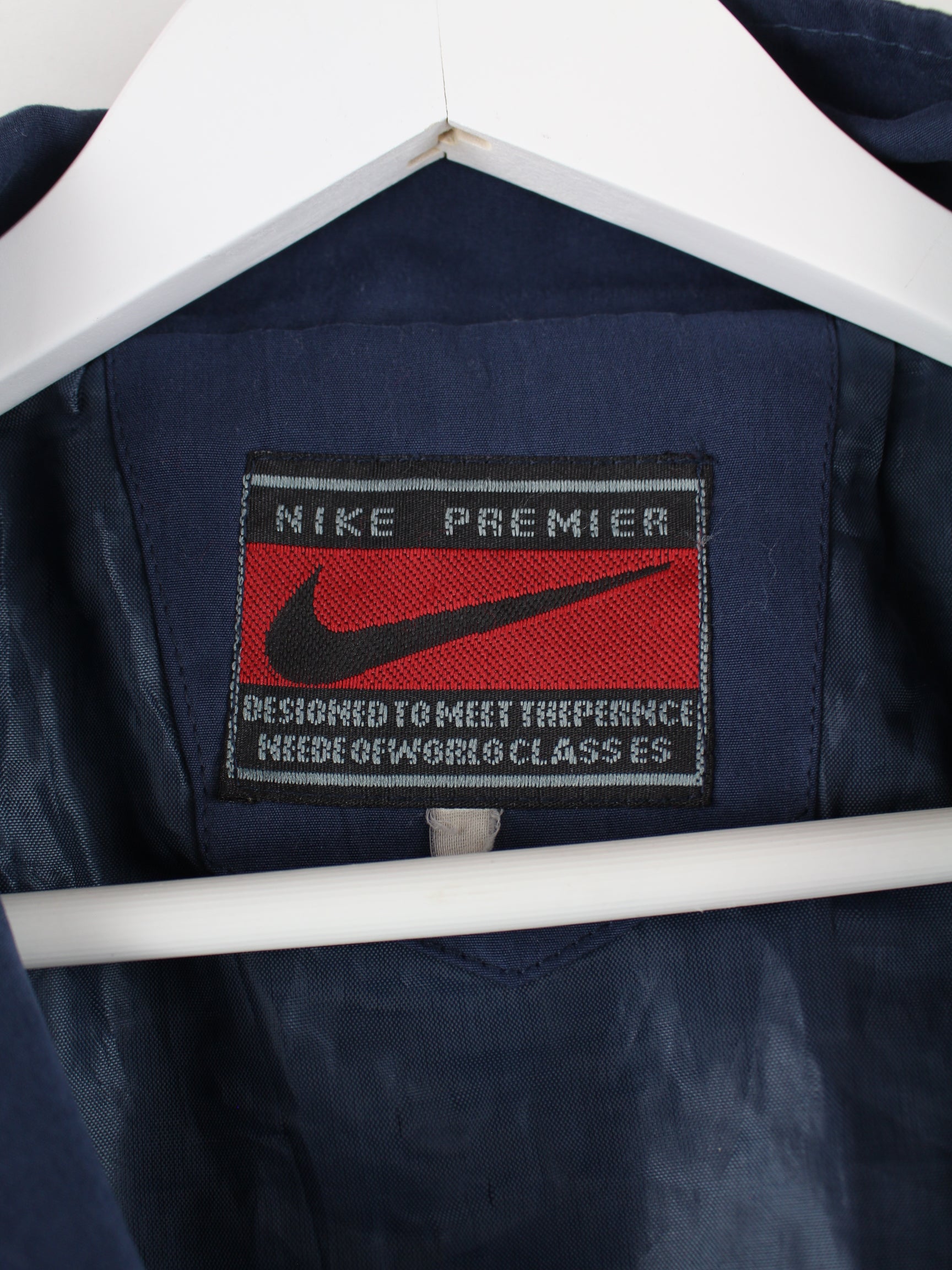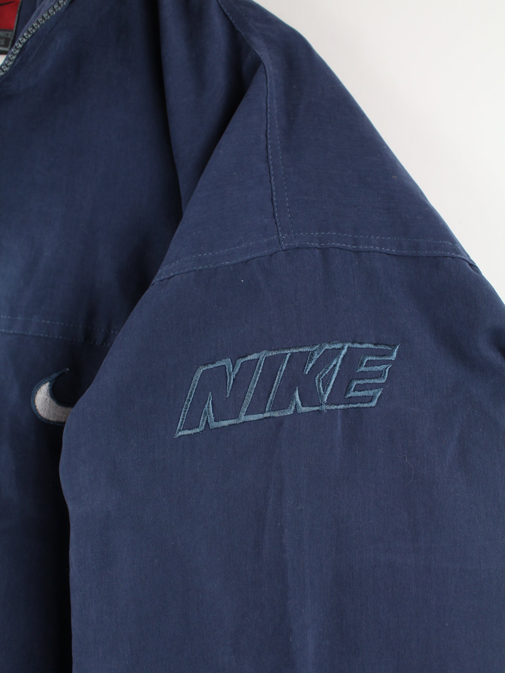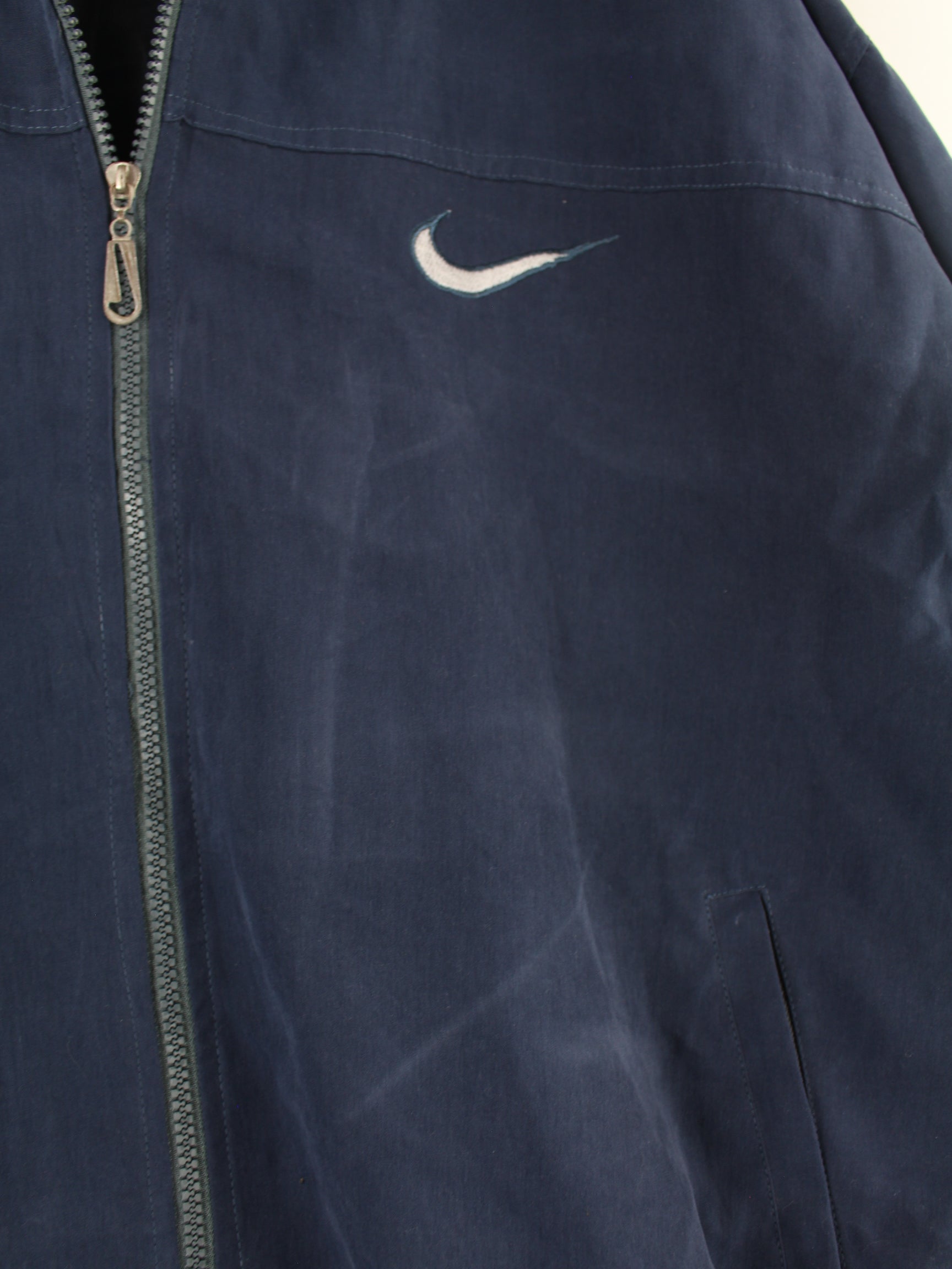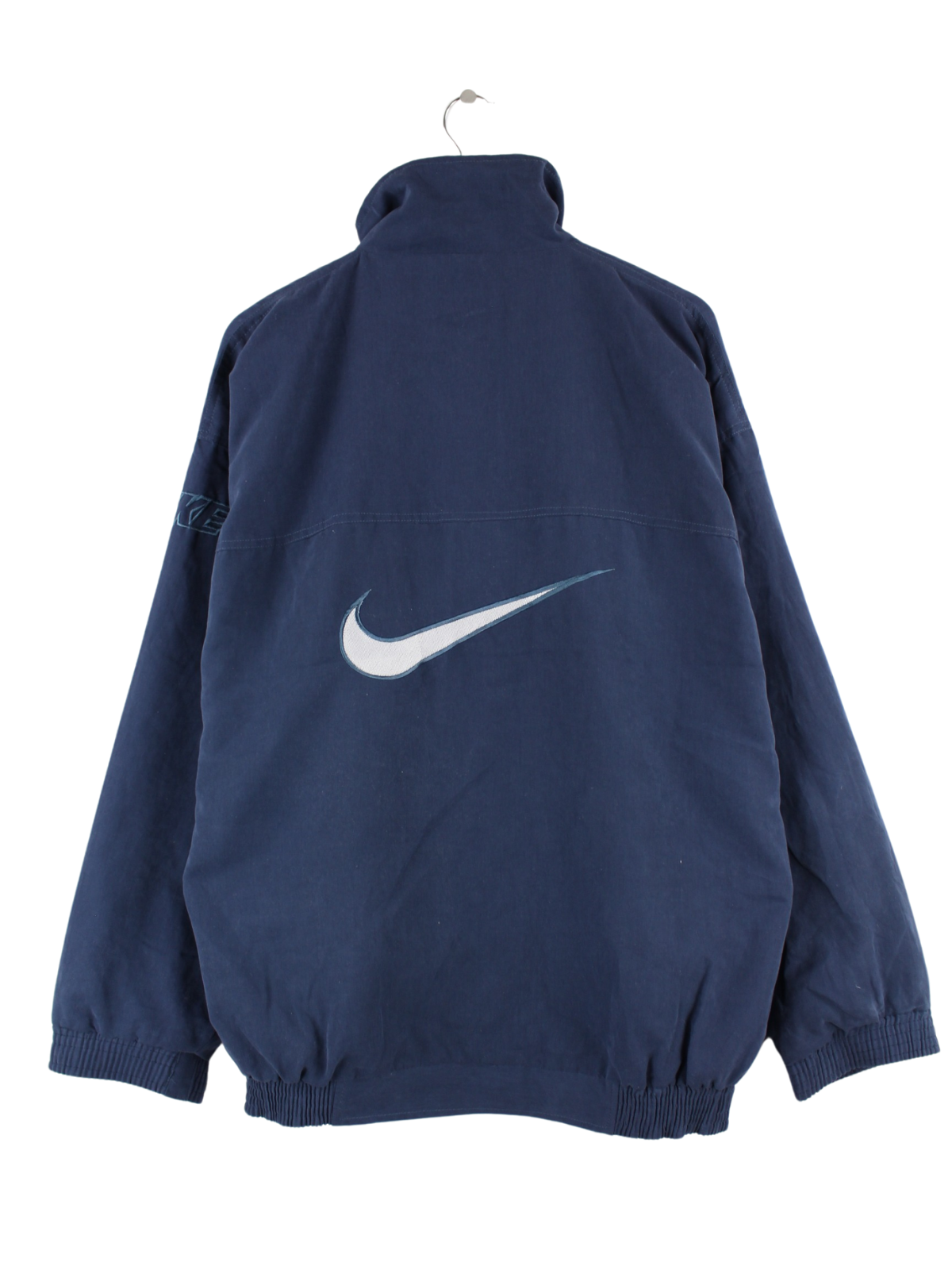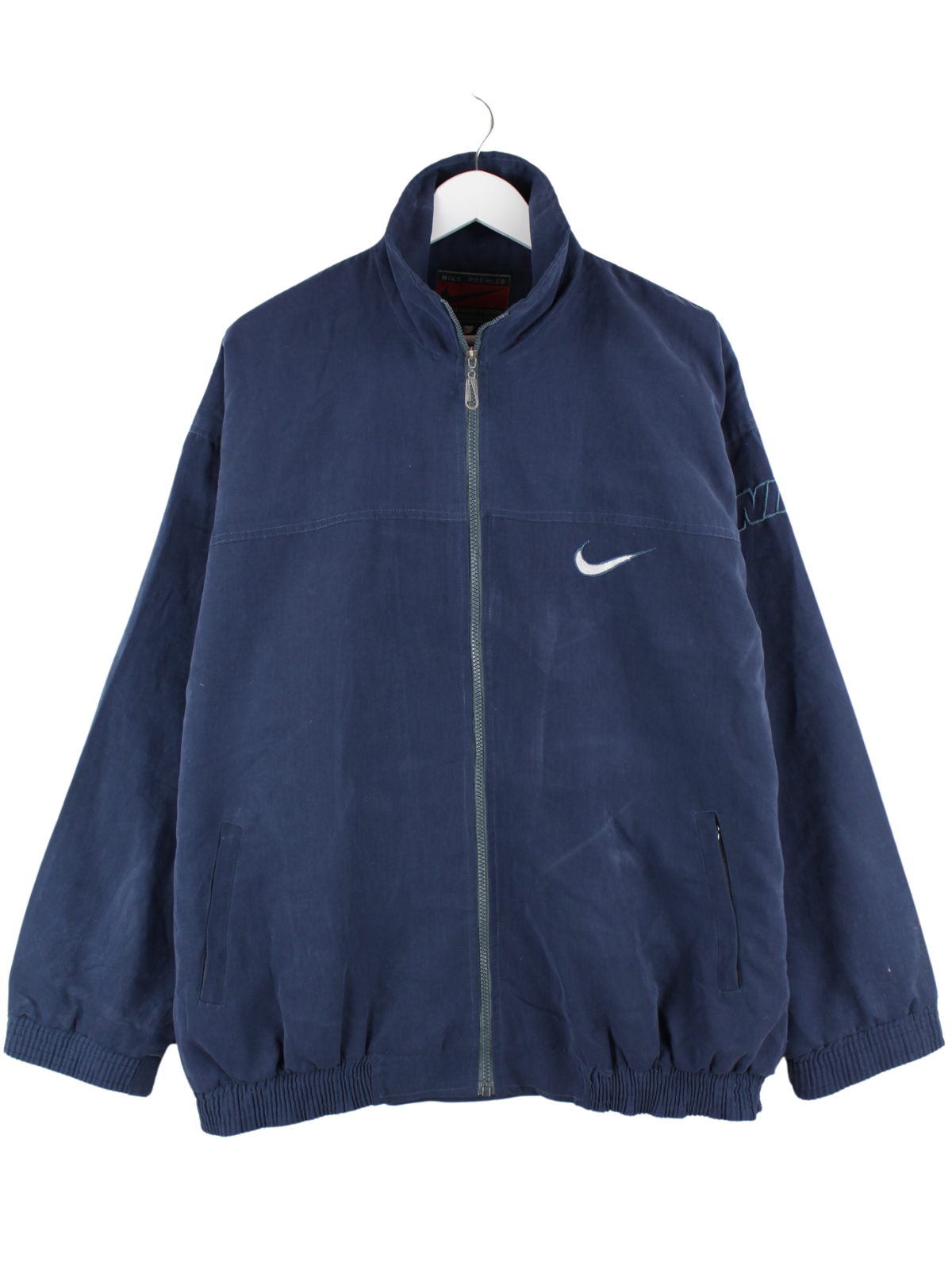 Nike training jacket with embroidery in size XL from the 80's. It is made of synthetic material and comes in blue.