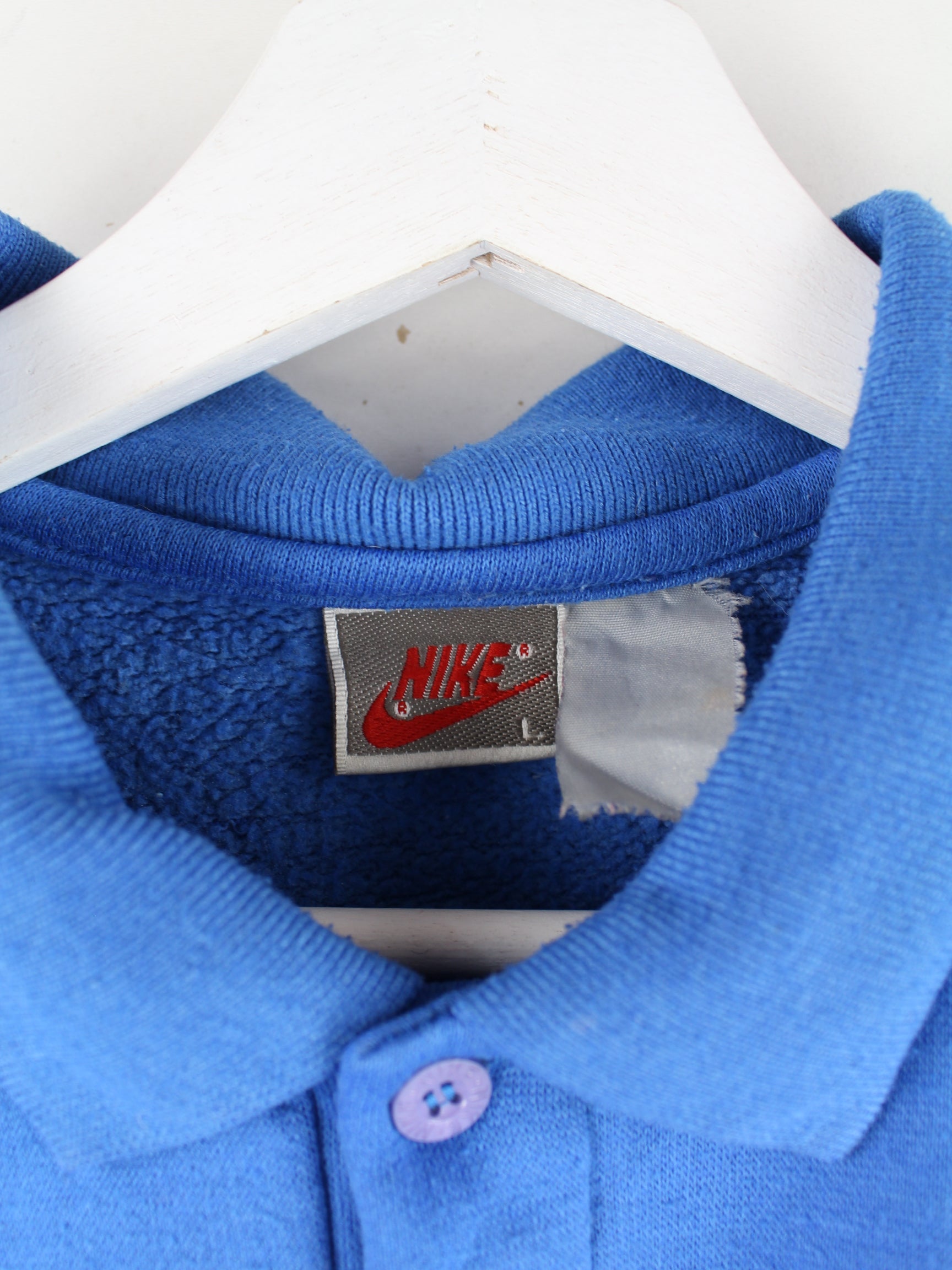 Sweater vom Brand Nike in Größe L aus den 80'ern. Er ist aus einer Baumwollmischung angefertigt und in Blau lieferbar.
