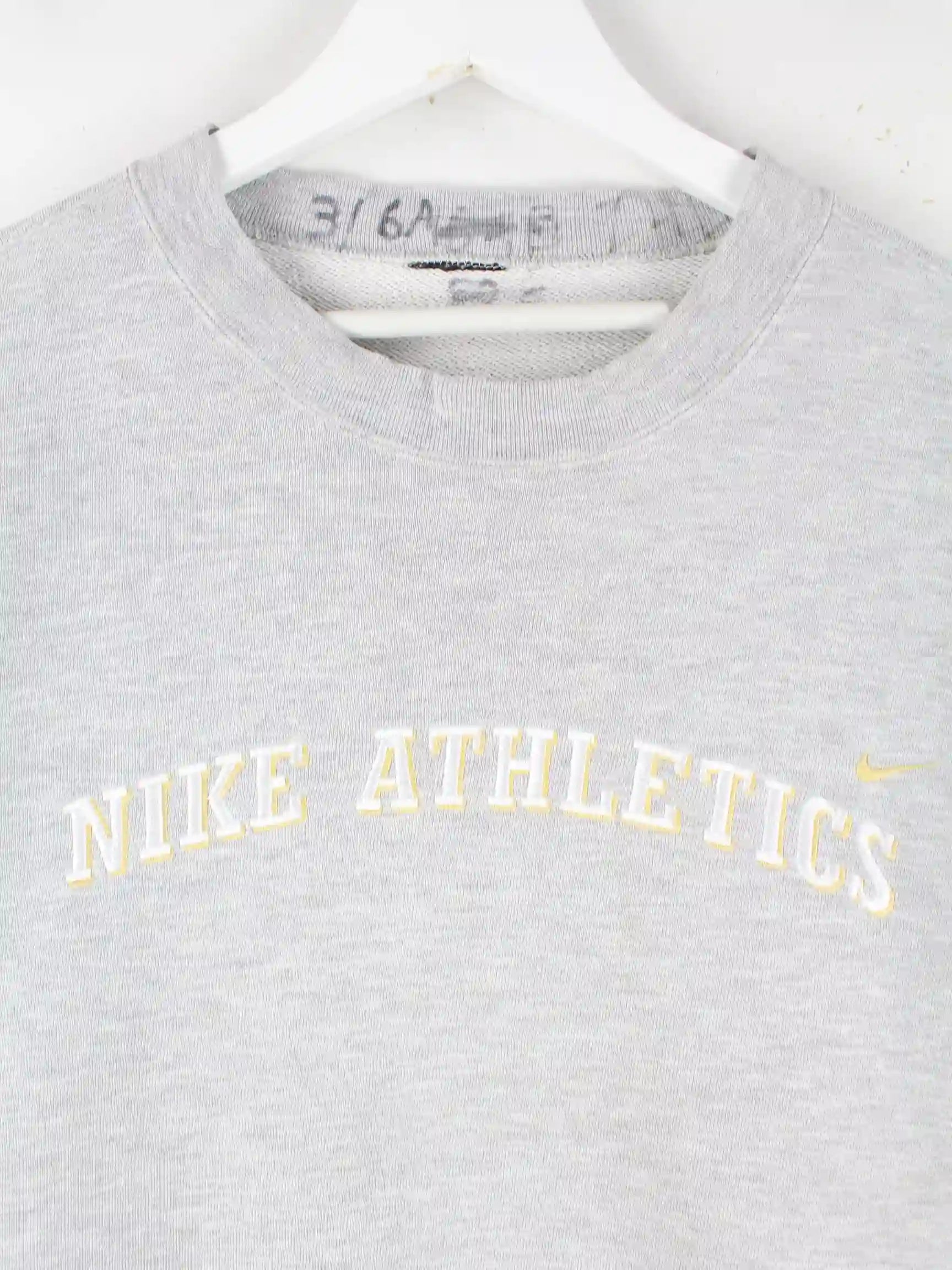 Sweater der Brand Nike mit Stick in Größe M aus den 90'ern. Er ist aus einer Baumwollmischung gefertigt und in Grau bei uns zu bekommen.