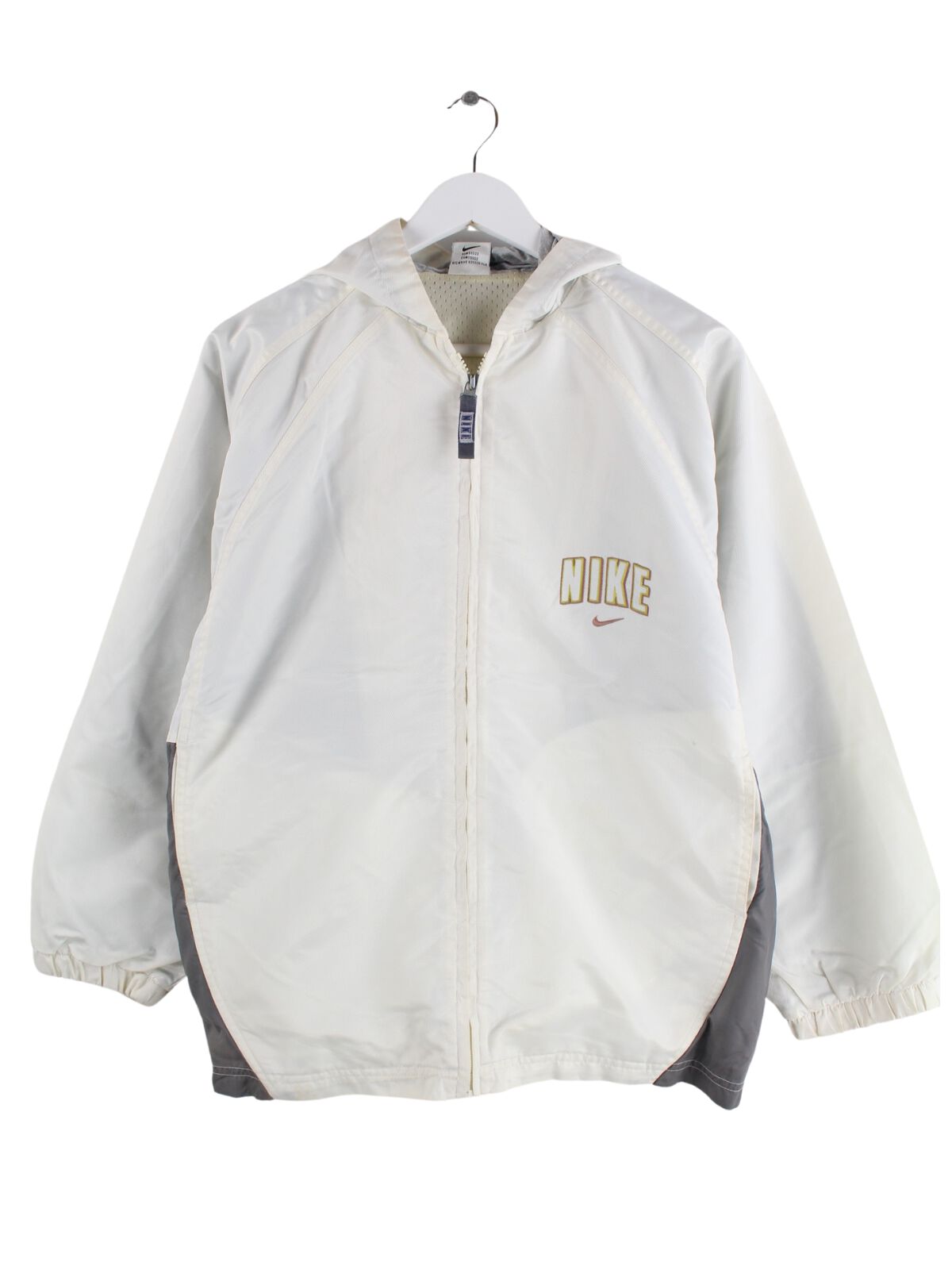 Light jacket from the Nike label in size M from the 90s. It is made of synthetic material and is available in white.
