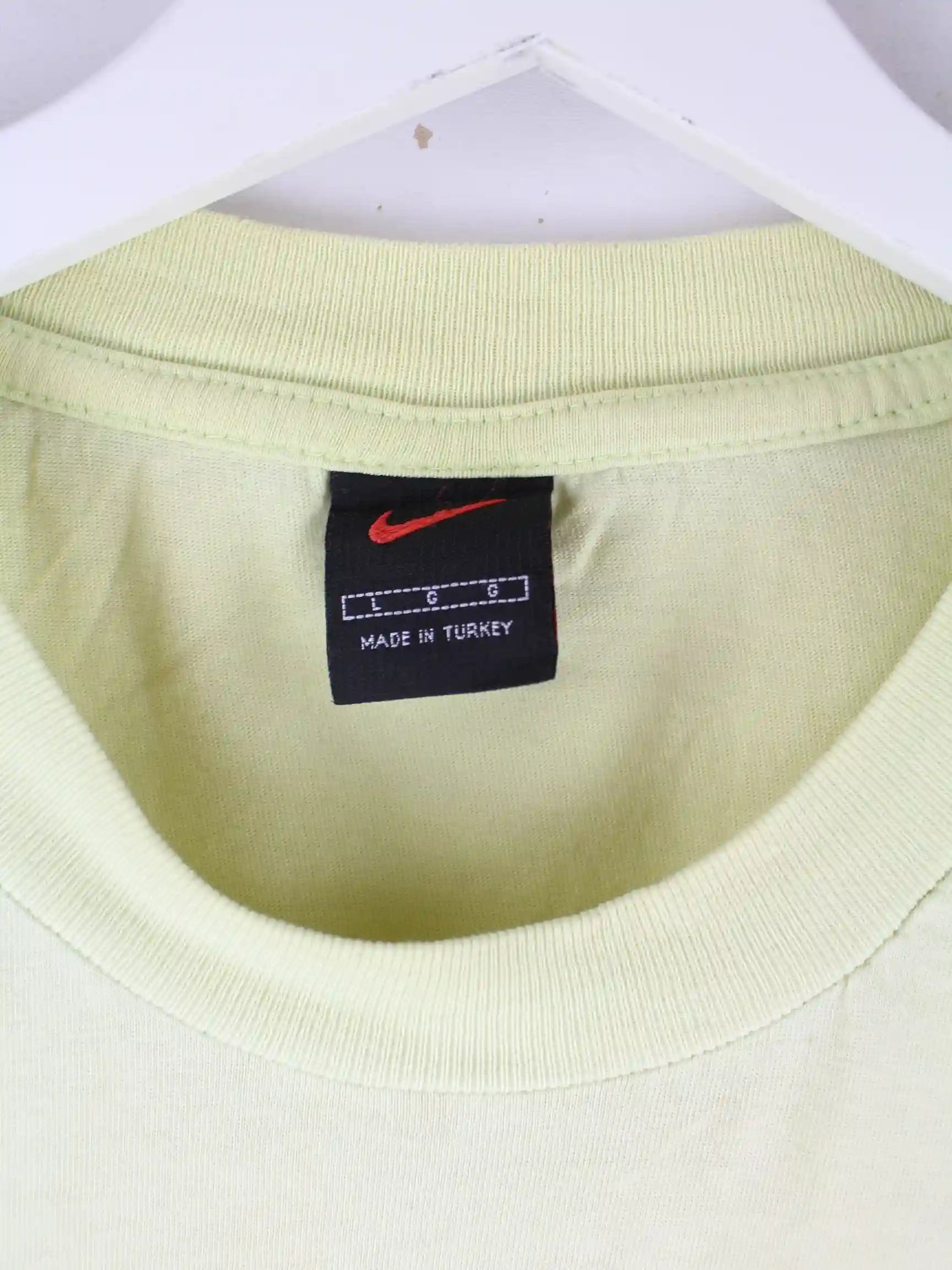 Gelbes T-Shirt vom Label Nike aus den 90'ern in Größe L. Es ist aus Baumwolle hergestellt. Den Zustand würden wir als 'In Ordnung' bezeichnen (vergl. Bilder).