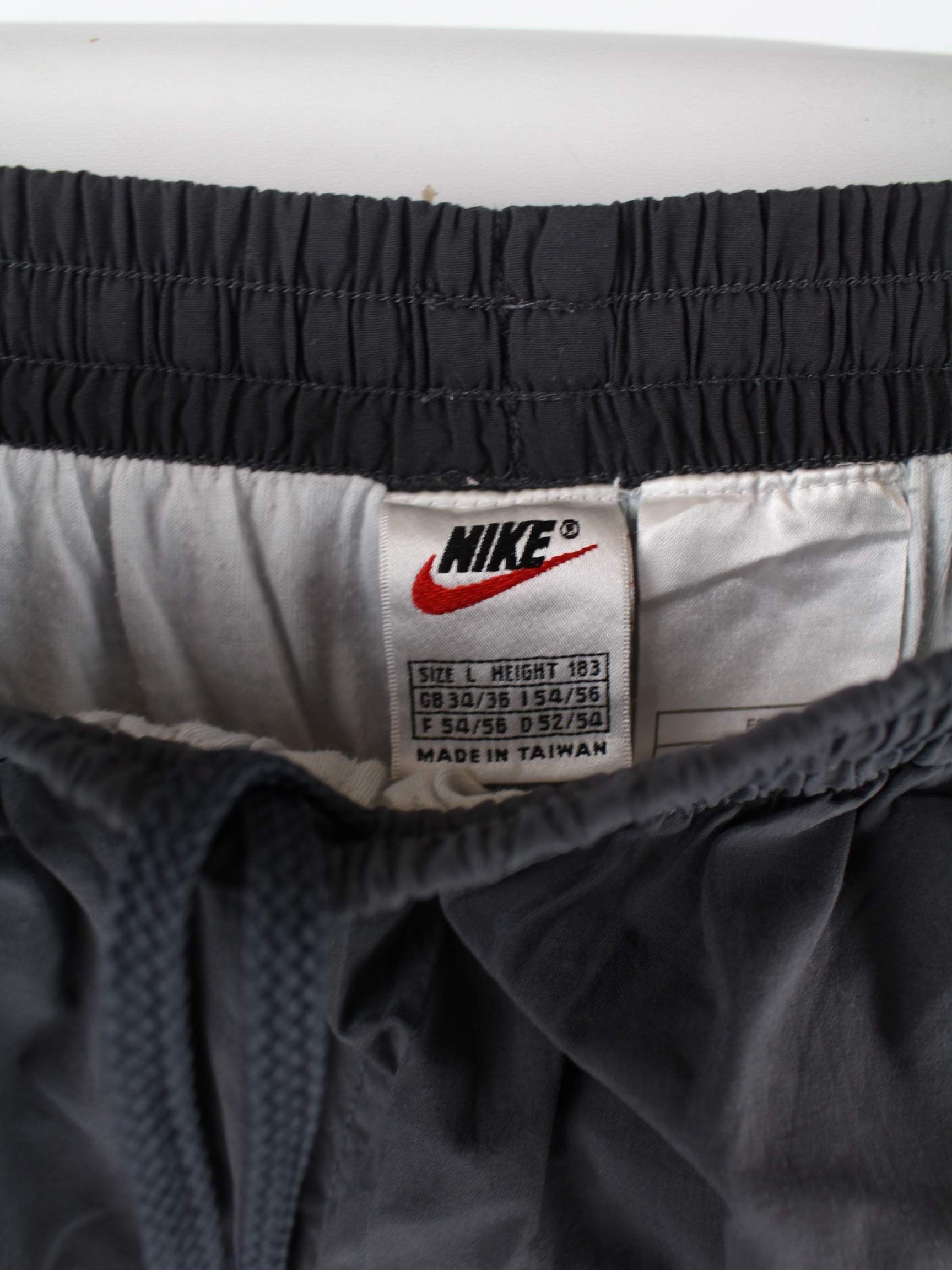 Graue Track Pants vom Label Nike aus den 90'ern in Größe L. Sie sind aus Synthetik hergestellt und in gutem Zustand zu bekommen.