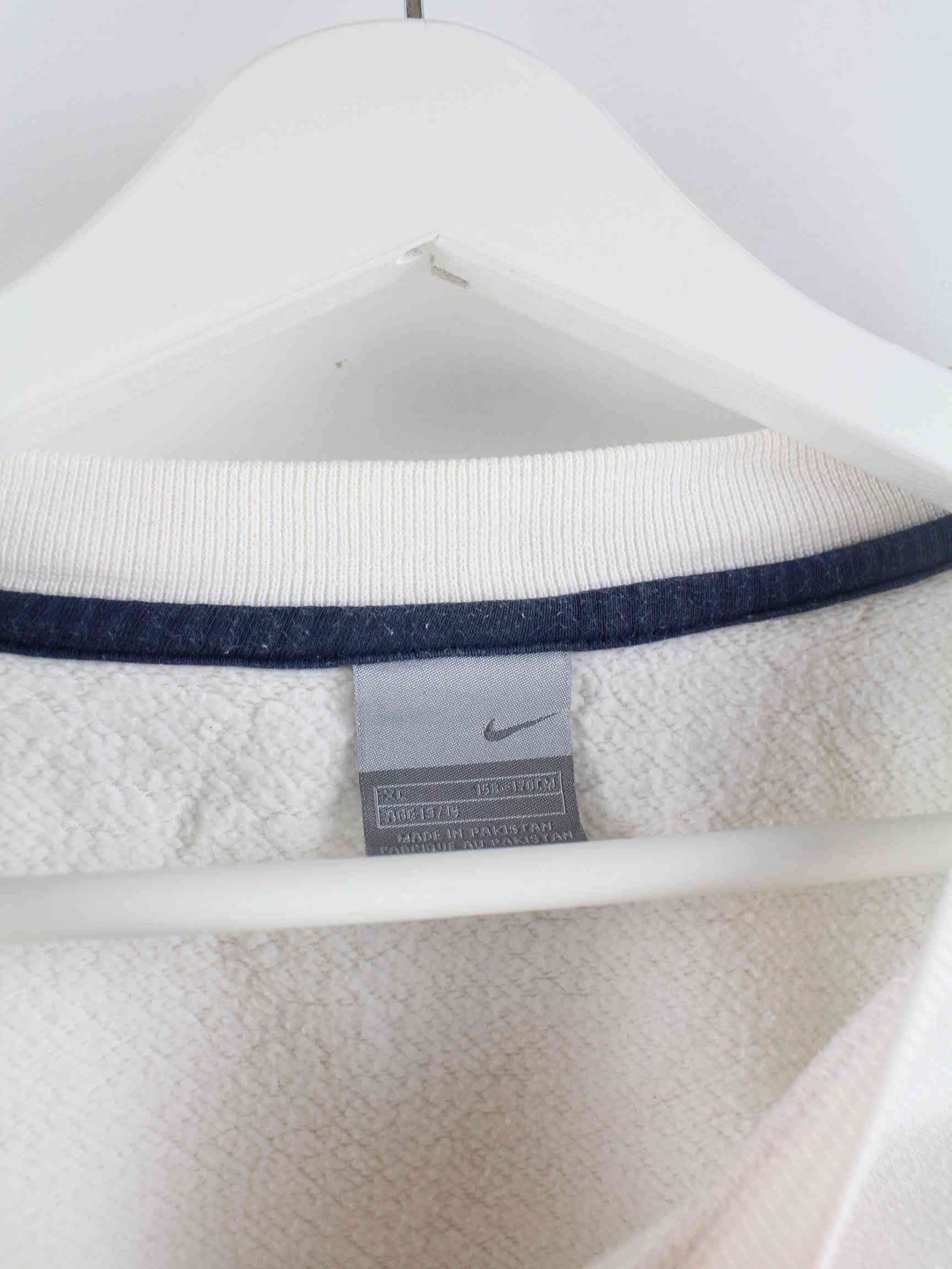 White sweater with Nike embroidery from the early 2000s in size S. It is made from a cotton blend and is available from us in good condition.
